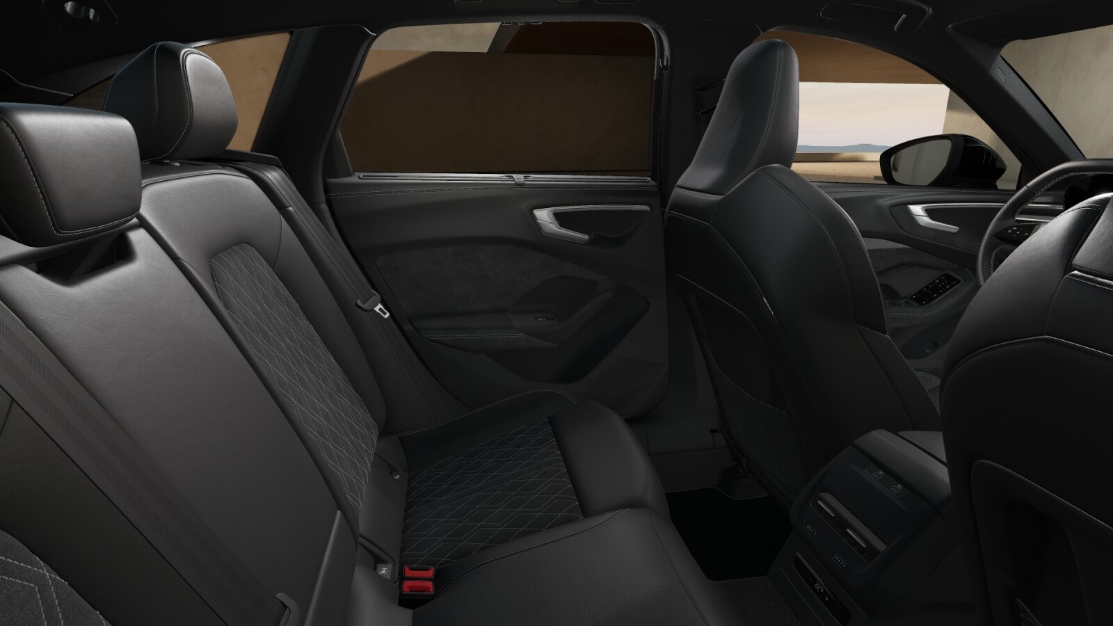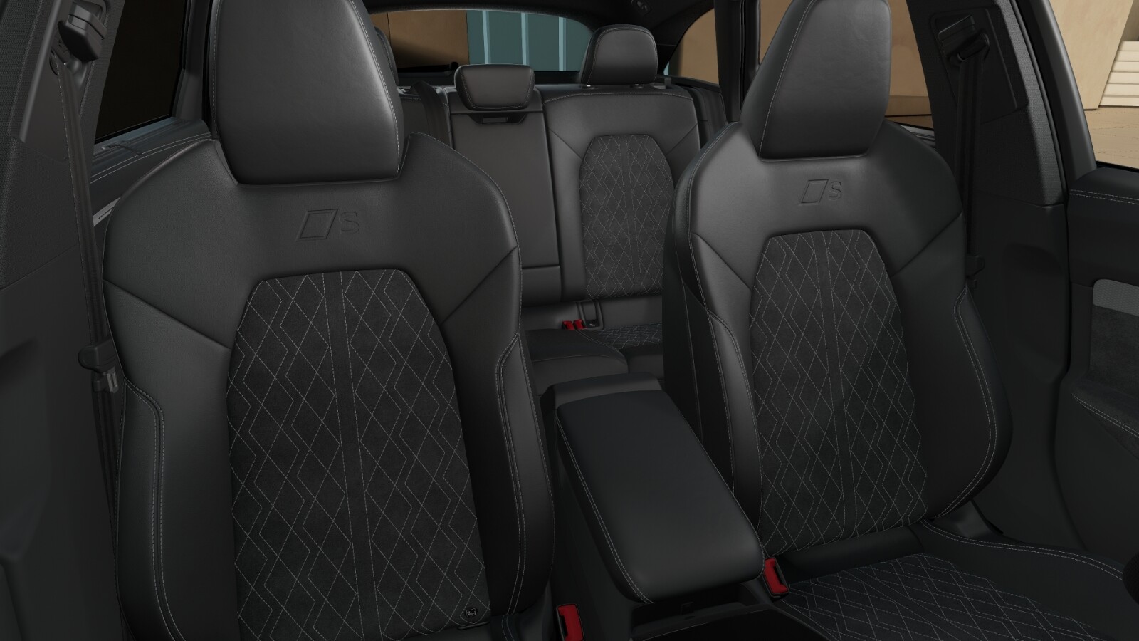 • Wnętrze z siedzeniami sportowymi, kombinacja mikrofibra Dinamica/skóra w kolorze czarnym, czerwony szew Audi Sport GmbH