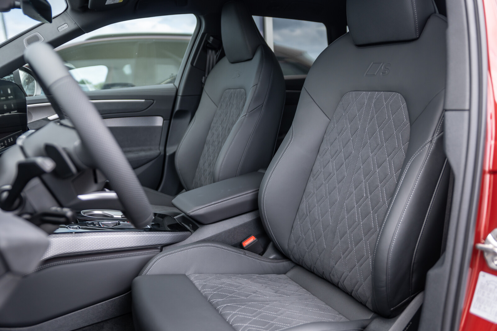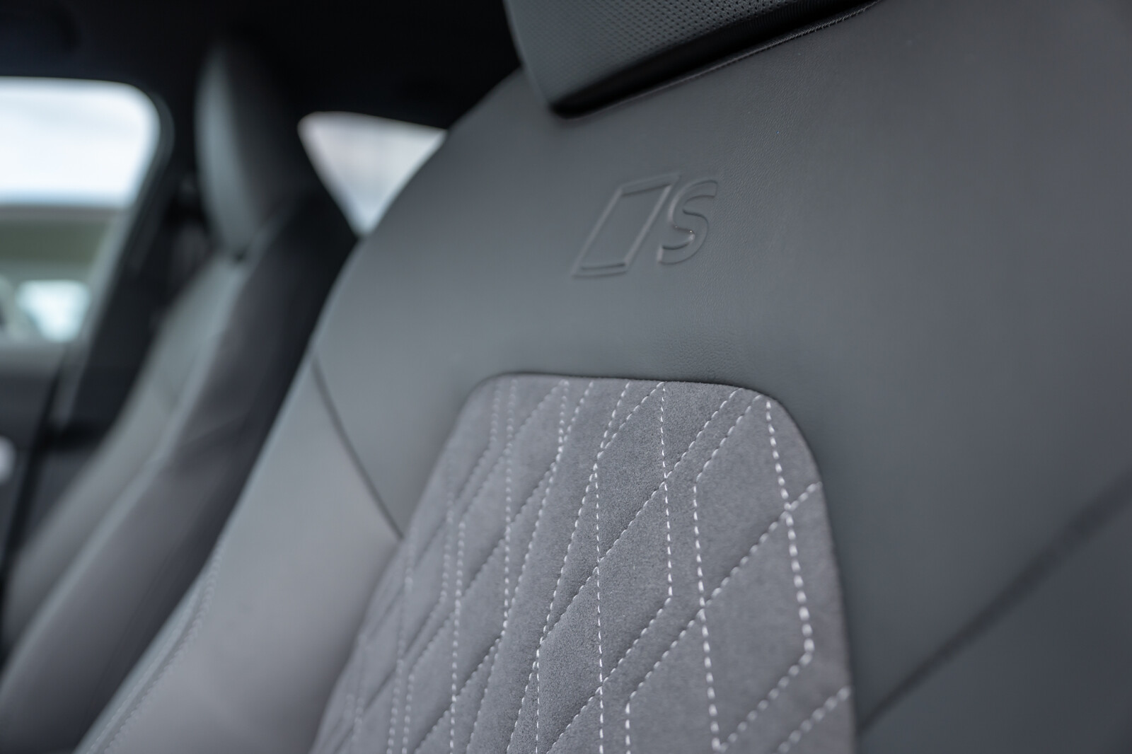 • środkowe części siedzeń obszyte czarną mikrofibrą Dinamica¹ z pikowaniem w romby, boki siedzeń obszyte czarną skórą, zagłówki pokryte czarną skórą ekologiczną, kontrastowy szew, emblematy S na oparciach przednich siedzeń (tapicerka tylnych siedzeń dopasowana wizualnie do siedzeń przednich)