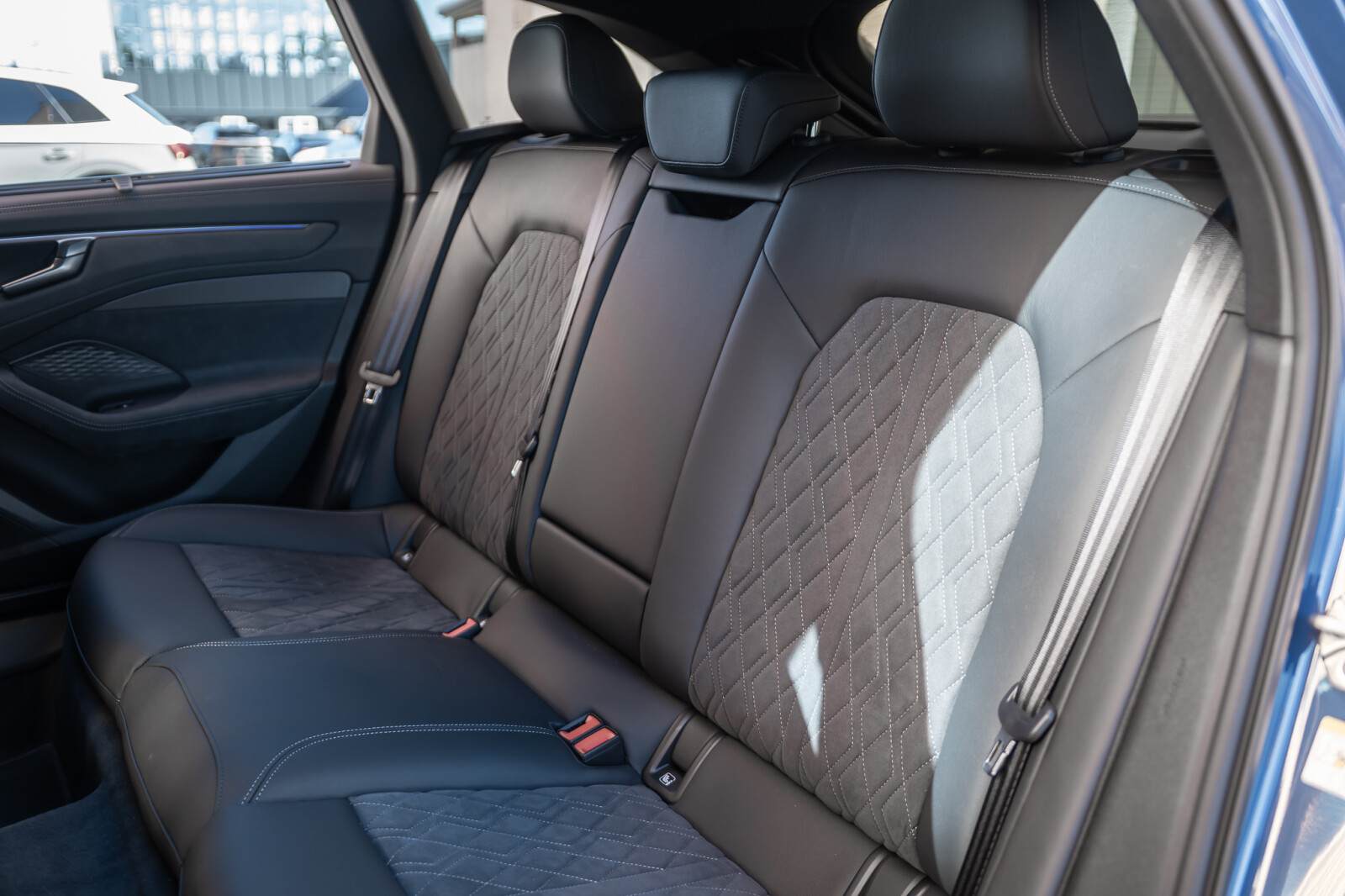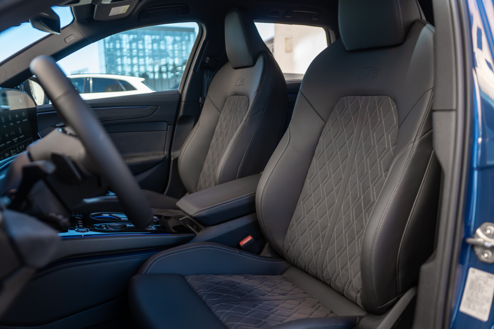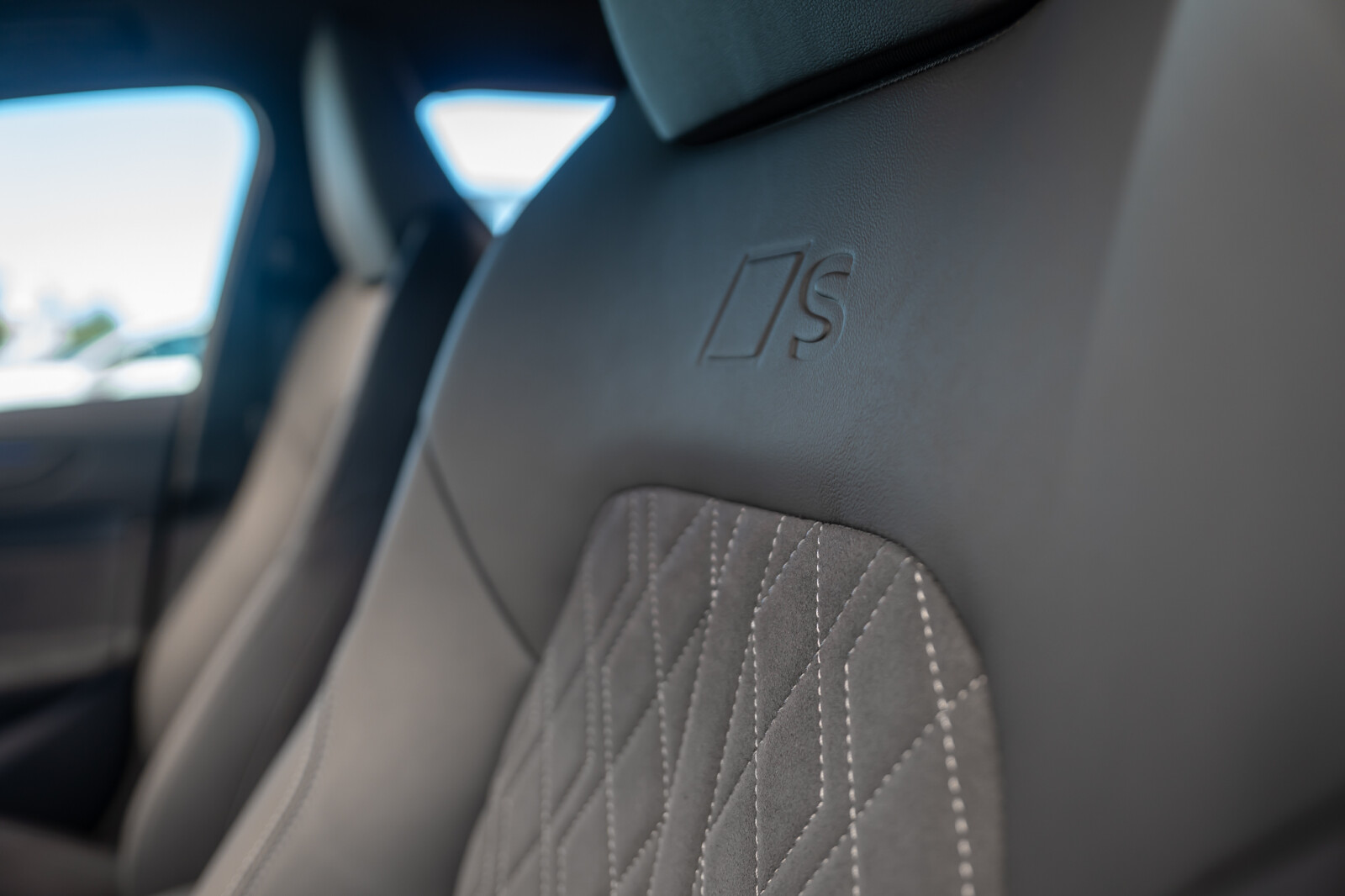 • środkowe części siedzeń obszyte czarną mikrofibrą Dinamica¹ z pikowaniem w romby, boki siedzeń obszyte czarną skórą, zagłówki pokryte czarną skórą ekologiczną, kontrastowy szew, emblematy S na oparciach przednich siedzeń (tapicerka tylnych siedzeń dopasowana wizualnie do siedzeń przednich)