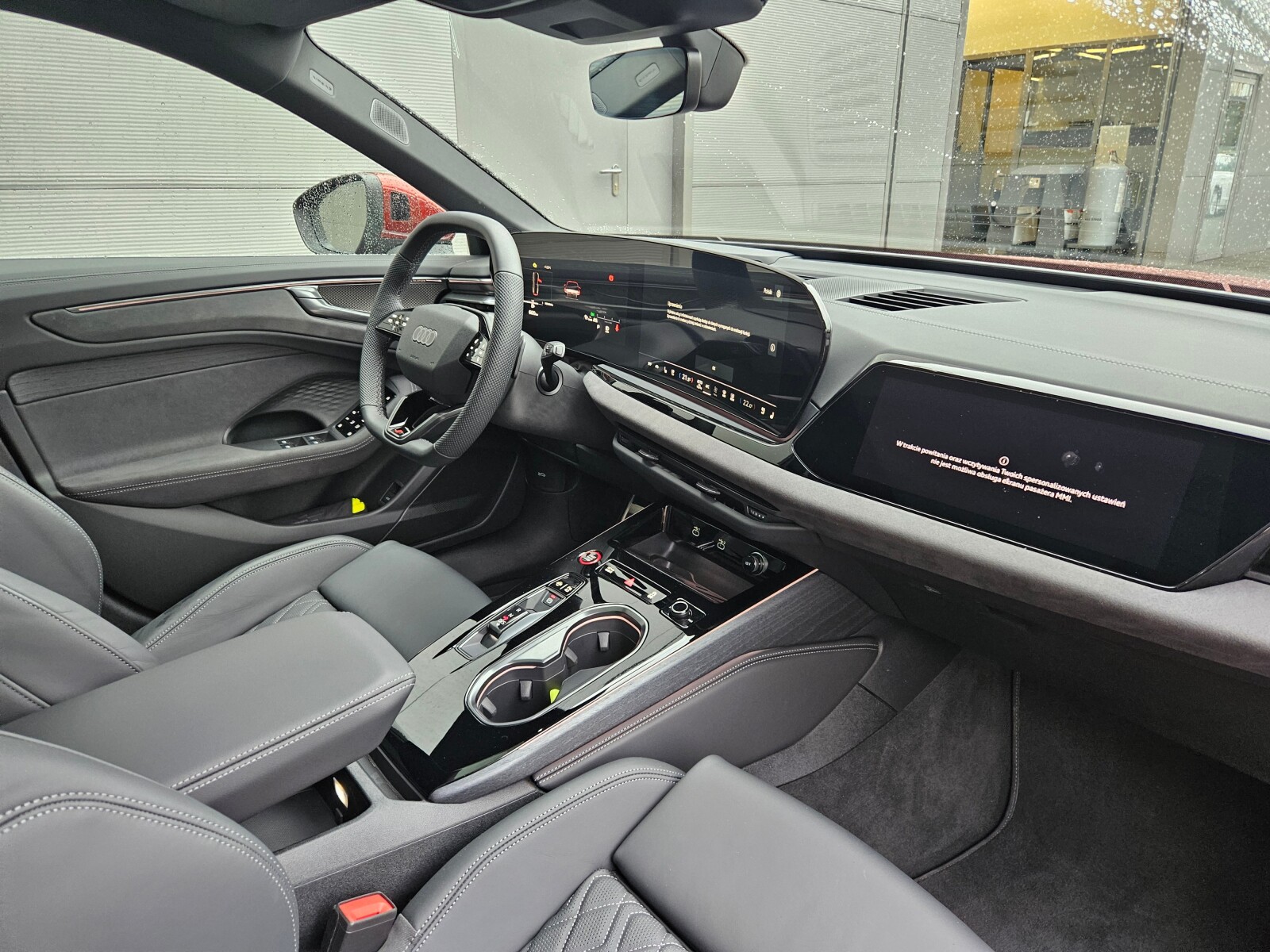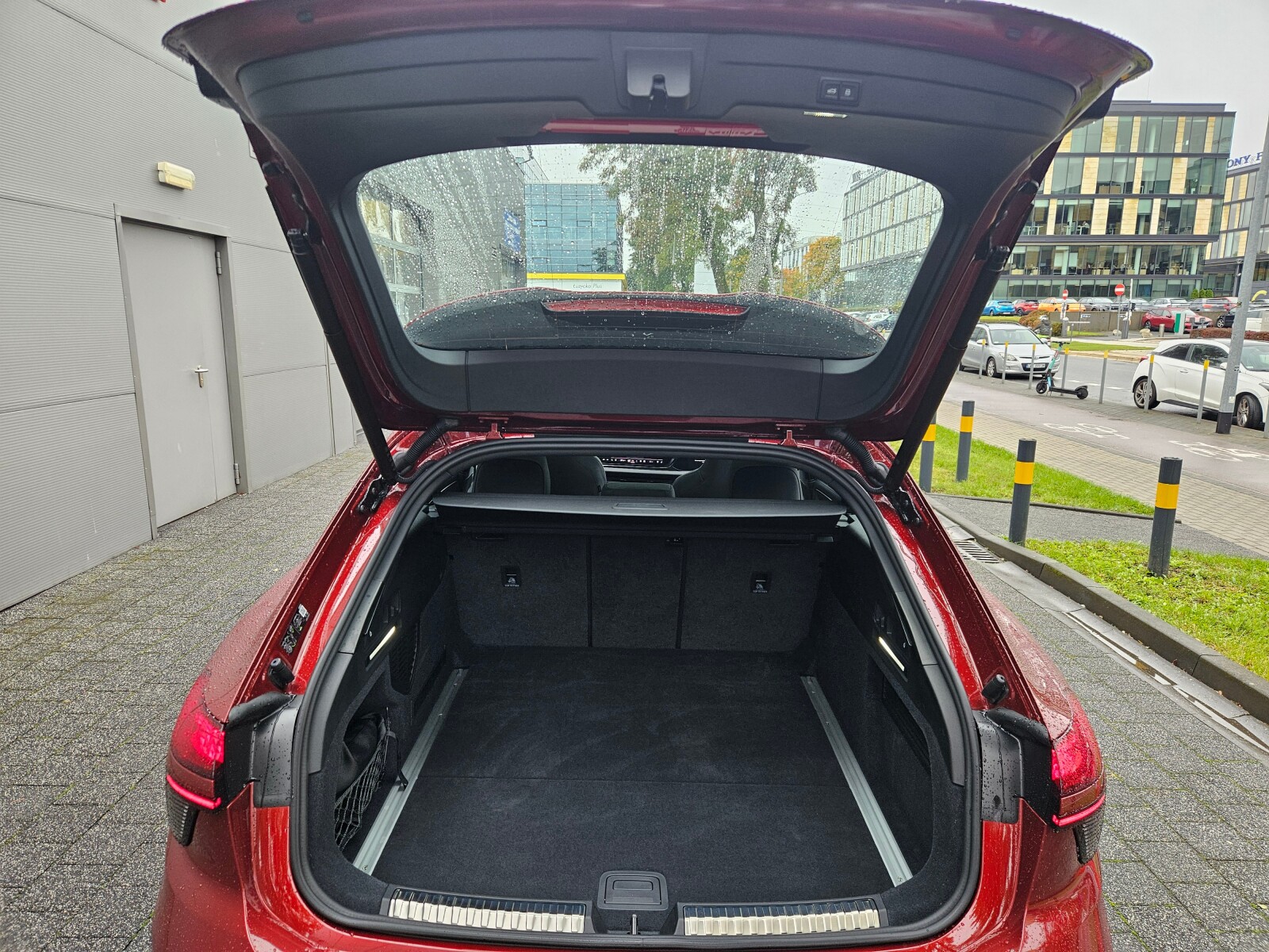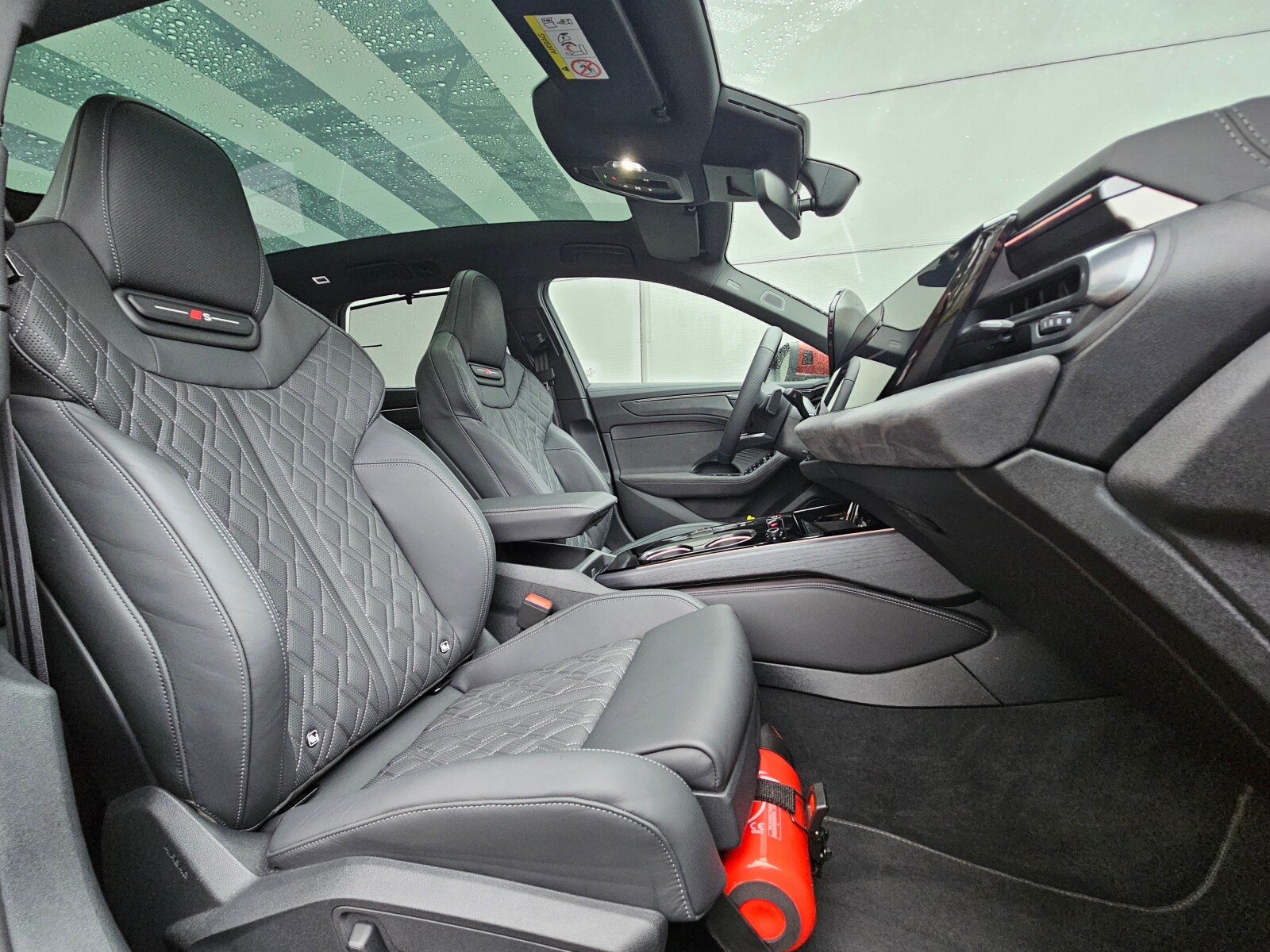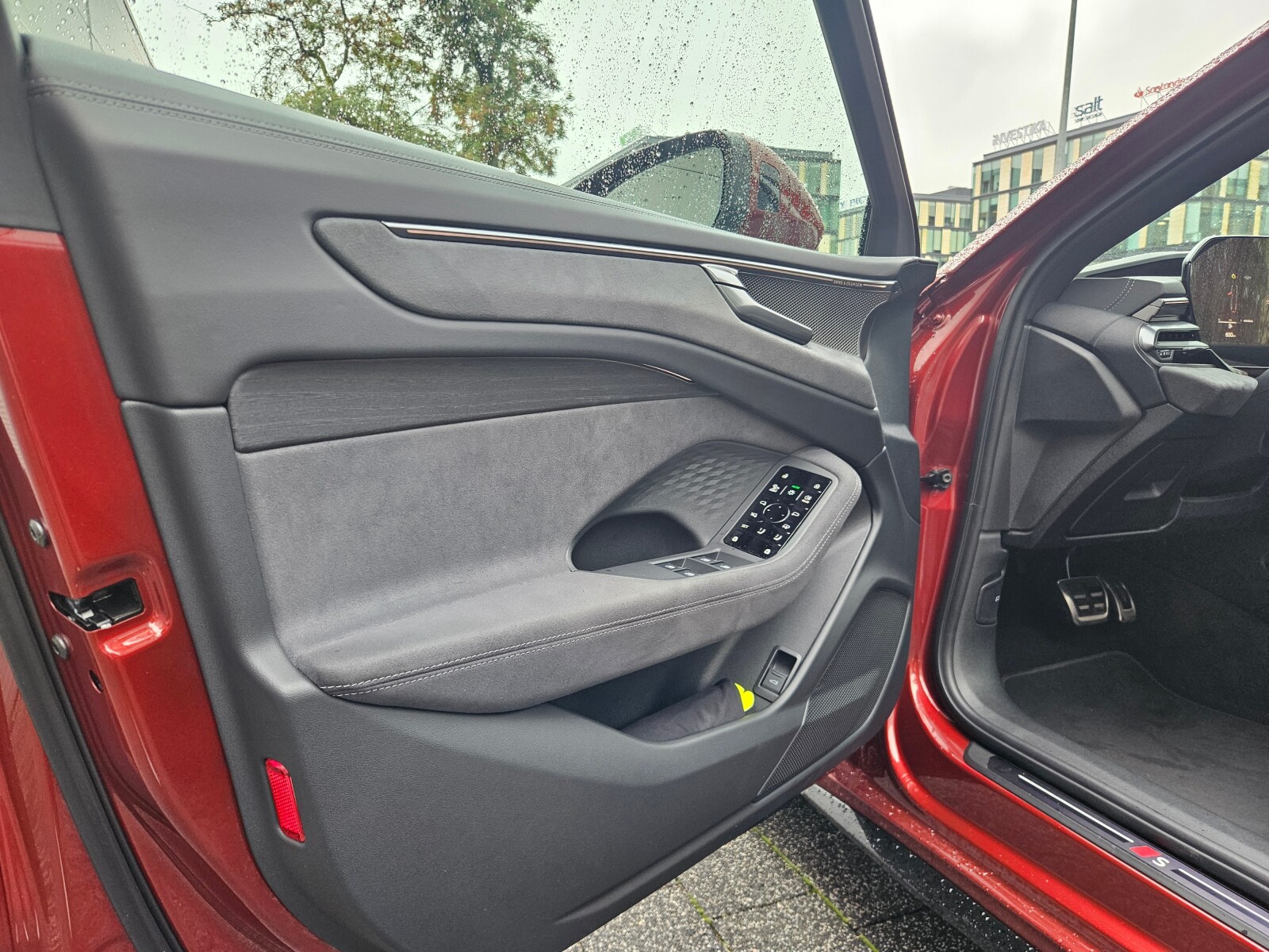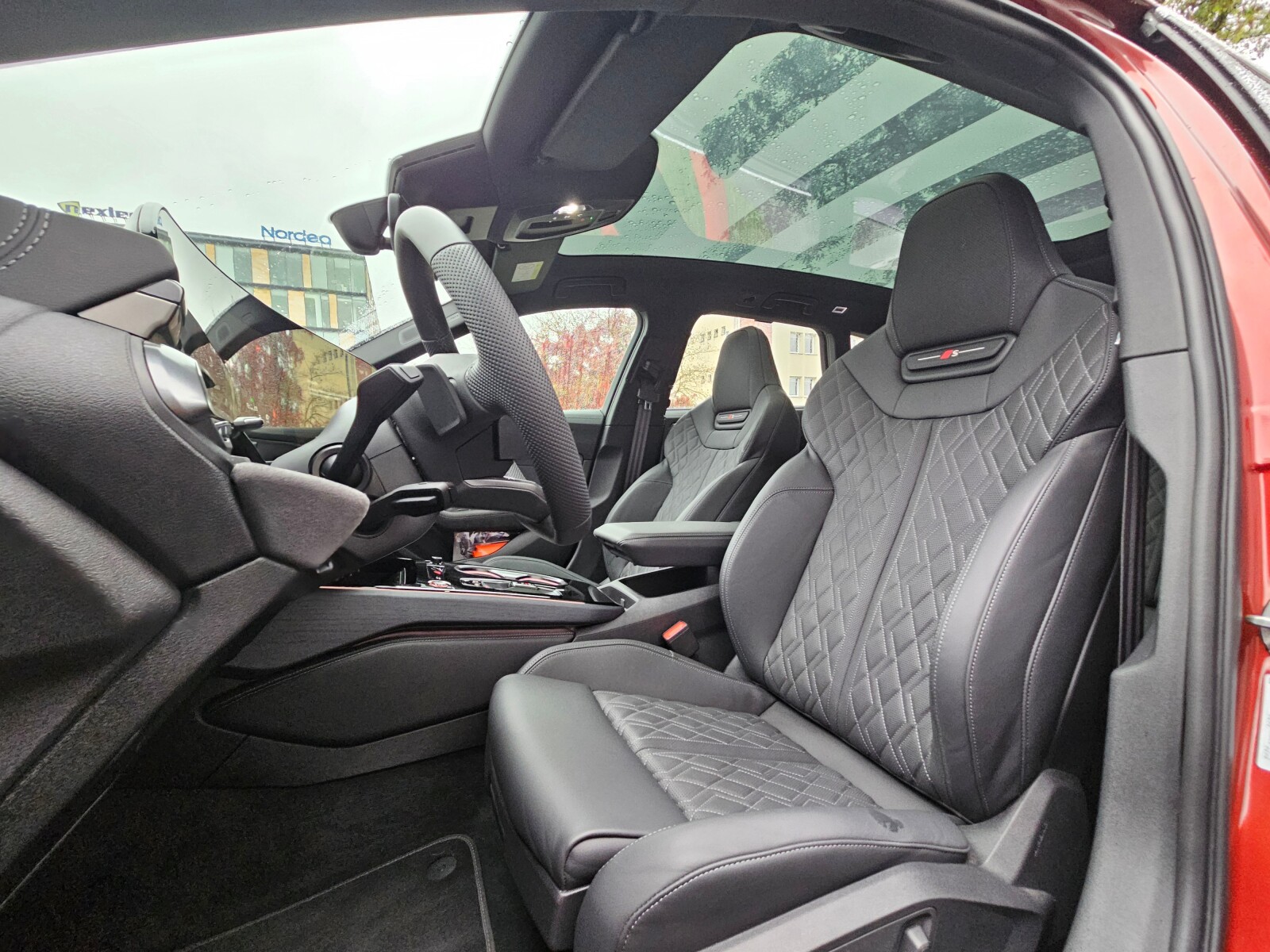• przednie siedzenia sportowe plus z wentylacją, wizualnie zintegrowanymi zagłówkami i wyprofilowanymi bokami, poprawiającymi stabilność na zakrętach, dekoracyjny segment z podświetlonym emblematem S w górnej części oparcia, manualnie wysuwane podparcie pod uda