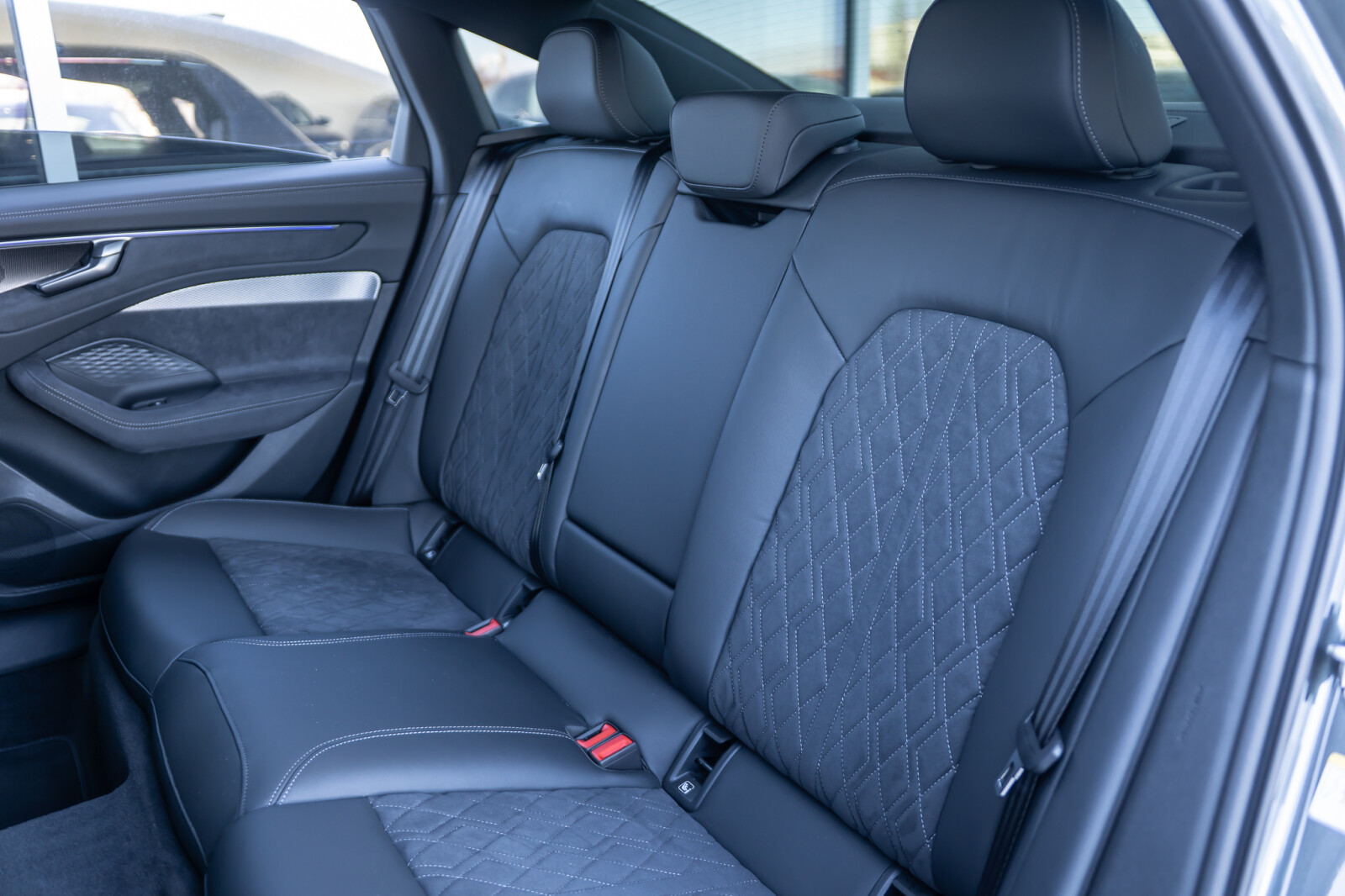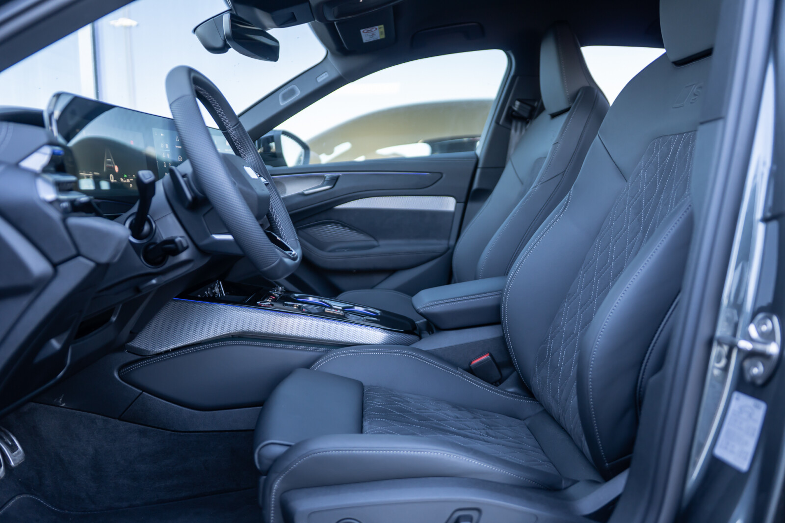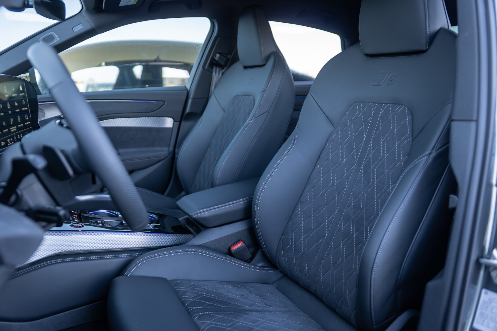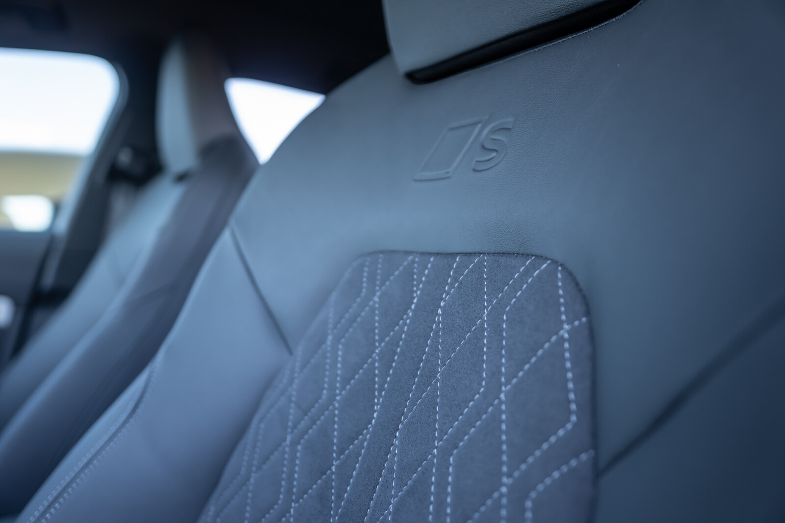 • środkowe części siedzeń obszyte czarną mikrofibrą Dinamica¹ z pikowaniem w romby, boki siedzeń obszyte czarną skórą, zagłówki pokryte czarną skórą ekologiczną, kontrastowy szew, emblematy S na oparciach przednich siedzeń (tapicerka tylnych siedzeń dopasowana wizualnie do siedzeń przednich)