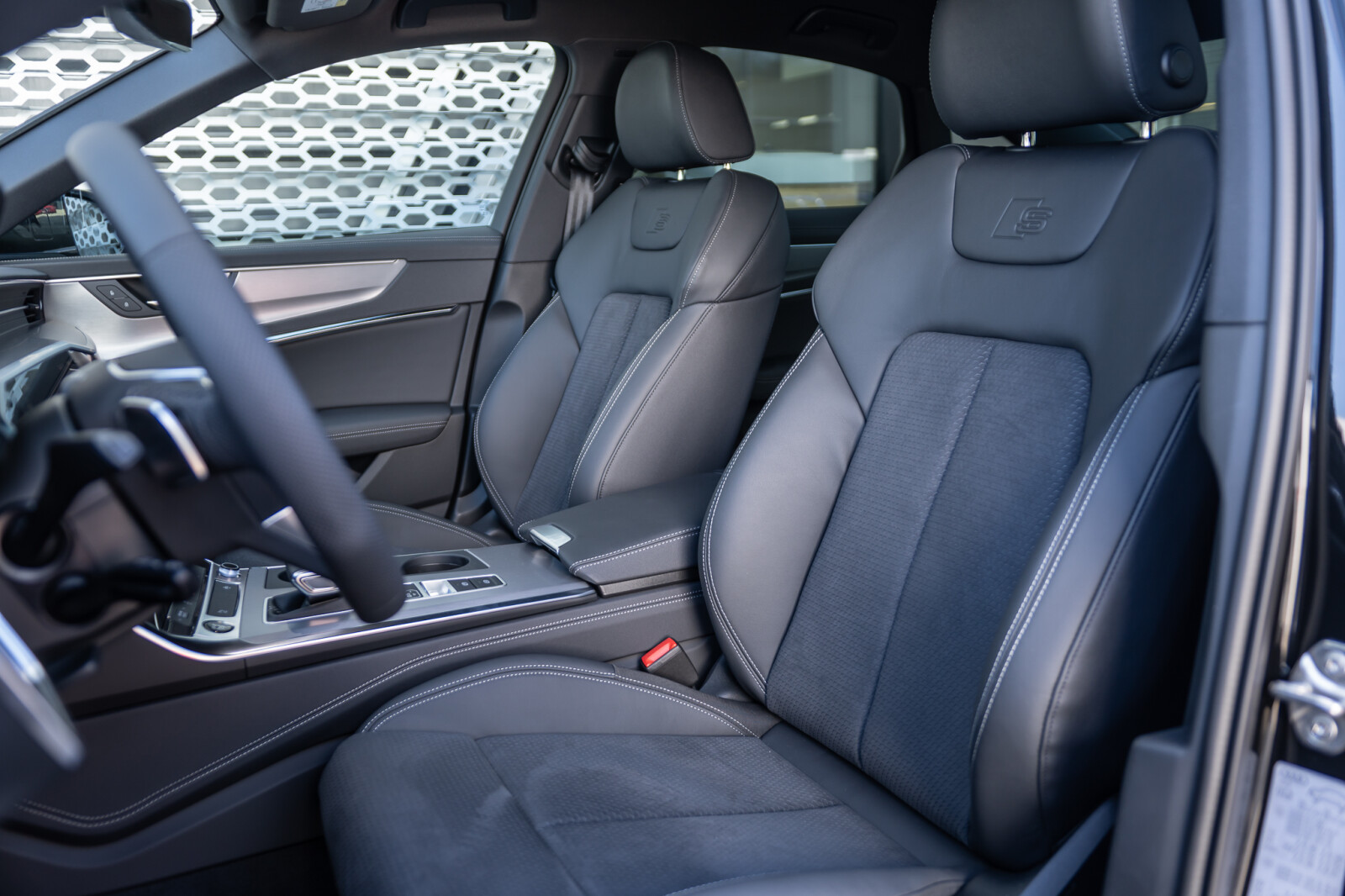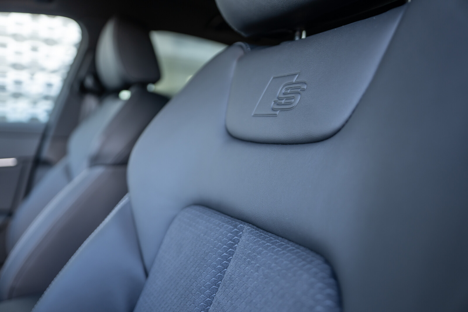• Tapicerka z kombinacji tkaniny Sequenz/skóry z wytłoczonym logo S na oparciach przednich siedzeń