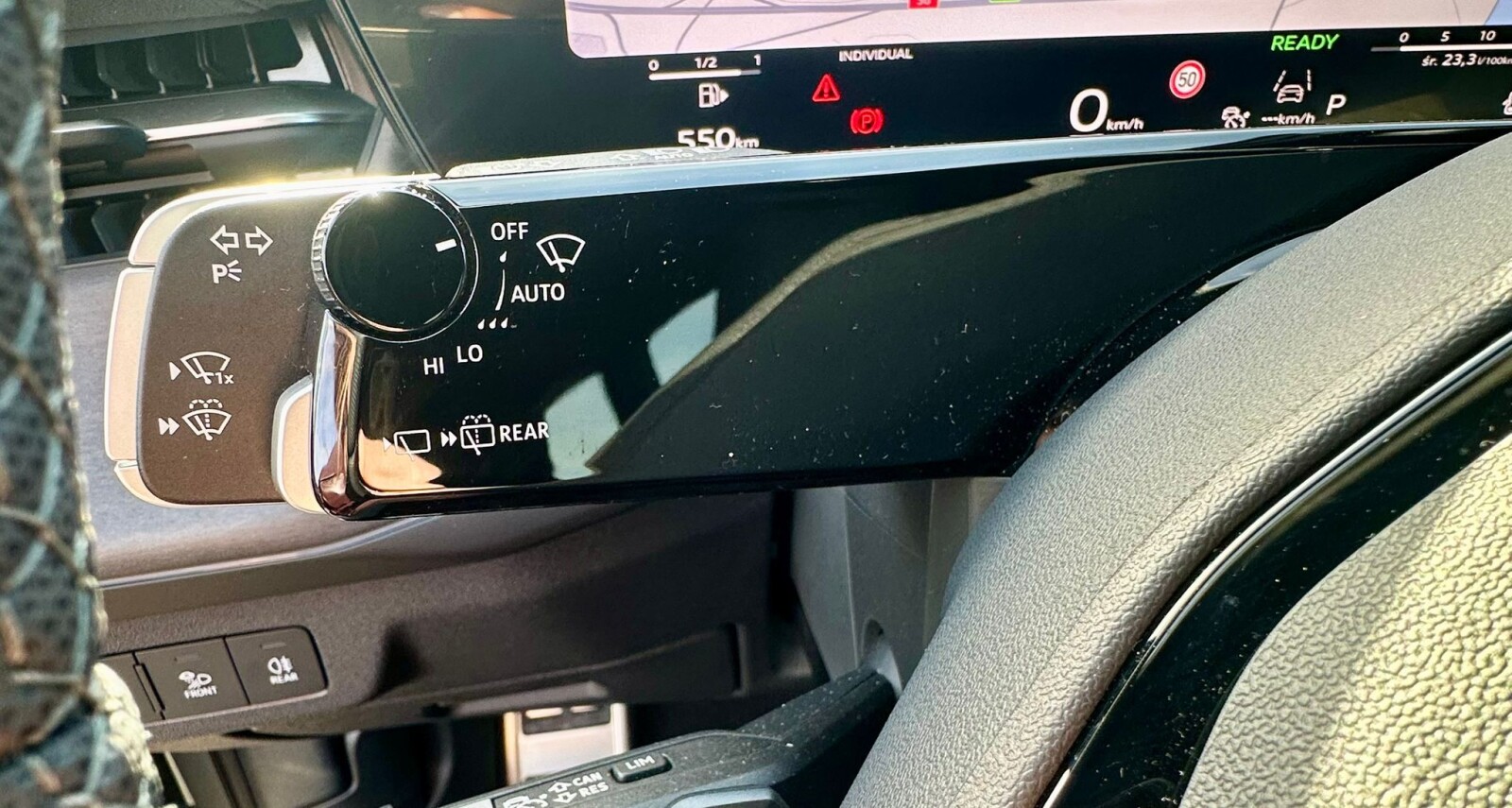 – Kierownica sportowa, 3-ramienna, spłaszczona u dołu i na górze, wielofunkcyjna, z przełącznikami zmiany przełożenia, bez elementów ze skóry naturalnej