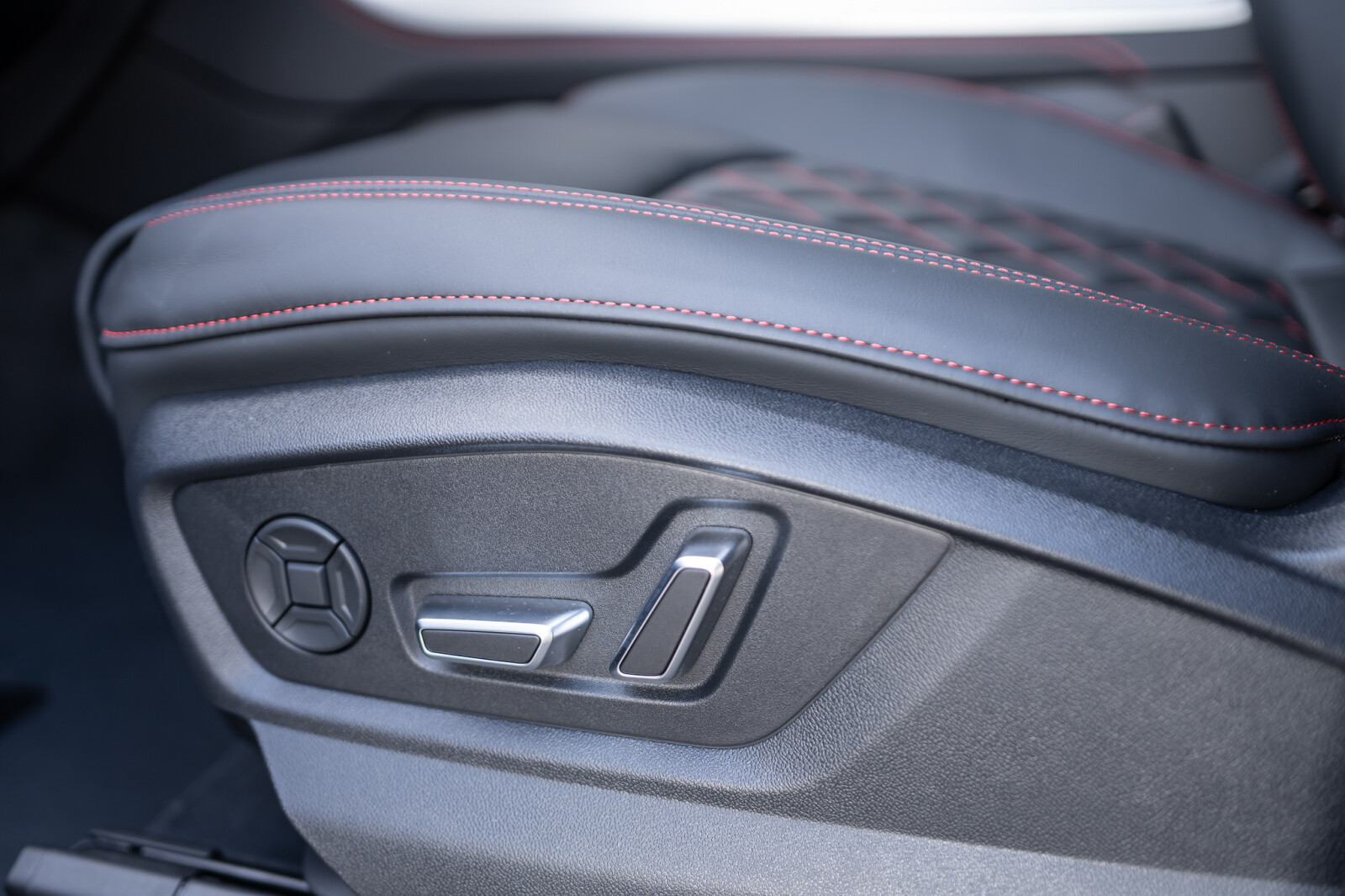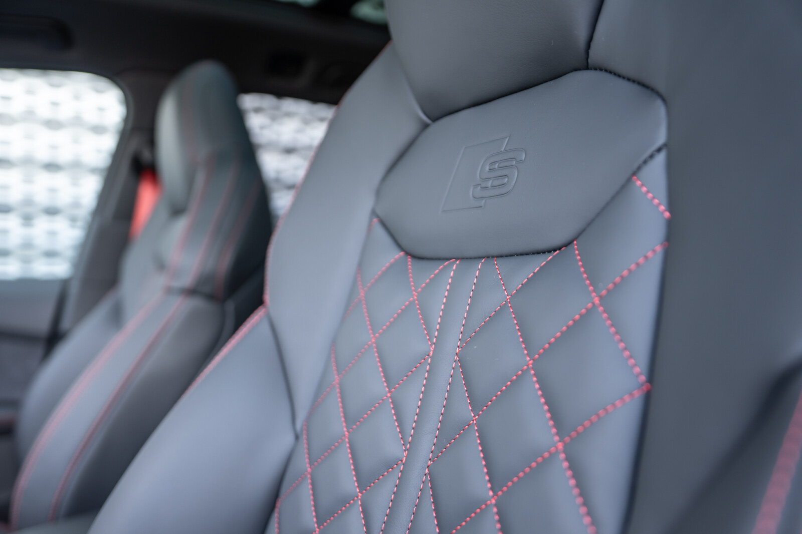 • tapicerka z kombinacji mikrofibry Dinamica Frequenz/skóry w kolorze czarnym z kontrastowym szwem i wytłoczonym logo S w oparciach przednich siedzeń