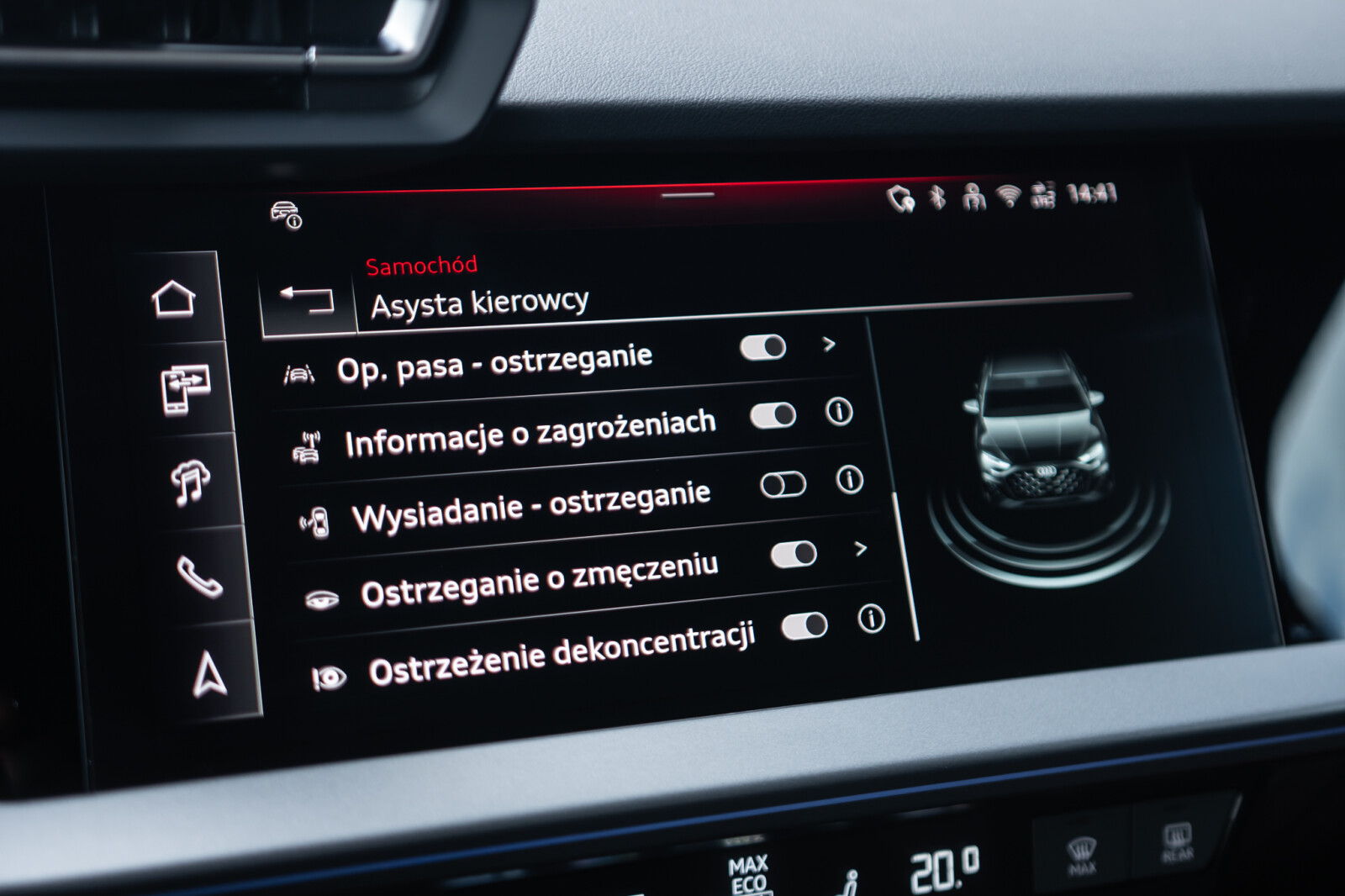 • Funkcja ostrzegającą przy zmianie pasa ruchu wraz z ostrzeżeniem przy wysiadaniu i asystentem ruchu przecinającego tor jazdy z tyłu