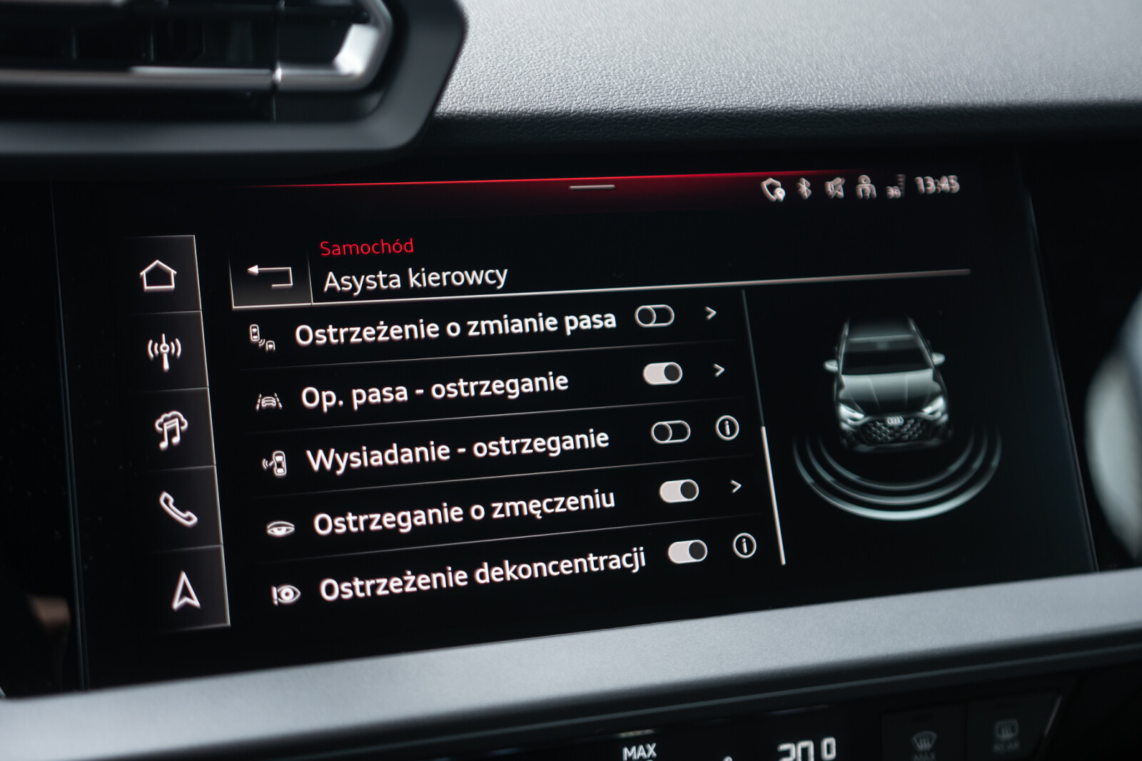 • Funkcja ostrzegającą przy zmianie pasa ruchu wraz z ostrzeżeniem przy wysiadaniu i asystentem ruchu przecinającego tor jazdy z tyłu