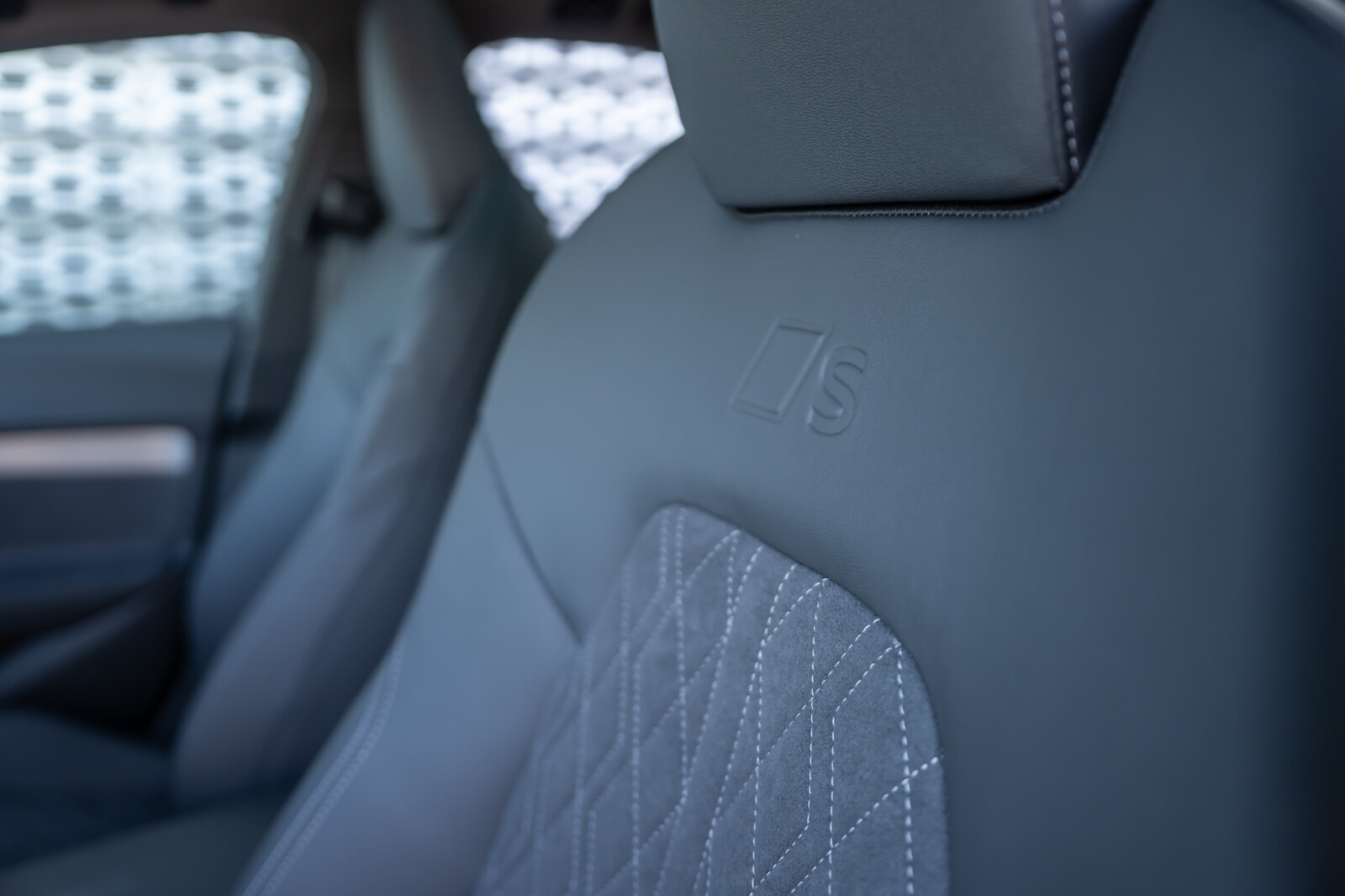 • Wnętrze z siedzeniami sportowymi, kombinacja mikrofibra Dinamica/skóra w kolorze czarnym, czerwony szew Audi Sport GmbH