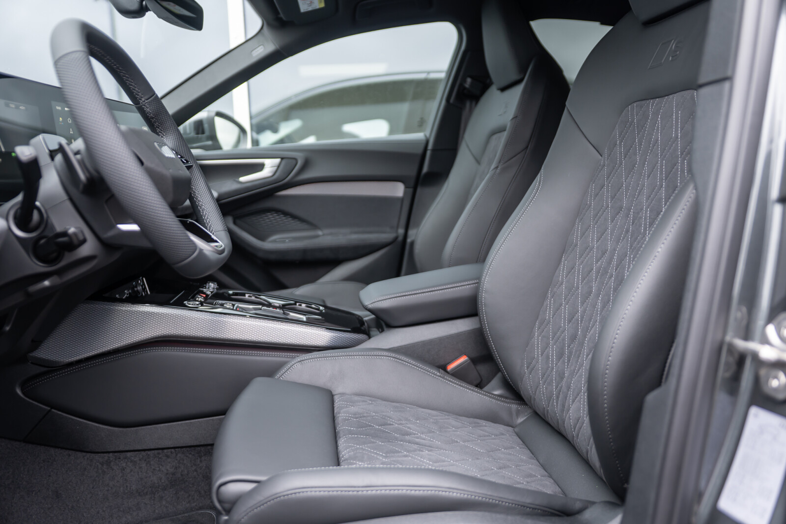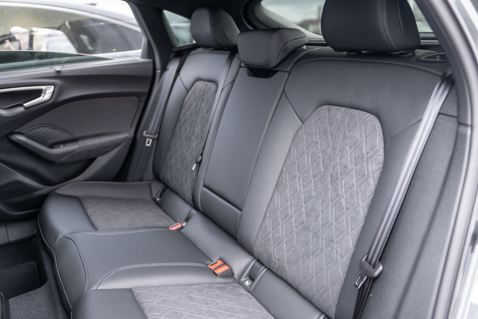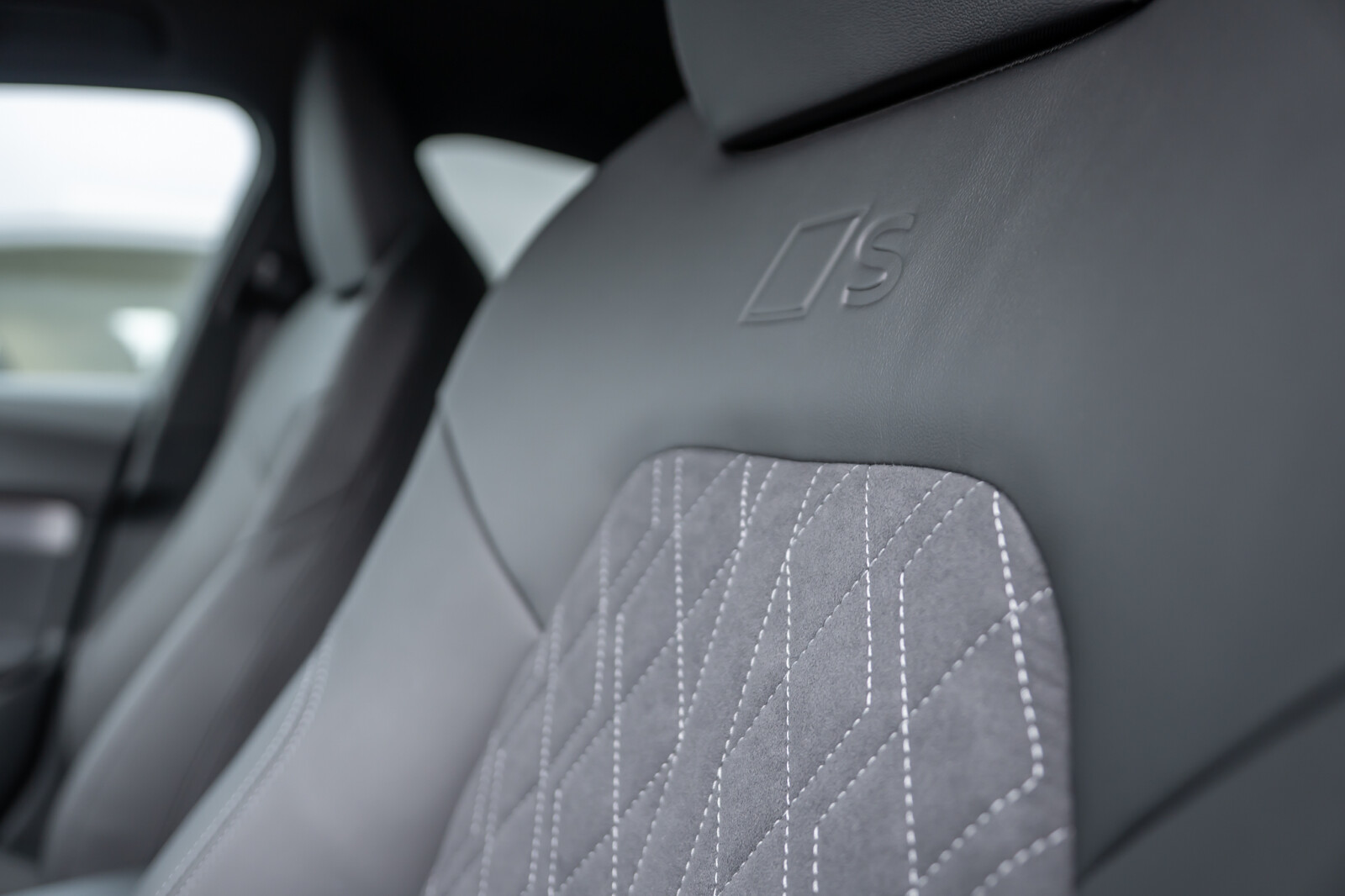 • Wnętrze z siedzeniami sportowymi, kombinacja mikrofibra Dinamica/skóra w kolorze czarnym, czerwony szew Audi Sport GmbH