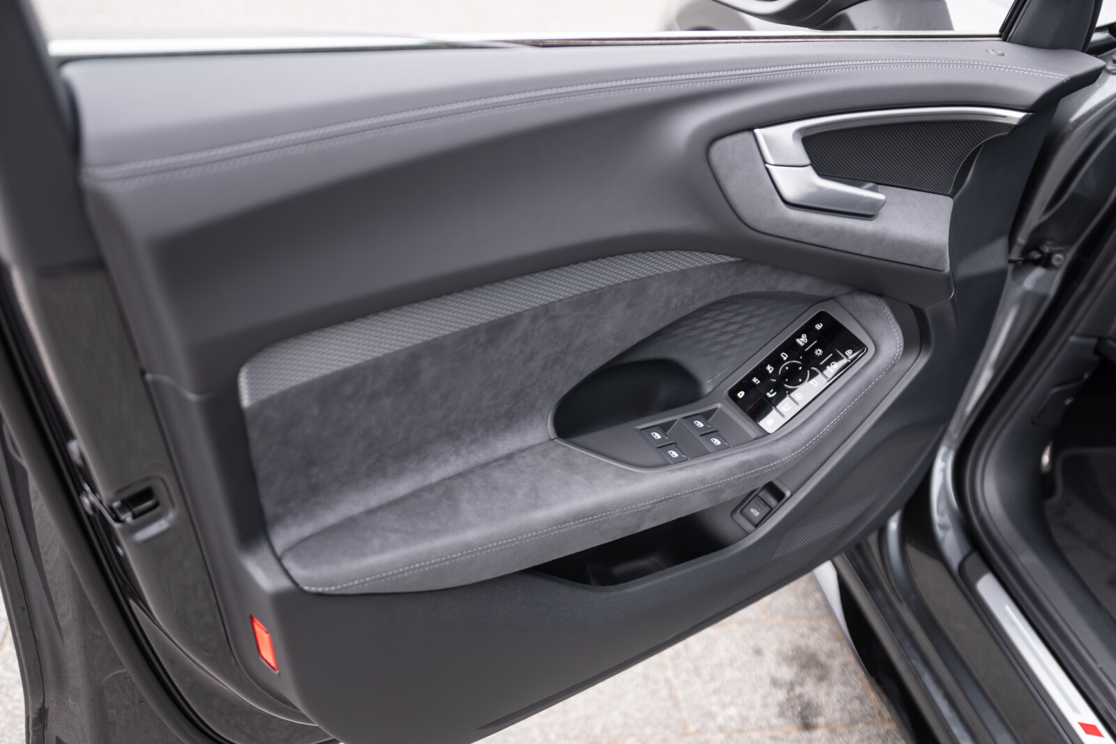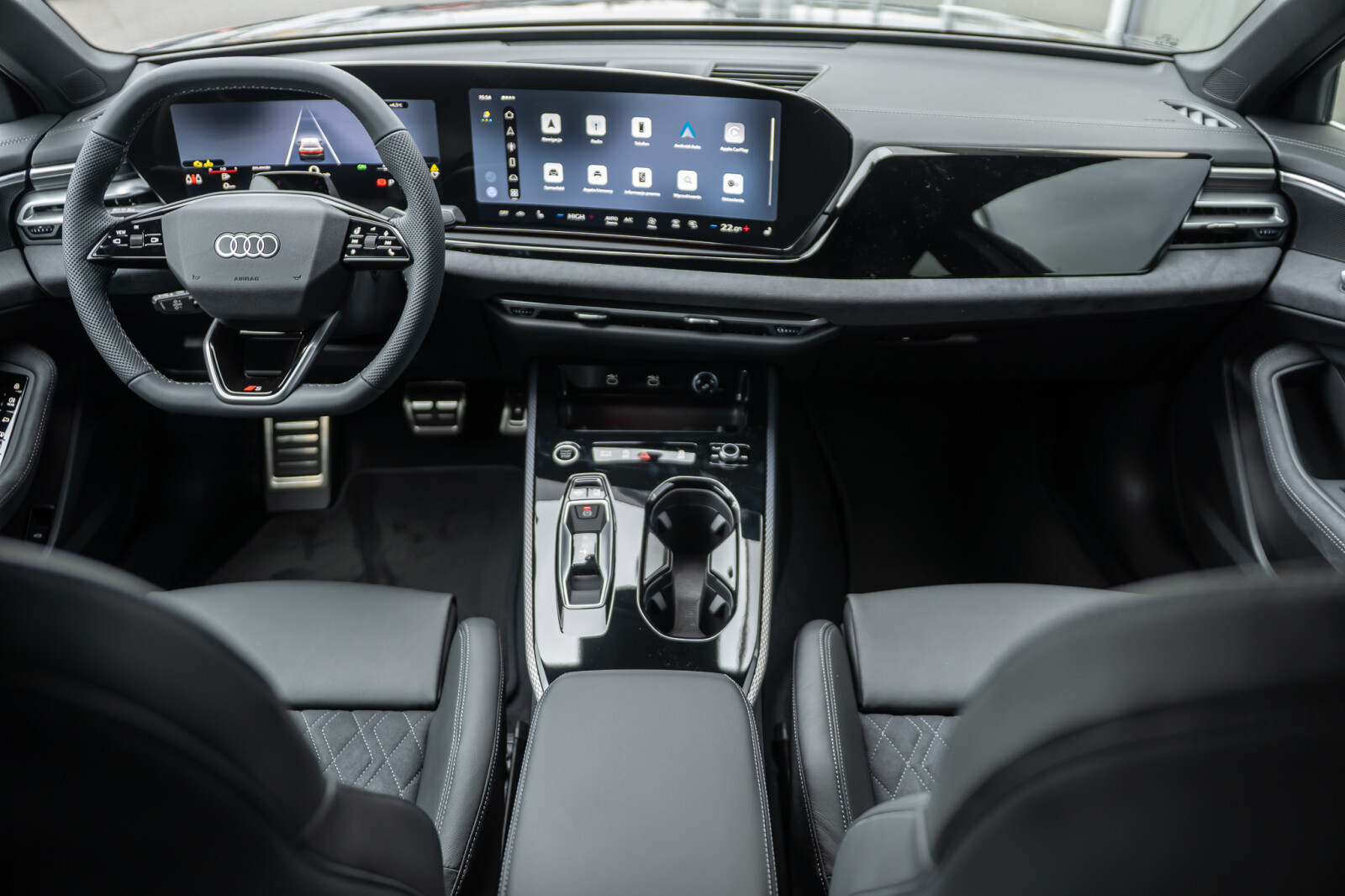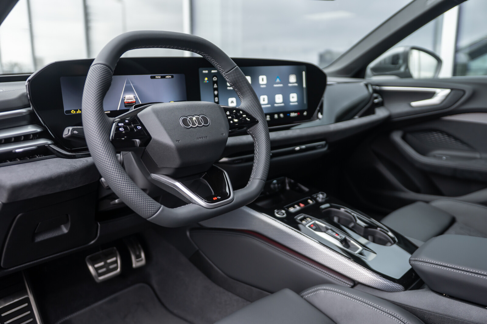 • Wnętrze z siedzeniami sportowymi, kombinacja mikrofibra Dinamica/skóra w kolorze czarnym, czerwony szew Audi Sport GmbH