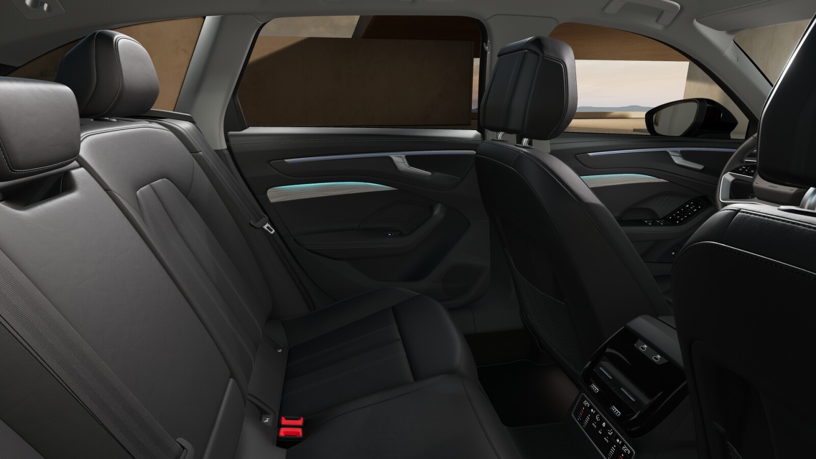 • środkowe części przednich siedzeń i skrajnych siedzeń tylnych obszyte czarną skórą, boki siedzeń i zagłówki obszyte czarną skórą ekologiczną; kontrastowy szew (tapicerka tylnych siedzeń dopasowana wizualnie do siedzeń przednich)