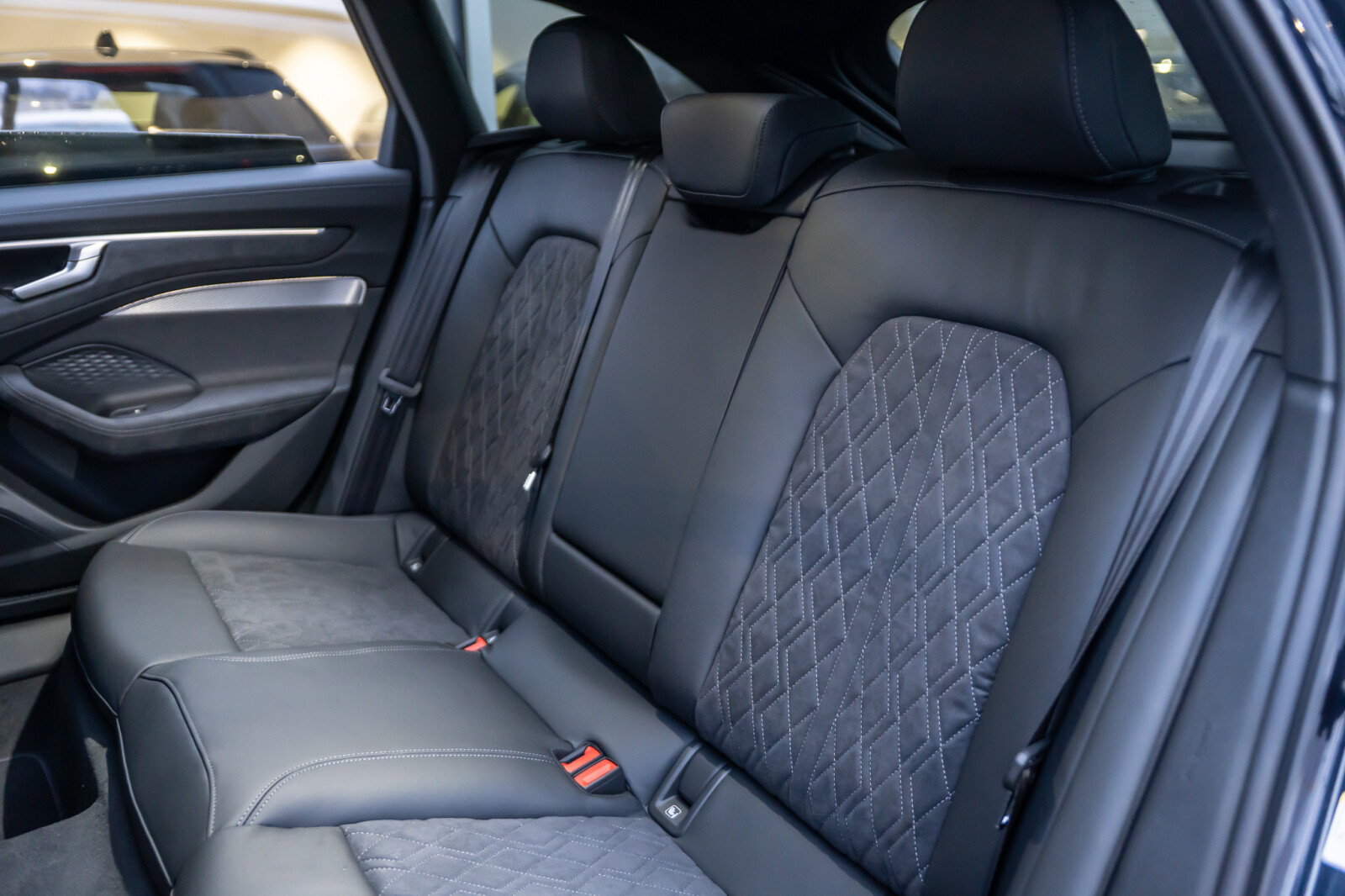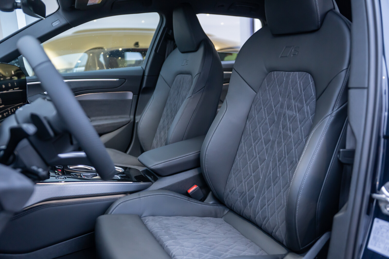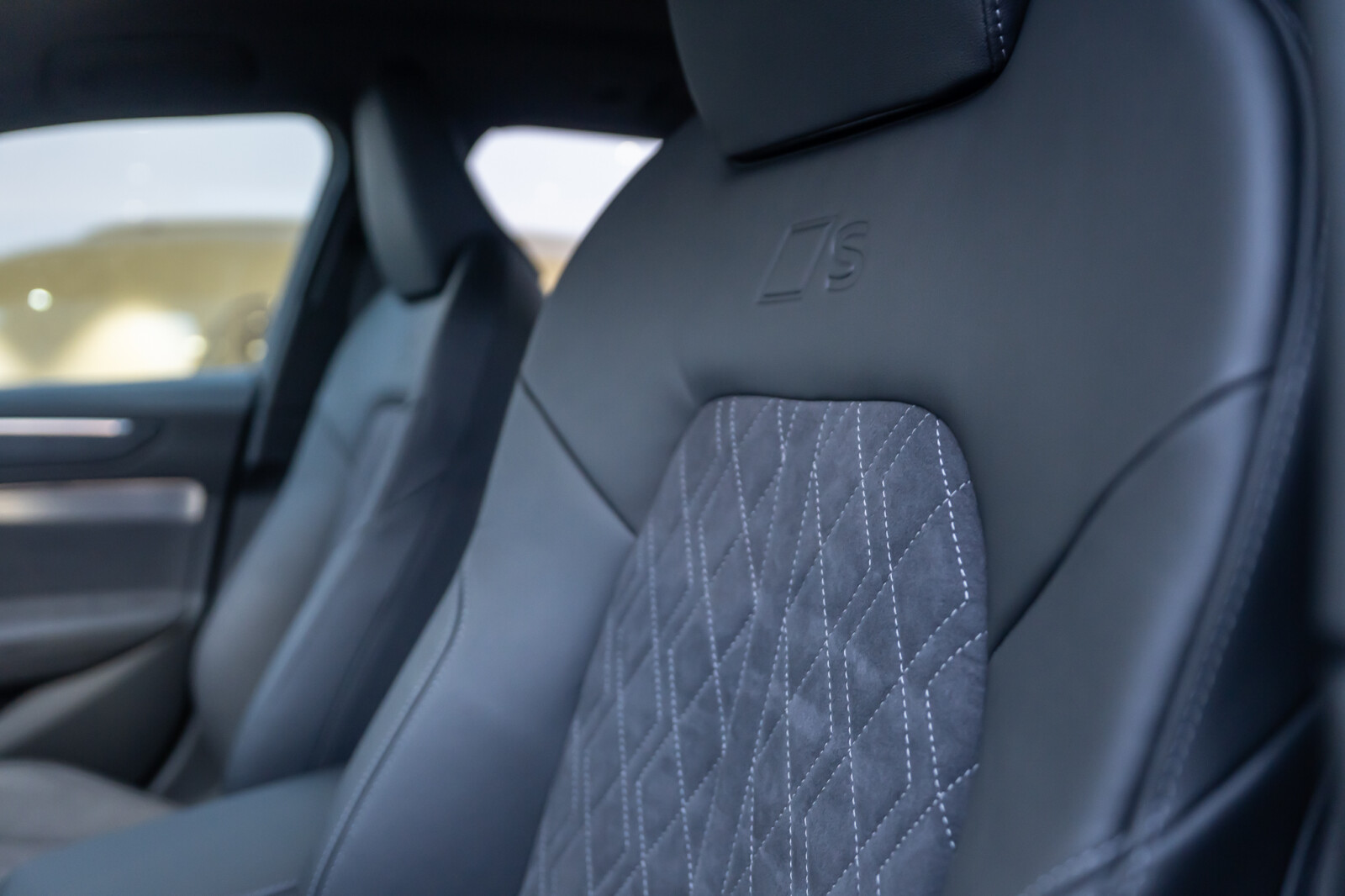 • środkowe części siedzeń obszyte czarną mikrofibrą Dinamica¹ z pikowaniem w romby, boki siedzeń obszyte czarną skórą, zagłówki pokryte czarną skórą ekologiczną, kontrastowy szew, emblematy S na oparciach przednich siedzeń (tapicerka tylnych siedzeń dopasowana wizualnie do siedzeń przednich)