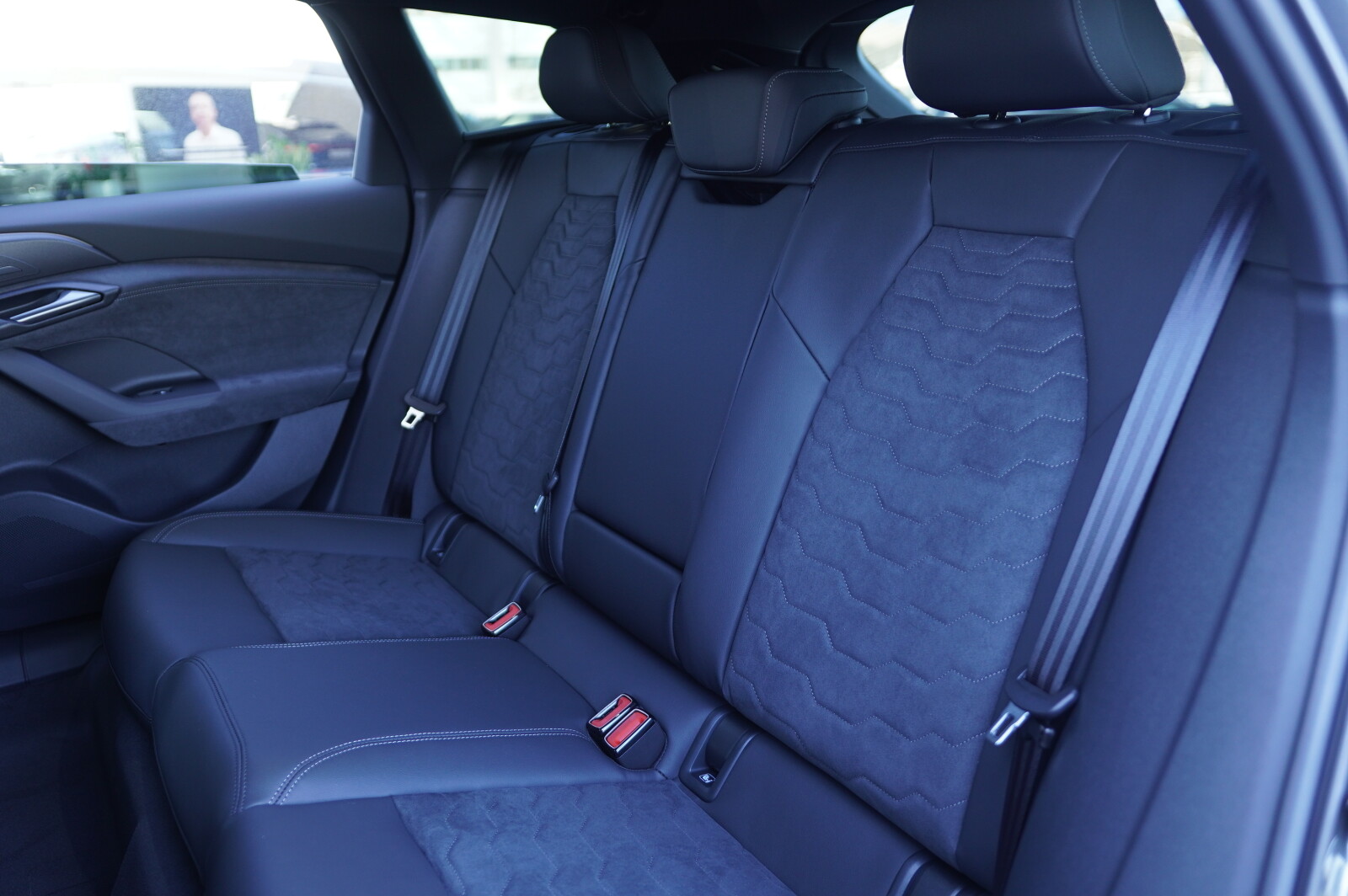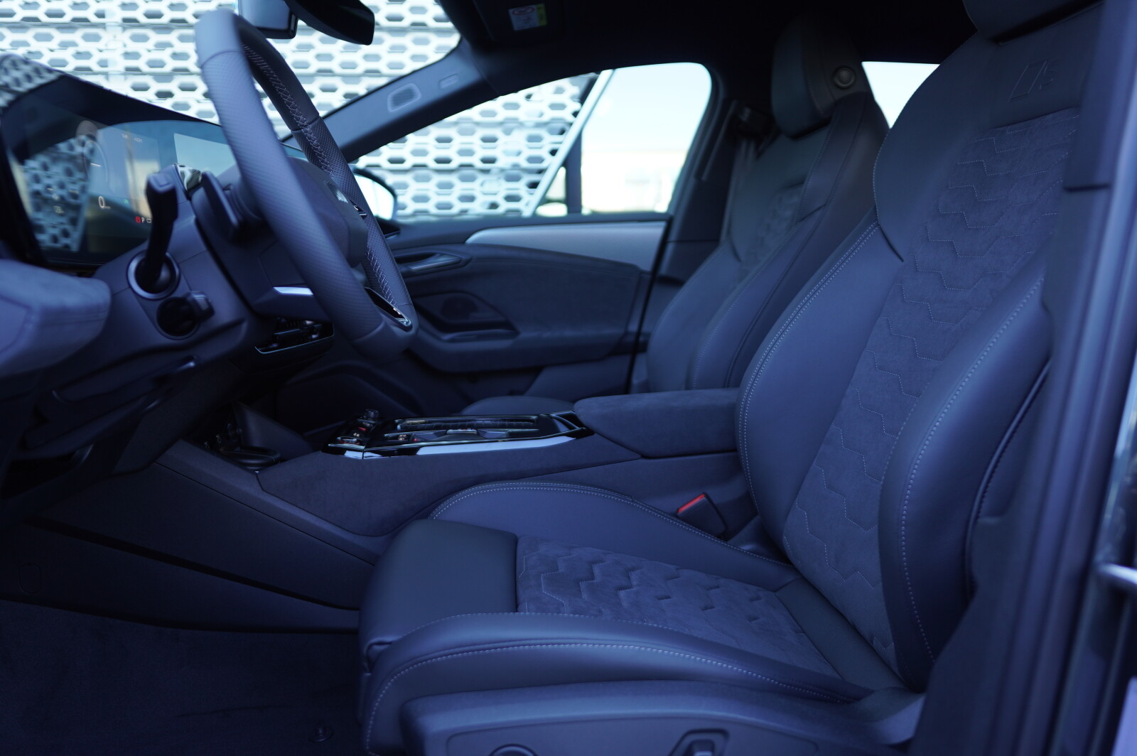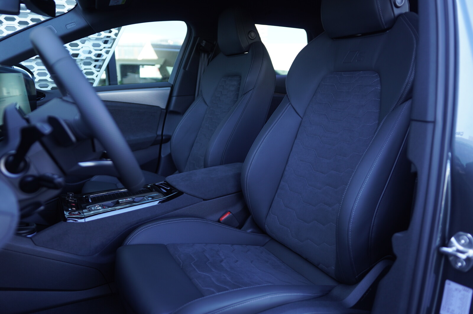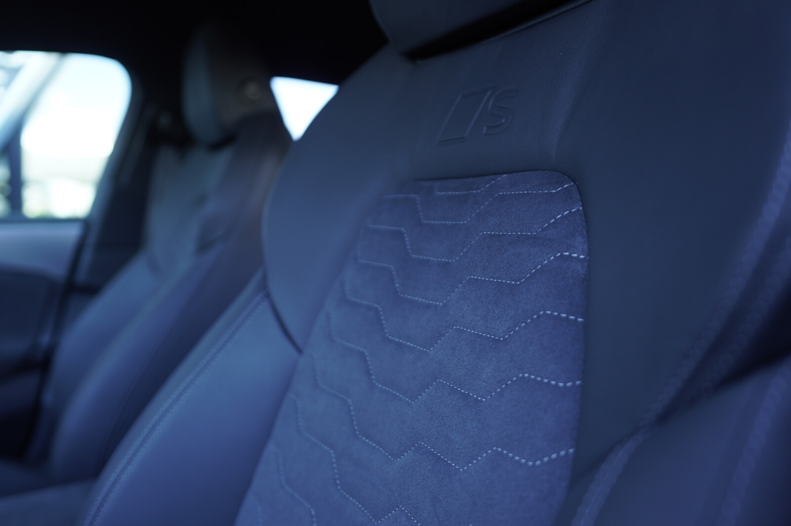 • środkowe części siedzeń obszyte mikrofibrą Dinamica¹ w kolorze czarnym z pikowaniem we wzór spływającej wody, boki siedzeń i zagłówki obszyte skórą w kolorze czarnym, kontrastowy szew i wytłoczone logo S na oparciach przednich siedzeń (tapicerka tylnych siedzeń dopasowana wizualnie do przednich)