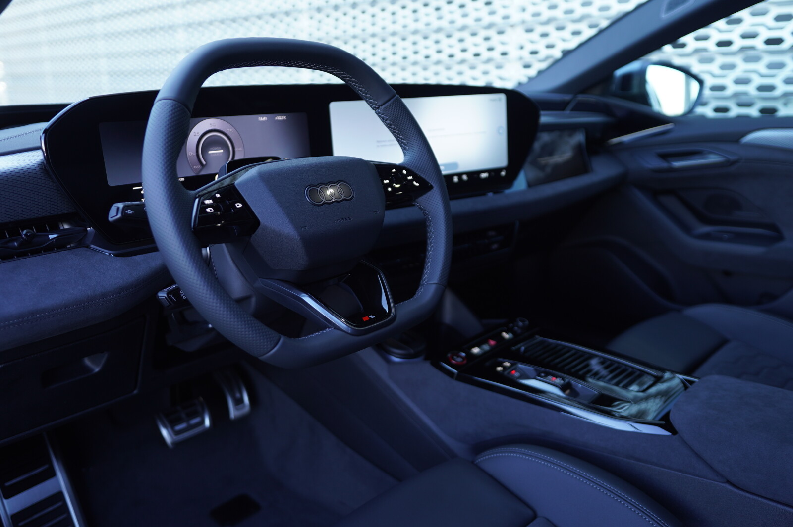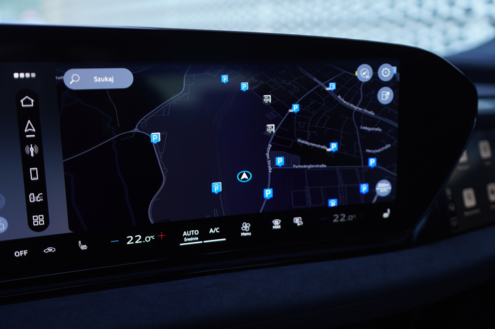 • kierownica sportowa, 3-ramienna, obszyta skórą, spłaszczona na dole i na górze, wielofunkcyjna, z przełącznikami zmiany stopnia rekuperacji oraz aplikacjami w optyce chromu, emblematem S i kontrastowym szwem, prawy i lewy segment perforowany