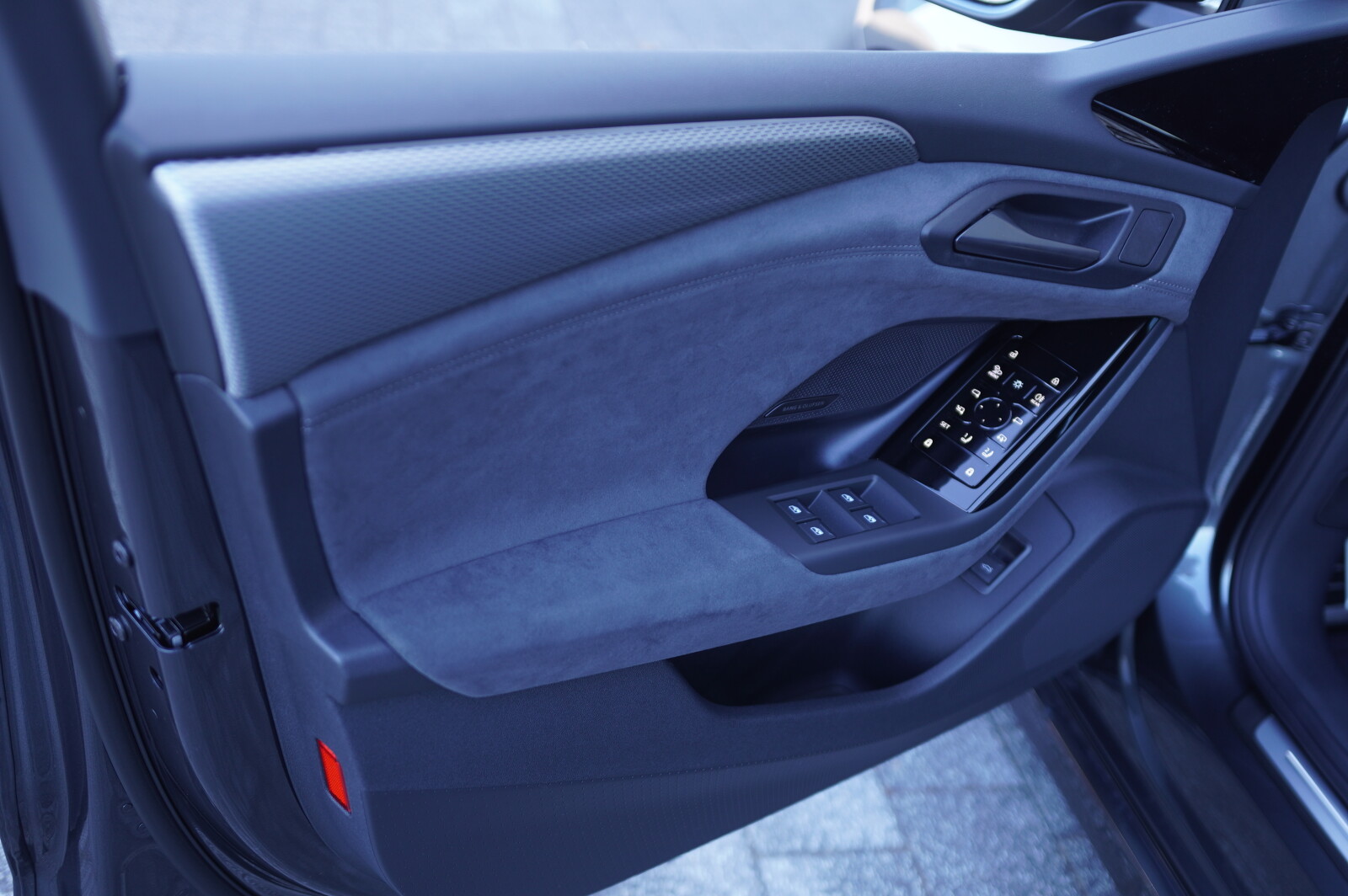 • dolne i górne elementy wnętrza pokryte mikrofibrą Dinamica¹: elementy dekoracyjne na tablicy rozdzielczej oraz w drzwiach pokryte czarną mikrofibrą Dinamica¹ z kontrastowym szwem stalowoszarym, środkowy podłokietnik, konsola środkowa i podparcia w drzwiach pokryte czarną mikrofibrą Dinamica¹