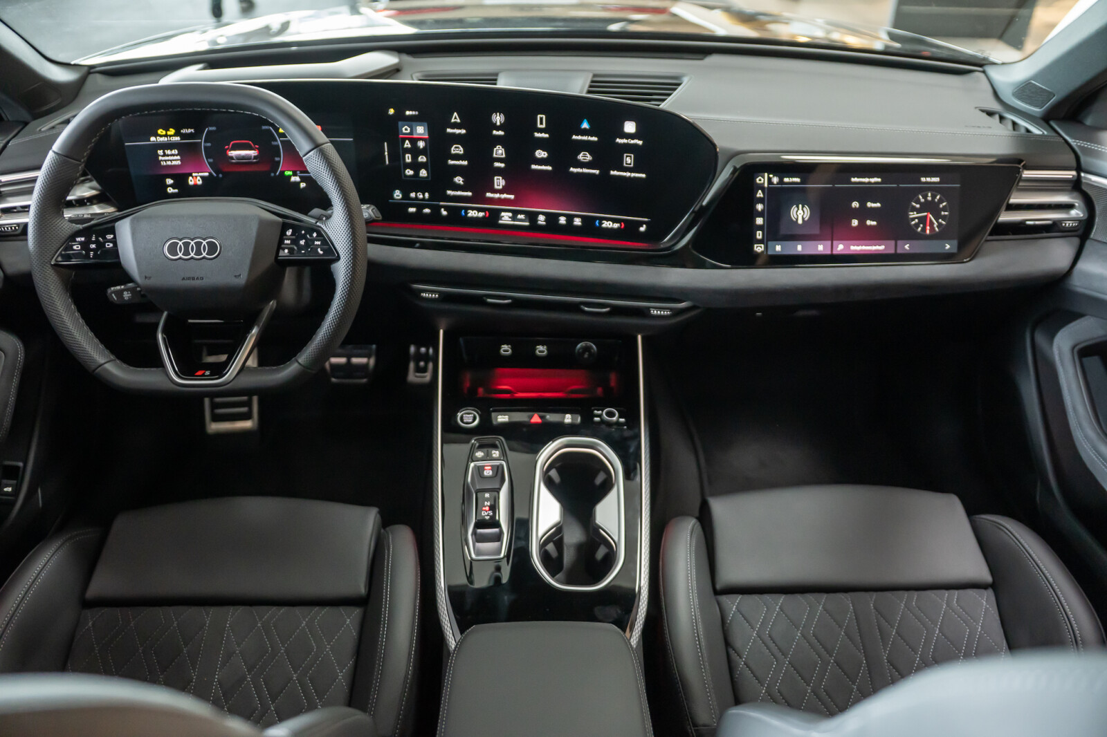 • sportowa 3-ramienna kierownica wielofunkcyjna, obszyta skórą, spłaszczona u dołu i na górze, z przyciskami zmiany przełożenia, aplikacjami w optyce chromu i emblematem S, prawy i lewy segment obszyty perforowaną skórą, kontrastowy szew
