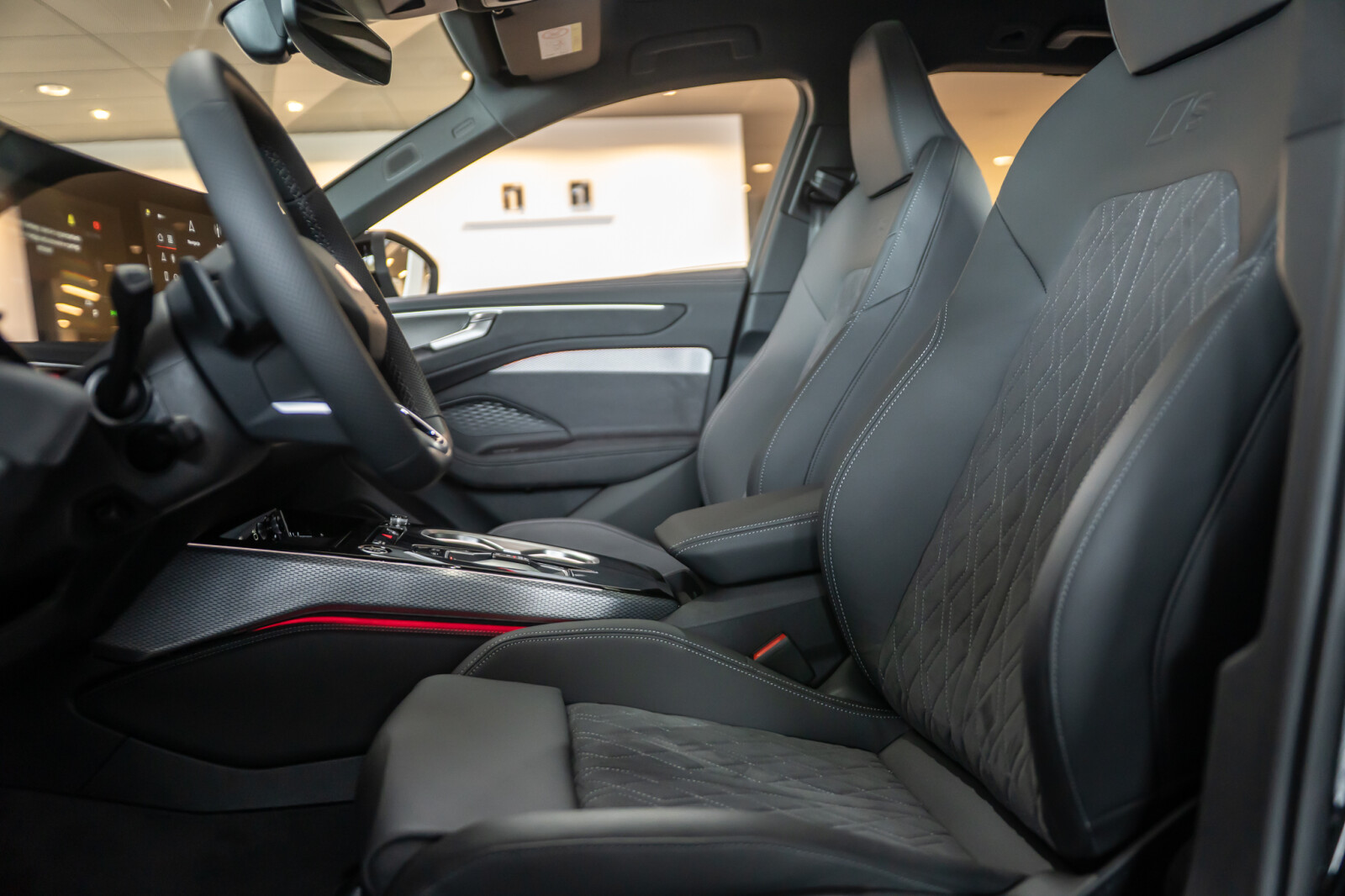 • środkowe części siedzeń obszyte czarną mikrofibrą Dinamica¹ z pikowaniem w romby, boki siedzeń obszyte czarną skórą, zagłówki pokryte czarną skórą ekologiczną, kontrastowy szew, emblematy S na oparciach przednich siedzeń (tapicerka tylnych siedzeń dopasowana wizualnie do siedzeń przednich)