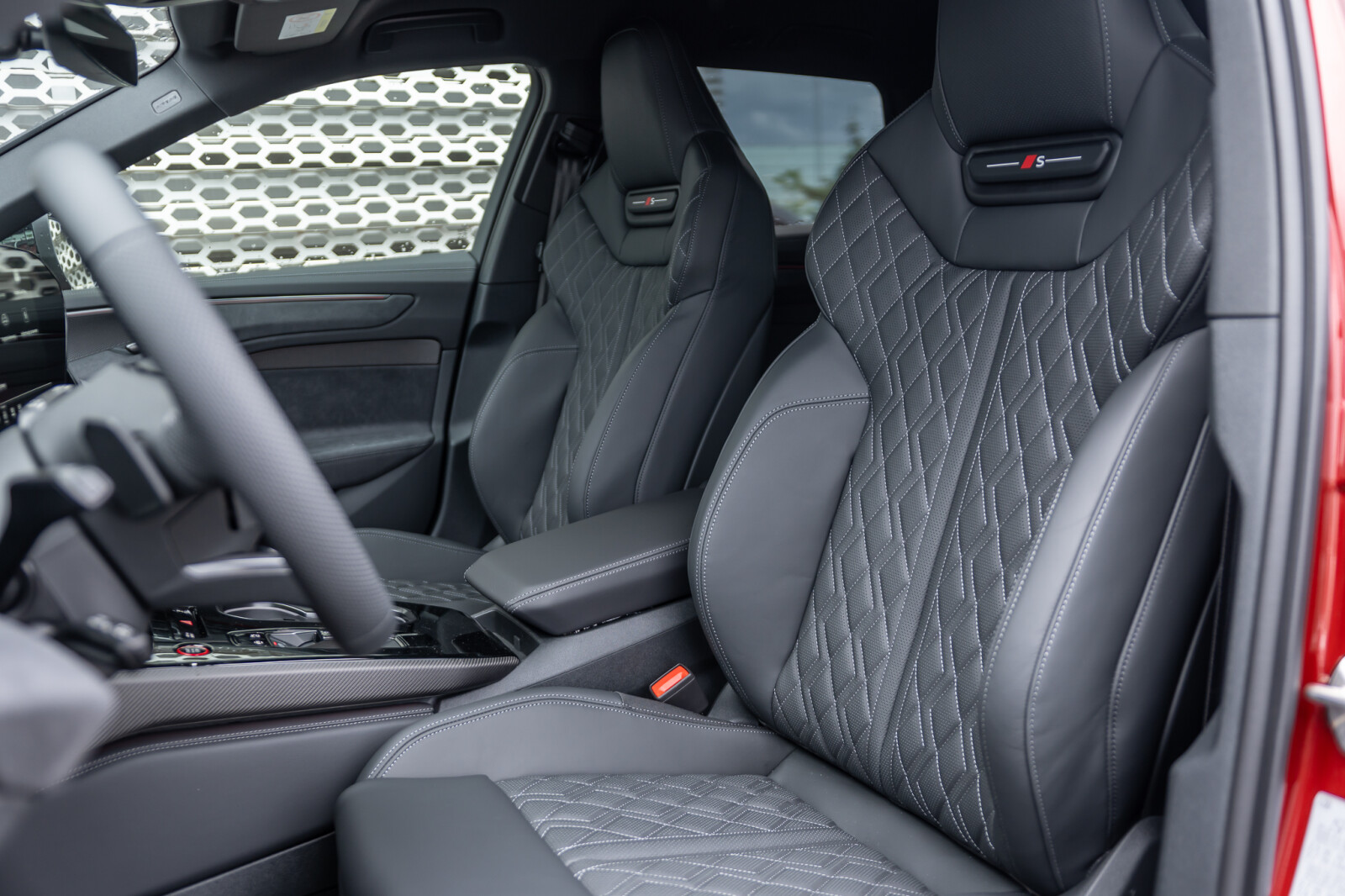 • przednie siedzenia sportowe plus z wentylacją, wizualnie zintegrowanymi zagłówkami i wyprofilowanymi bokami, poprawiającymi stabilność na zakrętach, dekoracyjny segment z podświetlonym emblematem S w górnej części oparcia, manualnie wysuwane podparcie pod uda