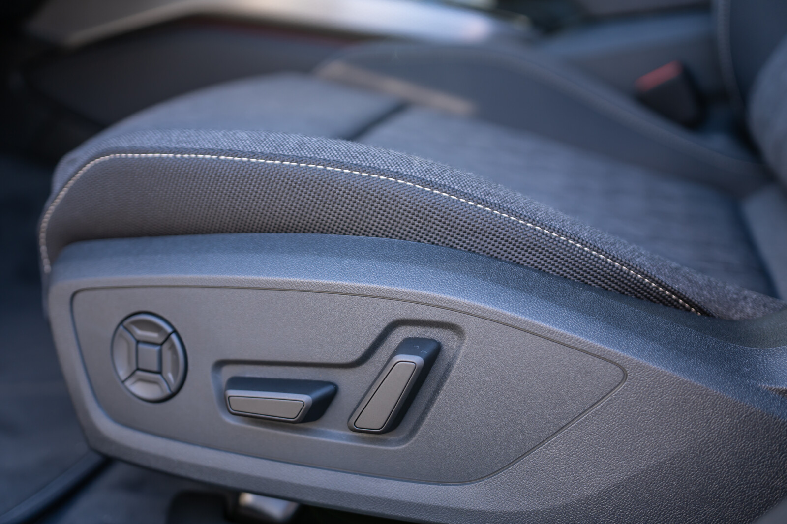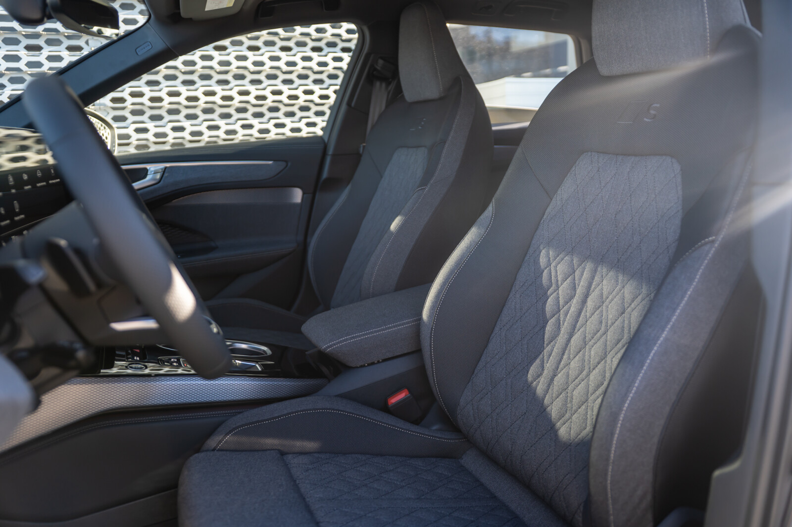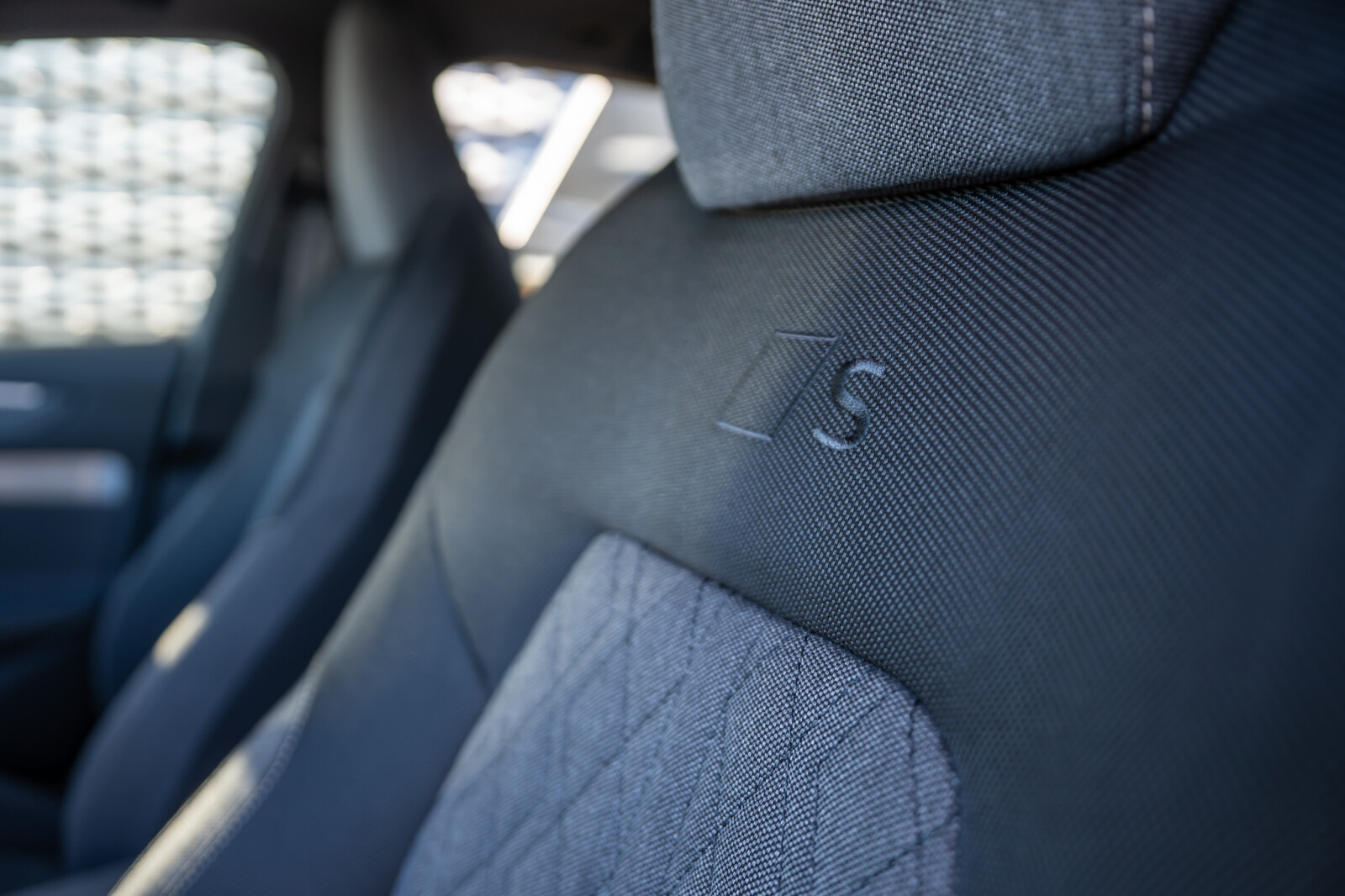 • środkowe części siedzeń i zagłówki obszyte tkaniną Kaskade, boki siedzeń obszyte tkaniną Impressum, wyszyty emblemat S na oparciach przednich siedzeń, pikowanie w romby dopasowane kolorystycznie, kontrastowy szew (tapicerka tylnych siedzeń dopasowana wizualnie do siedzeń przednich)