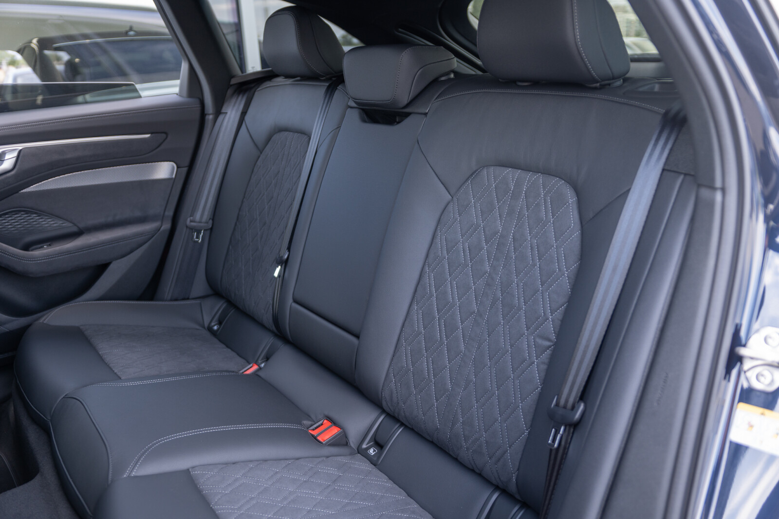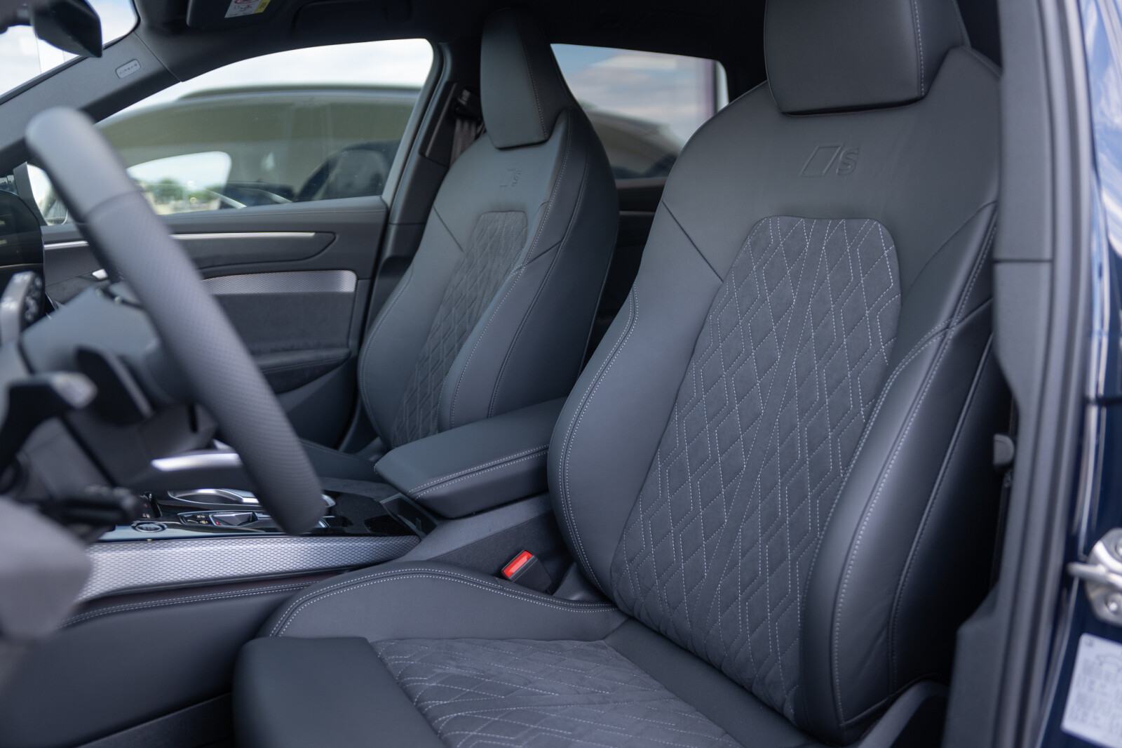 • środkowe części siedzeń obszyte czarną mikrofibrą Dinamica¹ z pikowaniem w romby, boki siedzeń obszyte czarną skórą, zagłówki pokryte czarną skórą ekologiczną, kontrastowy szew, emblematy S na oparciach przednich siedzeń (tapicerka tylnych siedzeń dopasowana wizualnie do siedzeń przednich)