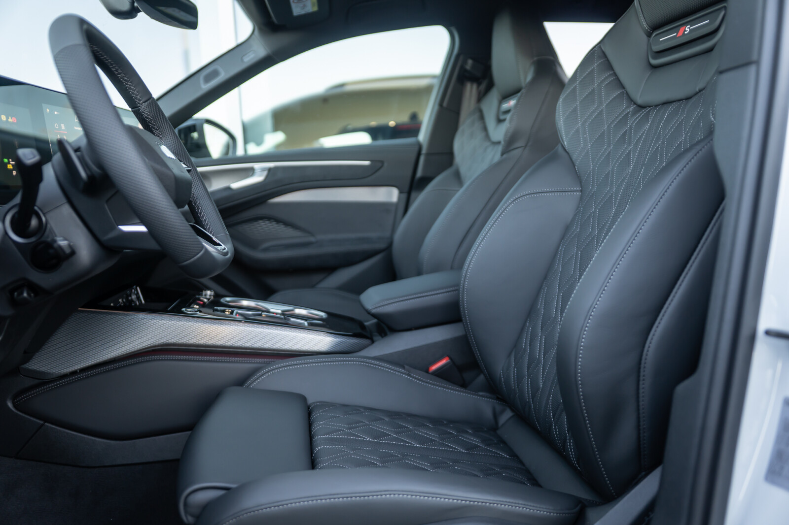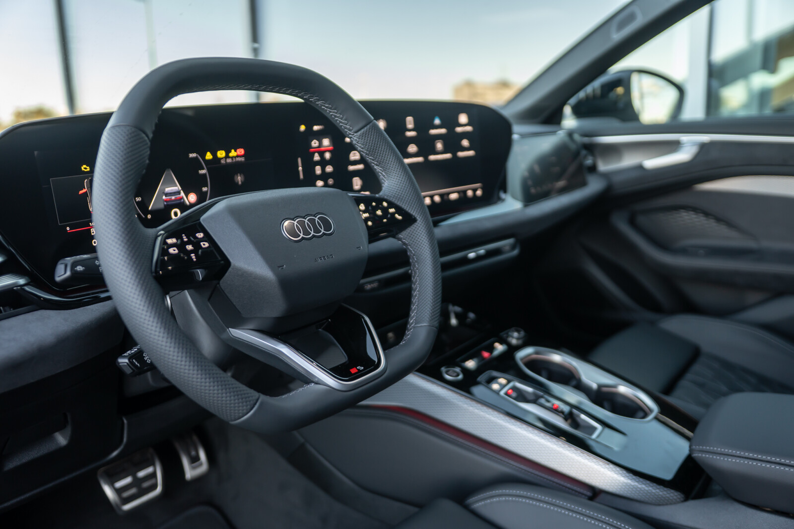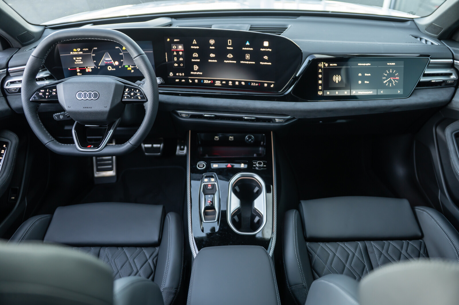 • sportowa 3-ramienna kierownica wielofunkcyjna, obszyta skórą, spłaszczona u dołu i na górze, z przyciskami zmiany przełożenia, aplikacjami w optyce chromu i emblematem S