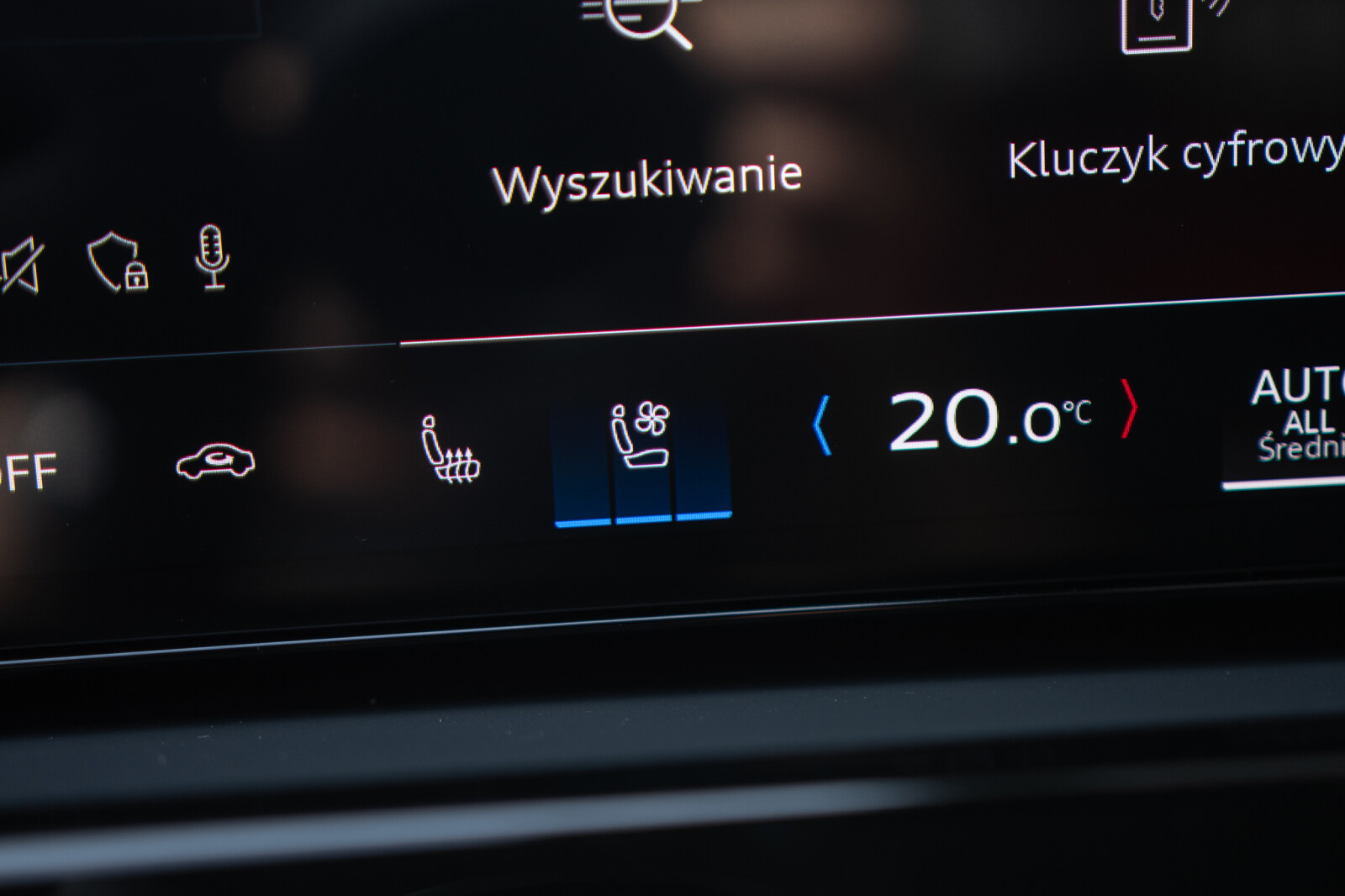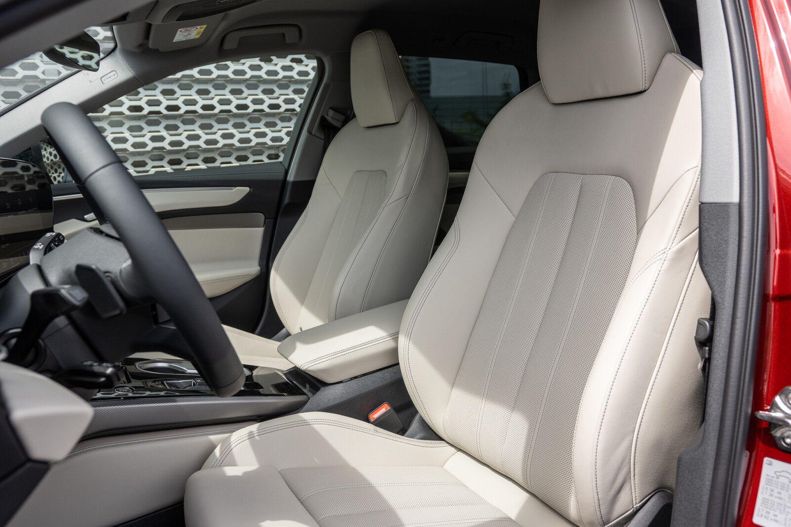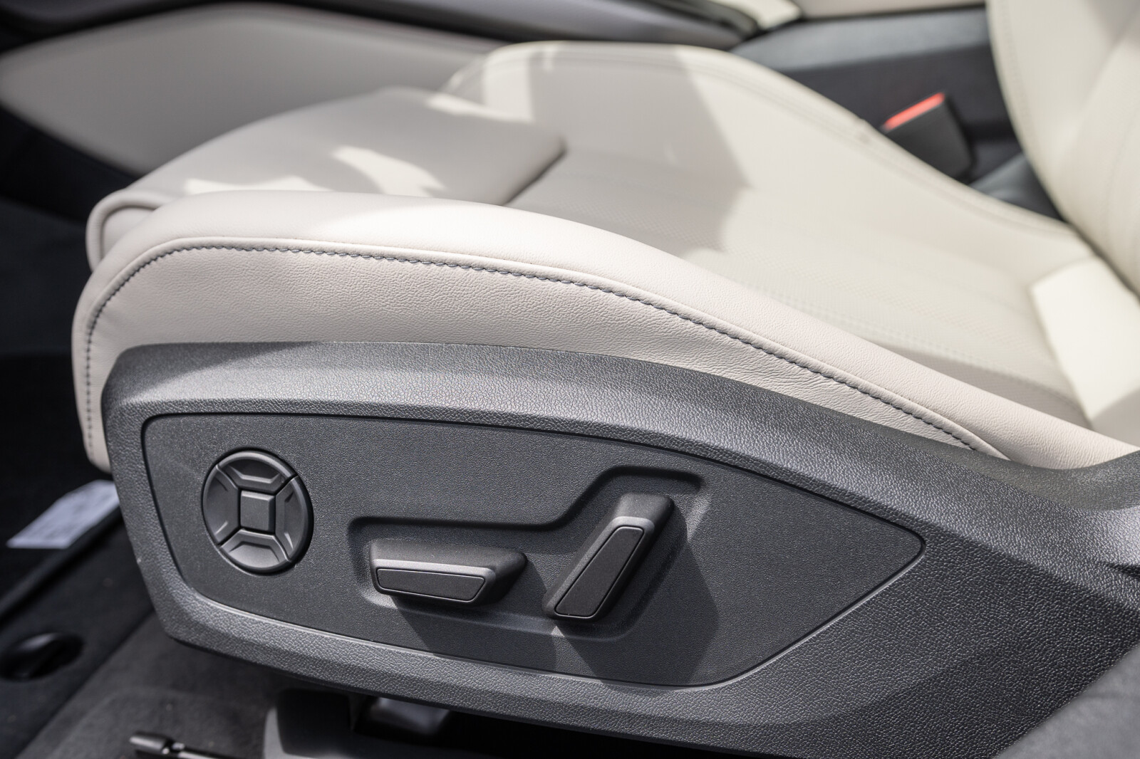 • wentylowane środkowe części przednich siedzeń i niewentylowane środkowe części skrajnych siedzeń tylnych obszyte perforowaną skórą w kolorze beżowym Perlmutt, boki siedzeń i zagłówki obszyte skórą ekologiczną beżową Perlmutt, kontrastowy szew (tapicerka tylnych siedzeń dopasowana wizualnie do siedzeń przednich)
