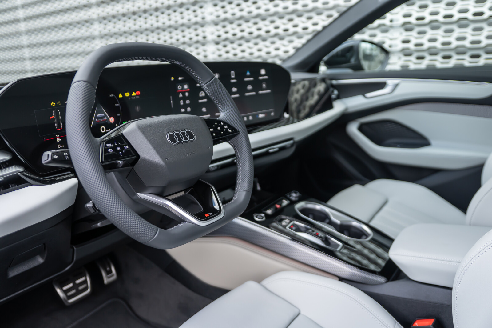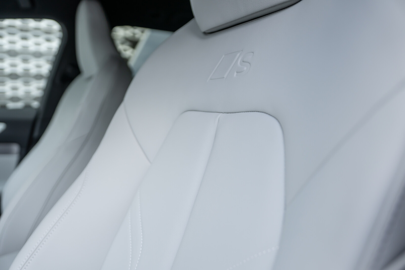 • środkowe części siedzeń obszyte skórą w kolorze pastelowosrebrnym, boki siedzeń i zagłówki obszyte pastelowosrebrną skórą ekologiczną, kontrastowy szew, emblemat S na oparciach przednich siedzeń (tapicerka tylnych siedzeń dopasowana wizualnie do siedzeń przednich)