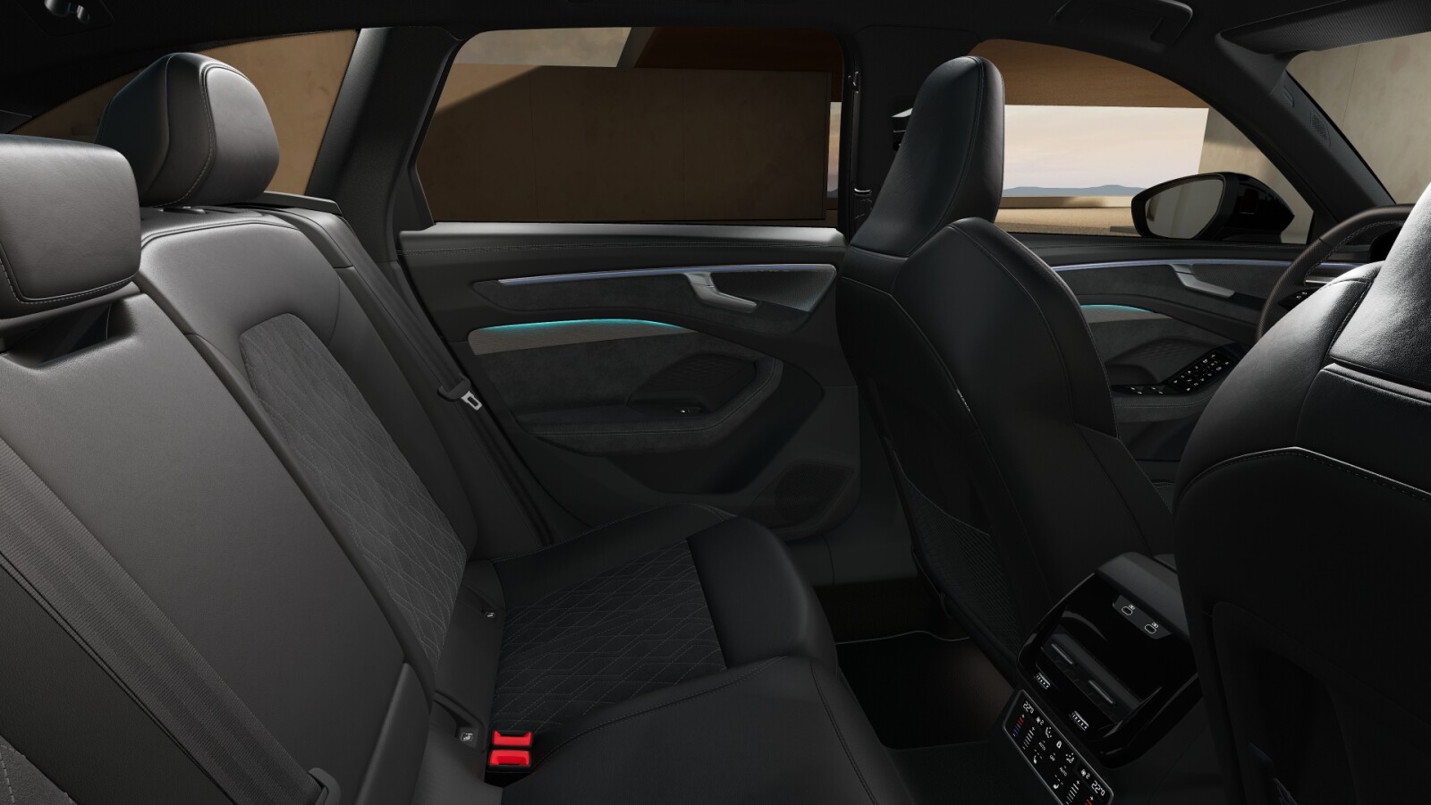 • środkowe części siedzeń obszyte czarną mikrofibrą Dinamica¹ z pikowaniem w romby, boki siedzeń obszyte czarną skórą, zagłówki pokryte czarną skórą ekologiczną, kontrastowy szew, emblematy S na oparciach przednich siedzeń (tapicerka tylnych siedzeń dopasowana wizualnie do siedzeń przednich)