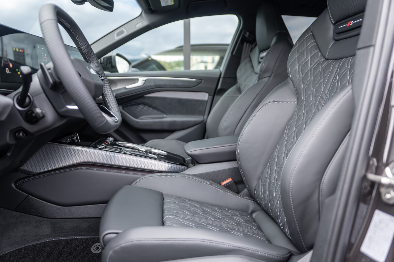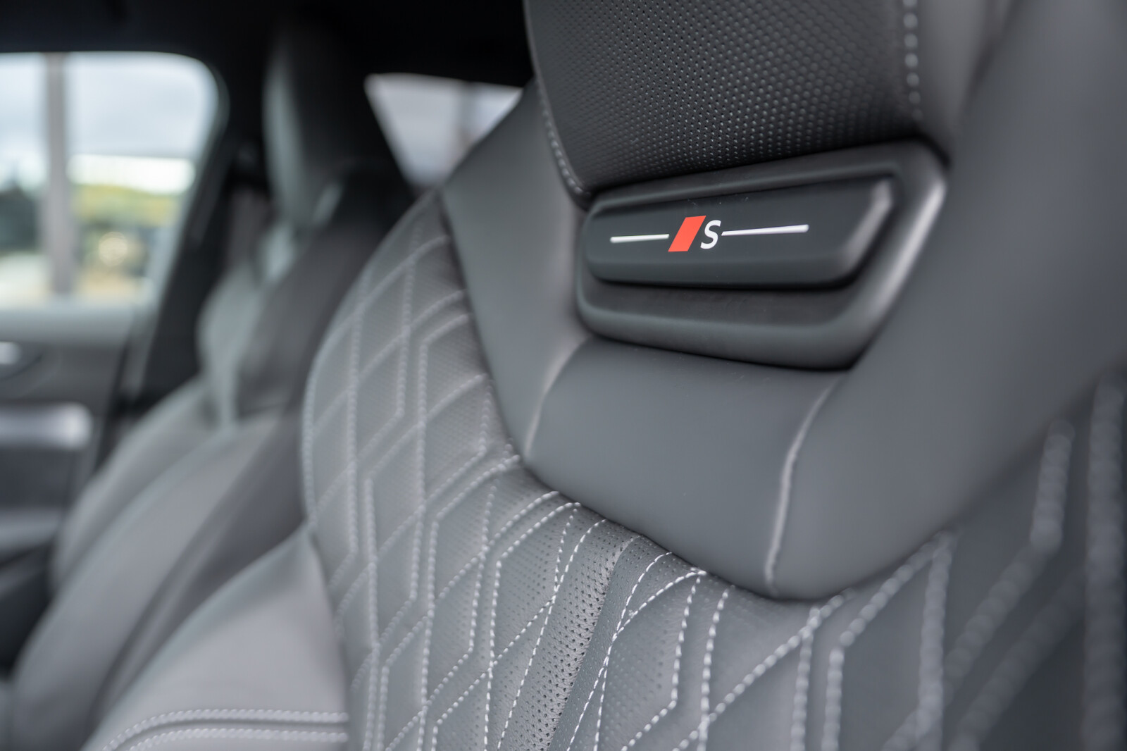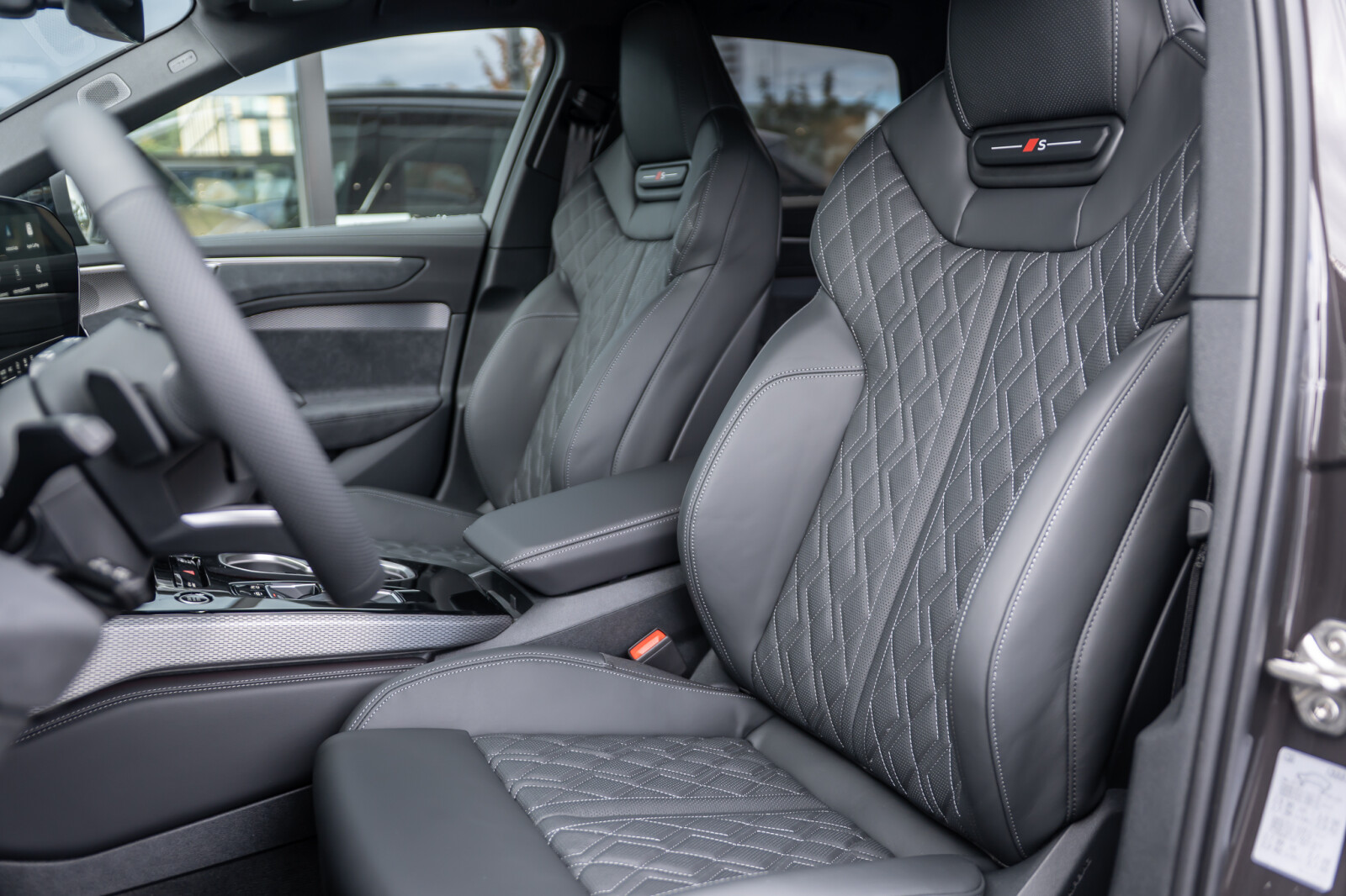 przednie siedzenia sportowe plus z wentylacją, wizualnie zintegrowanymi zagłówkami i wyprofilowanymi bokami, poprawiającymi stabilność na zakrętach, dekoracyjny segment z podświetlonym emblematem S w górnej części oparcia, manualnie wysuwane podparcie pod uda
