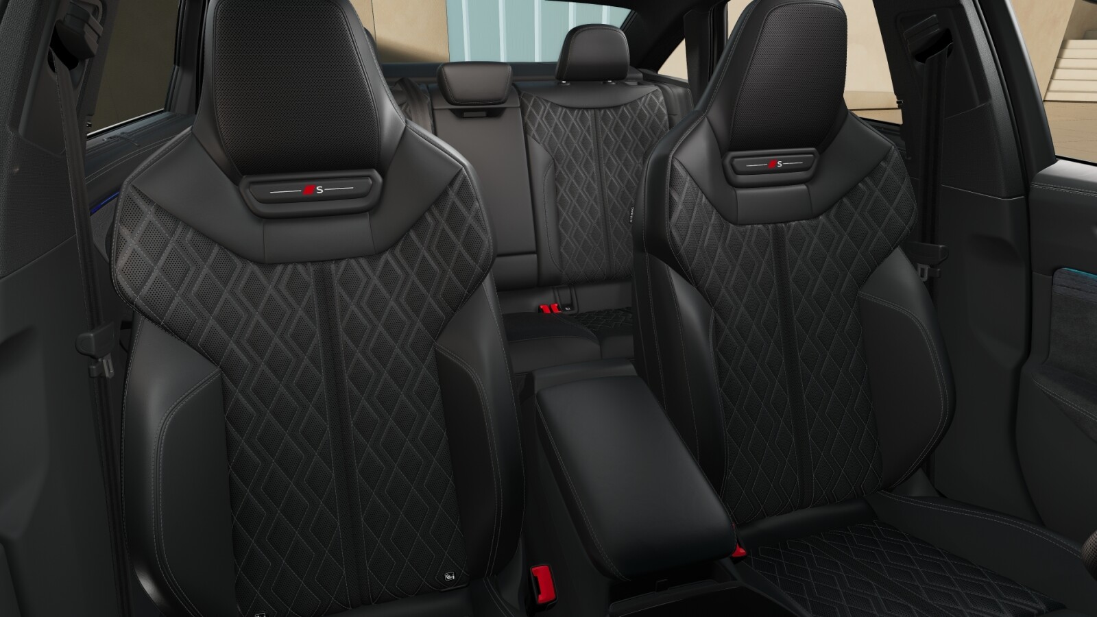 • przednie siedzenia sportowe plus z wentylacją, wizualnie zintegrowanymi zagłówkami i wyprofilowanymi bokami, poprawiającymi stabilność na zakrętach, dekoracyjny segment z podświetlonym emblematem S w górnej części oparcia, manualnie wysuwane podparcie pod uda