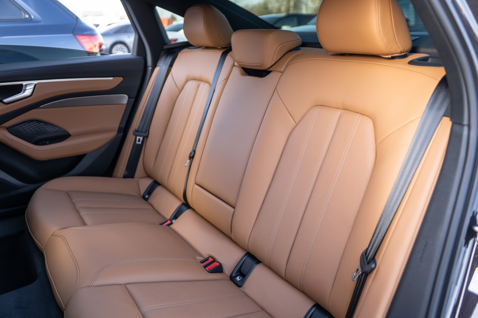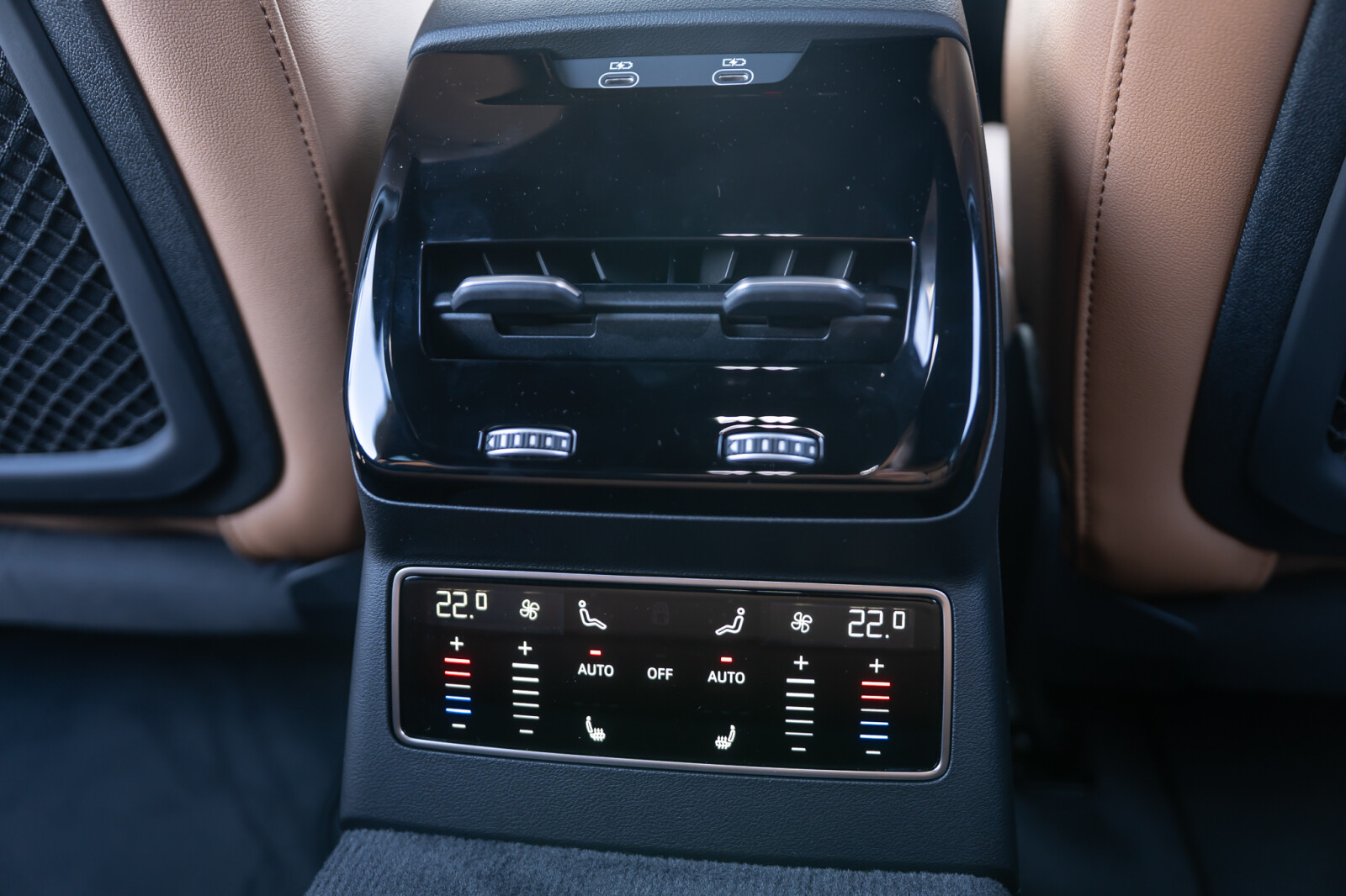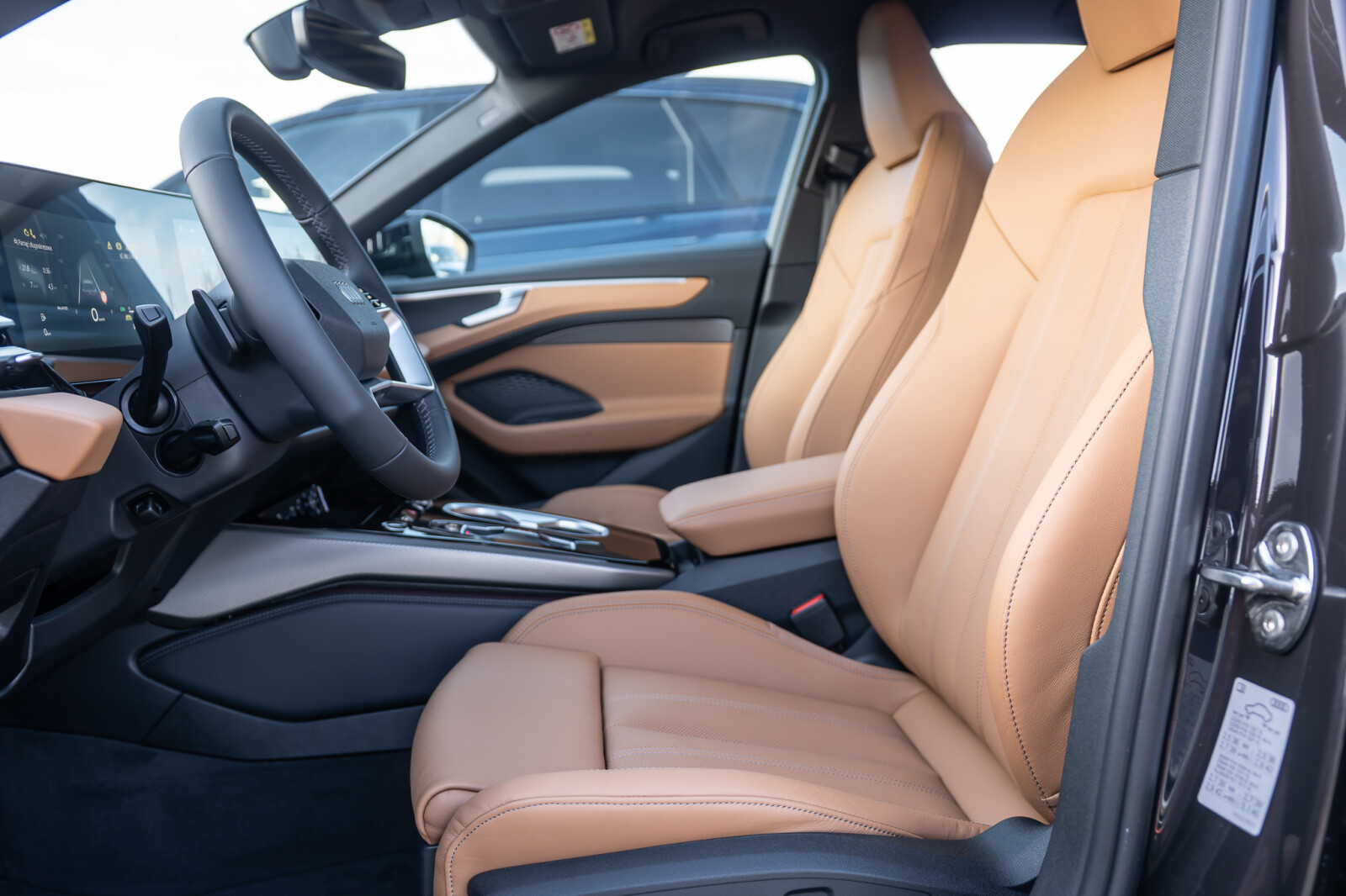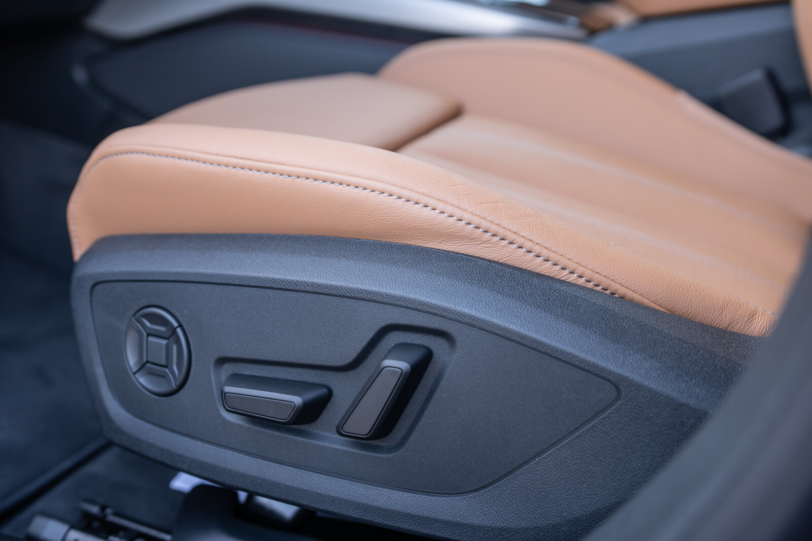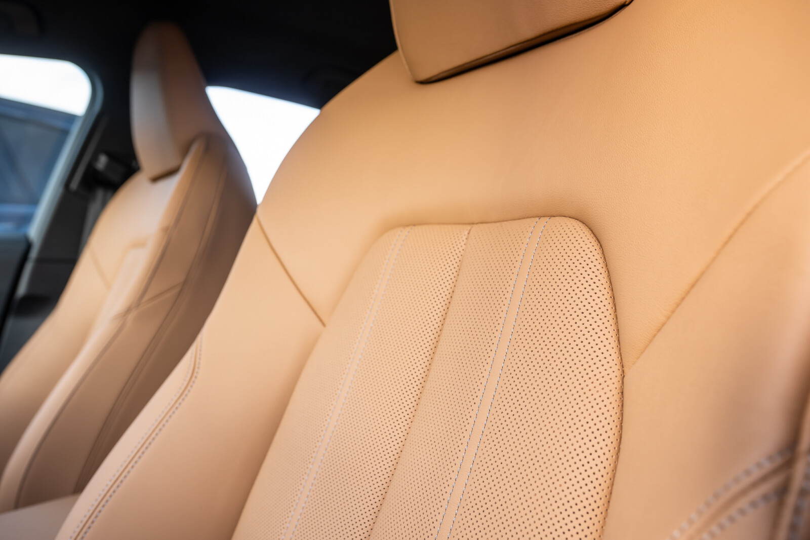 • wentylowane środkowe części przednich siedzeń i niewentylowane środkowe części skrajnych siedzeń tylnych obszyte perforowaną skórą w kolorze brązowym Muskat, boki siedzeń i zagłówki obszyte skórą ekologiczną brązową Muskat, kontrastowy szew (tapicerka tylnych siedzeń dopasowana wizualnie do siedzeń przednich)