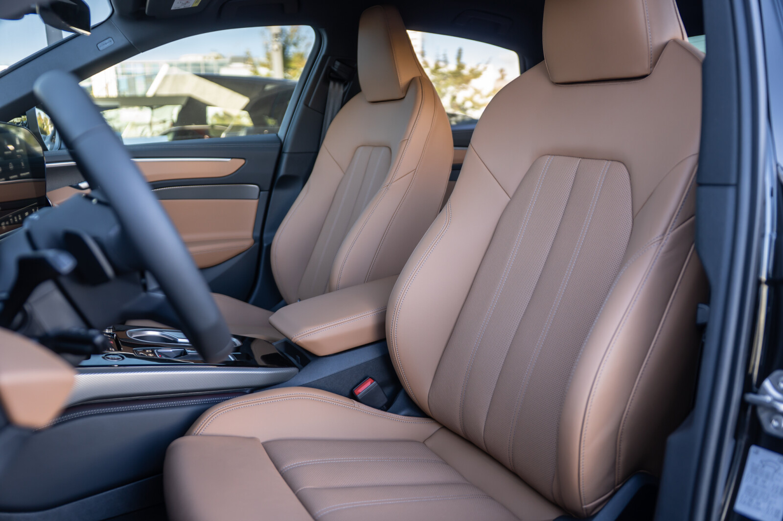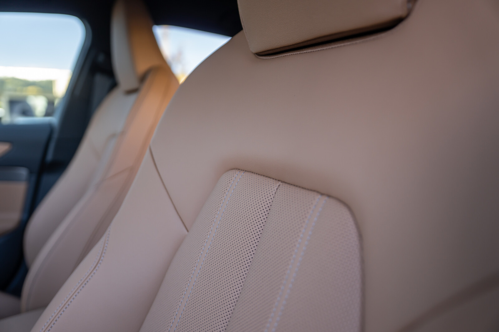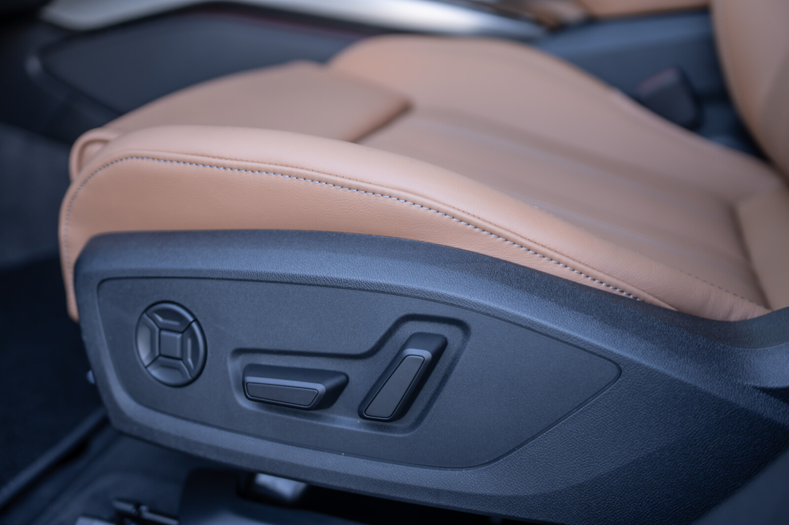 • wentylowane środkowe części przednich siedzeń i niewentylowane środkowe części skrajnych siedzeń tylnych obszyte perforowaną skórą w kolorze brązowym Muskat, boki siedzeń i zagłówki obszyte skórą ekologiczną brązową Muskat, kontrastowy szew (tapicerka tylnych siedzeń dopasowana wizualnie do siedzeń przednich)
