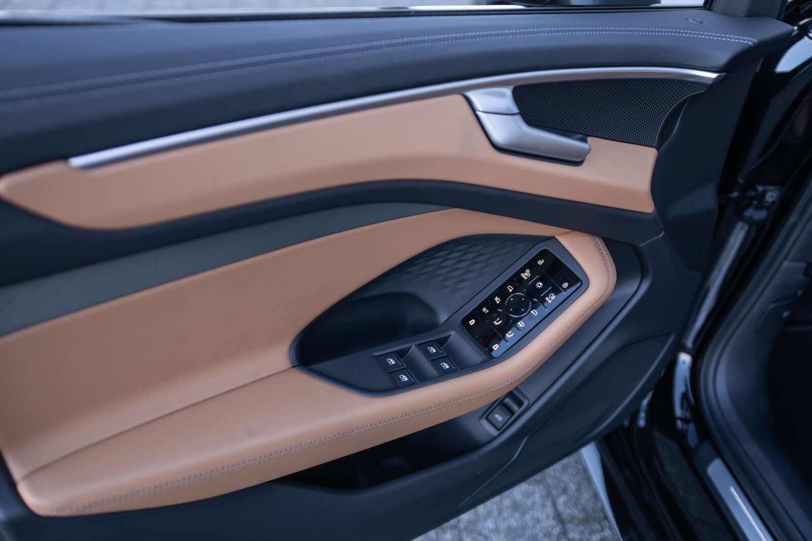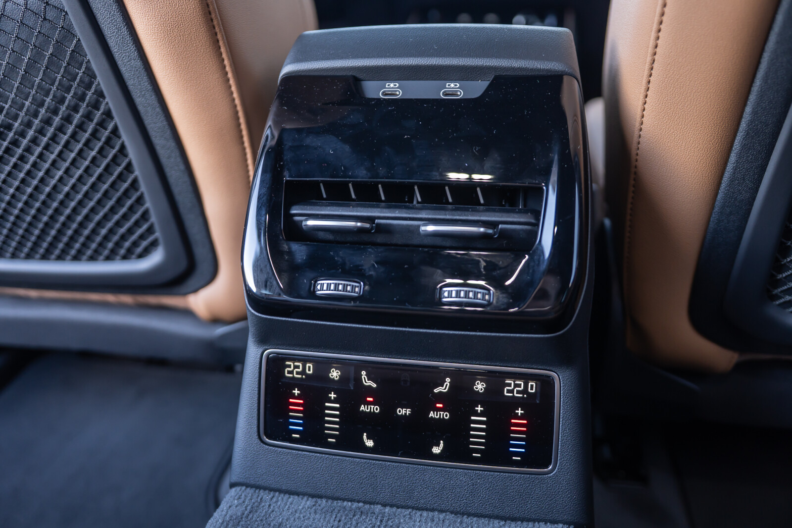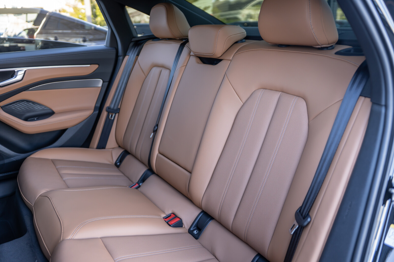 • wentylowane środkowe części przednich siedzeń i niewentylowane środkowe części skrajnych siedzeń tylnych obszyte perforowaną skórą w kolorze brązowym Muskat, boki siedzeń i zagłówki obszyte skórą ekologiczną brązową Muskat, kontrastowy szew (tapicerka tylnych siedzeń dopasowana wizualnie do siedzeń przednich)