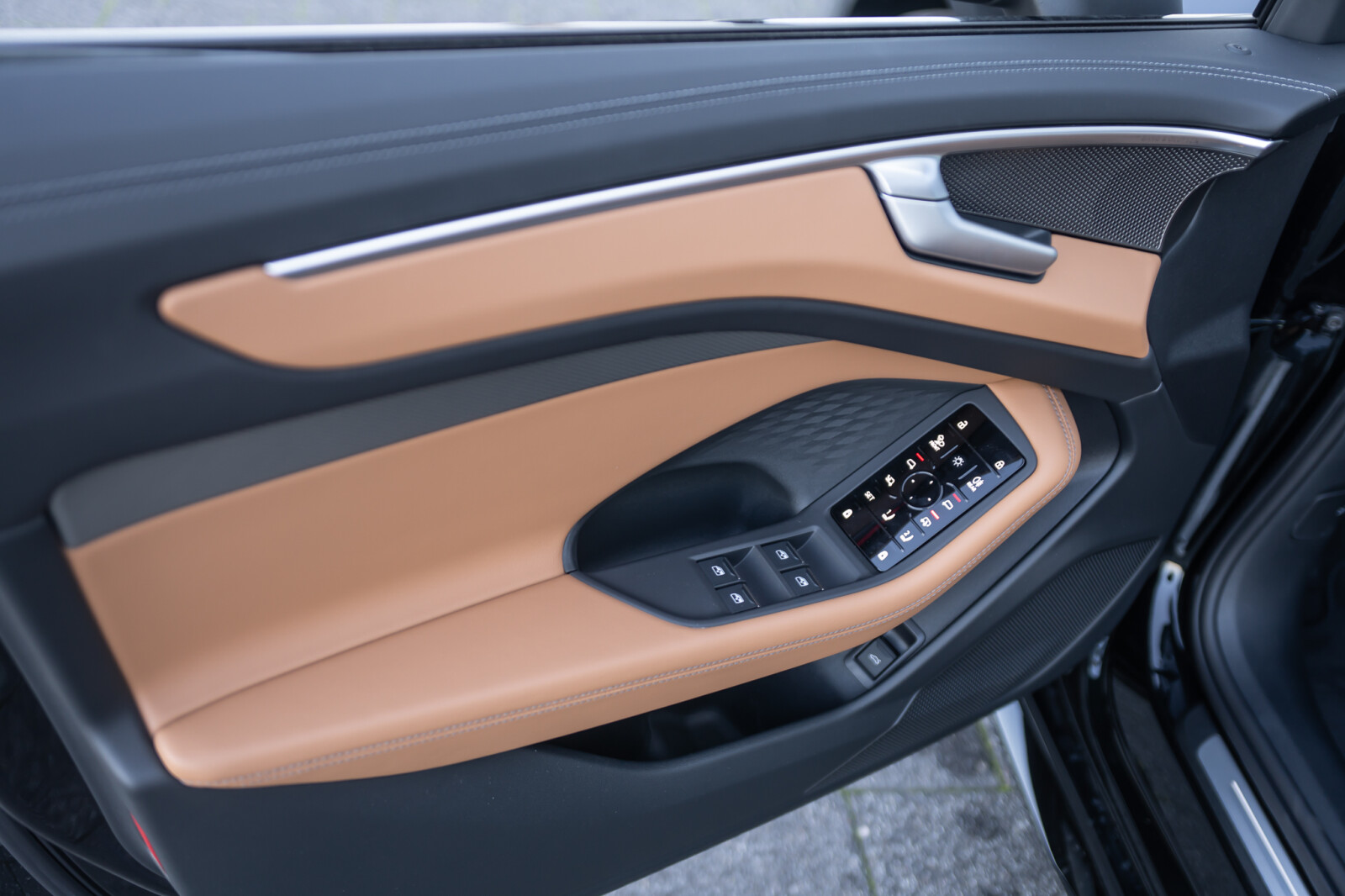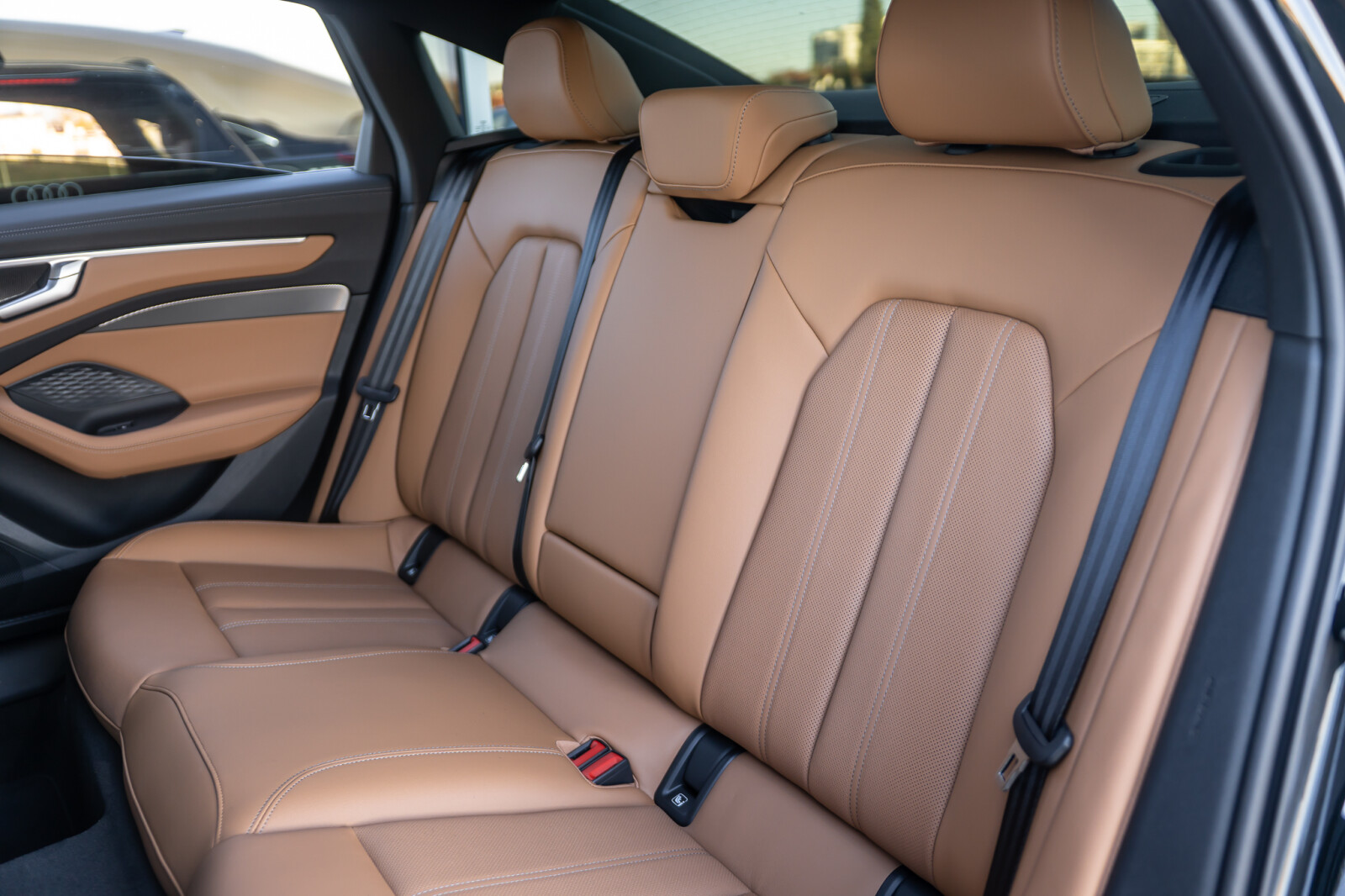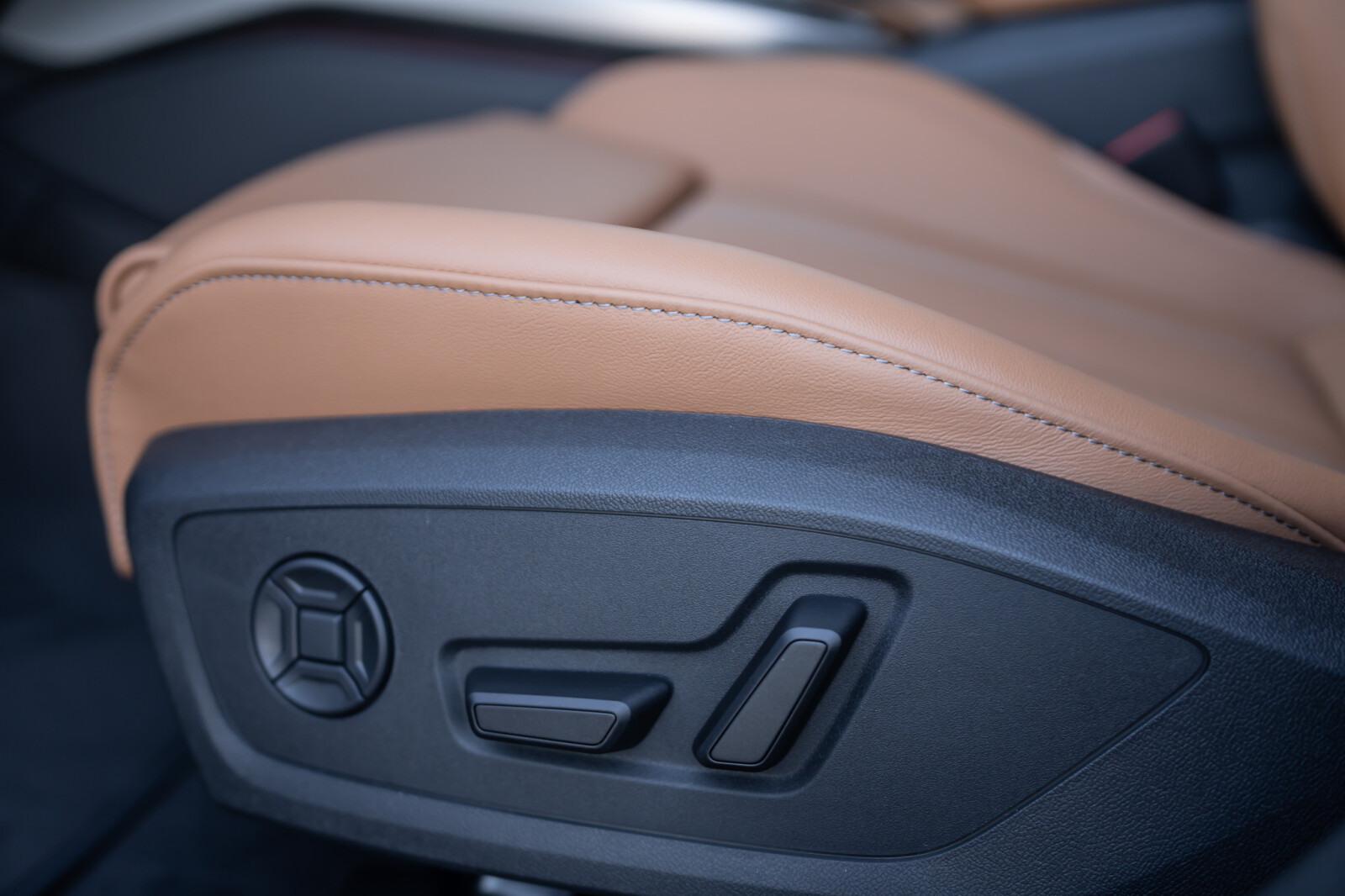 • wentylowane środkowe części przednich siedzeń i niewentylowane środkowe części skrajnych siedzeń tylnych obszyte perforowaną skórą w kolorze brązowym Muskat, boki siedzeń i zagłówki obszyte skórą ekologiczną brązową Muskat, kontrastowy szew (tapicerka tylnych siedzeń dopasowana wizualnie do siedzeń przednich)