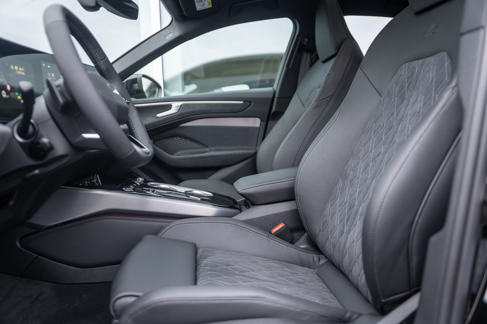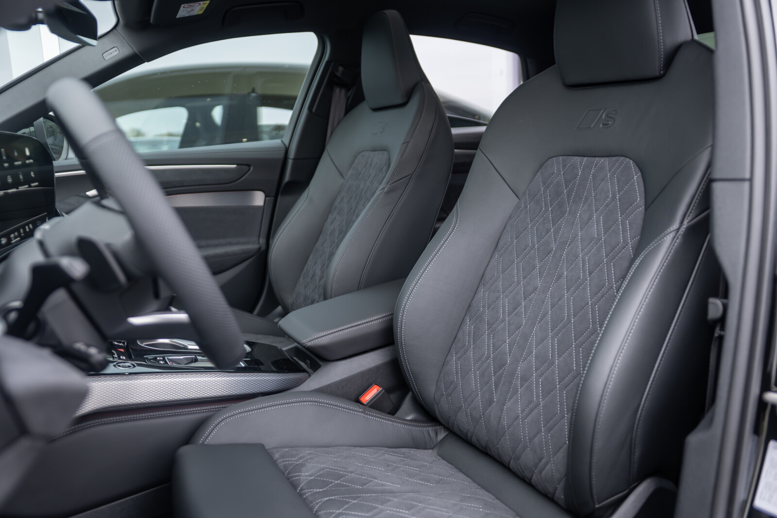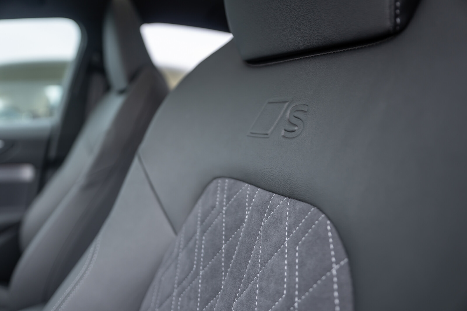 • środkowe części siedzeń obszyte czarną mikrofibrą Dinamica¹ z pikowaniem w romby, boki siedzeń obszyte czarną skórą, zagłówki pokryte czarną skórą ekologiczną, kontrastowy szew, emblematy S na oparciach przednich siedzeń (tapicerka tylnych siedzeń dopasowana wizualnie do siedzeń przednich)