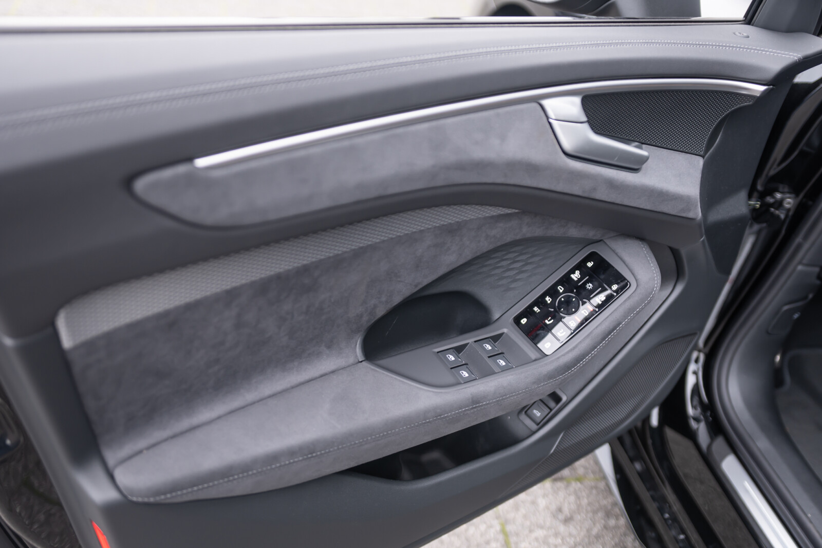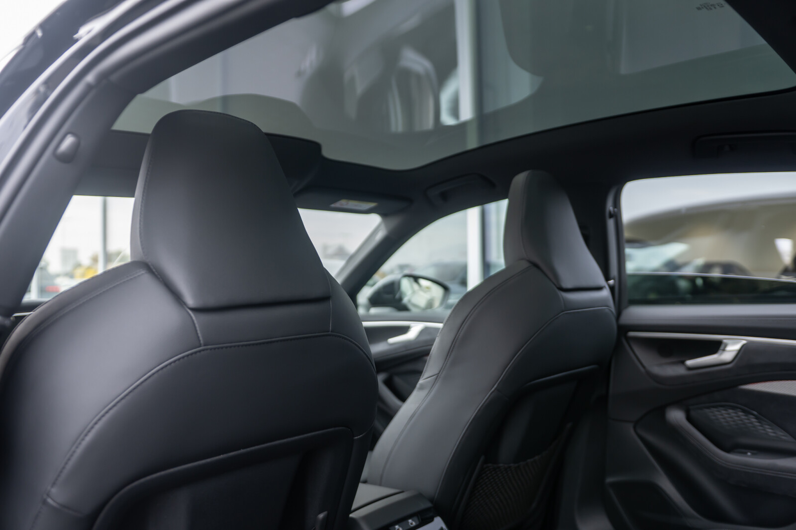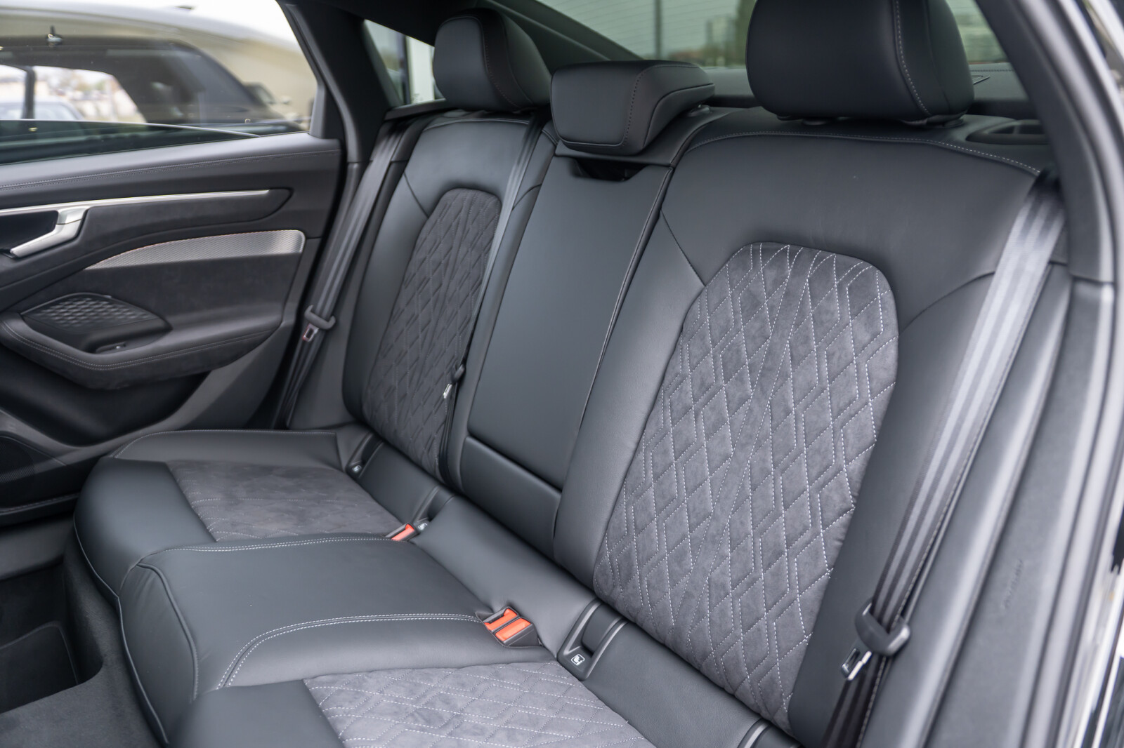 • środkowe części siedzeń obszyte czarną mikrofibrą Dinamica¹ z pikowaniem w romby, boki siedzeń obszyte czarną skórą, zagłówki pokryte czarną skórą ekologiczną, kontrastowy szew, emblematy S na oparciach przednich siedzeń (tapicerka tylnych siedzeń dopasowana wizualnie do siedzeń przednich)