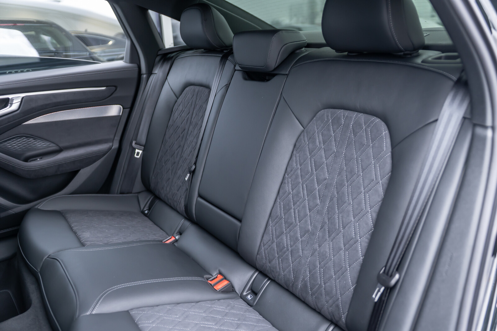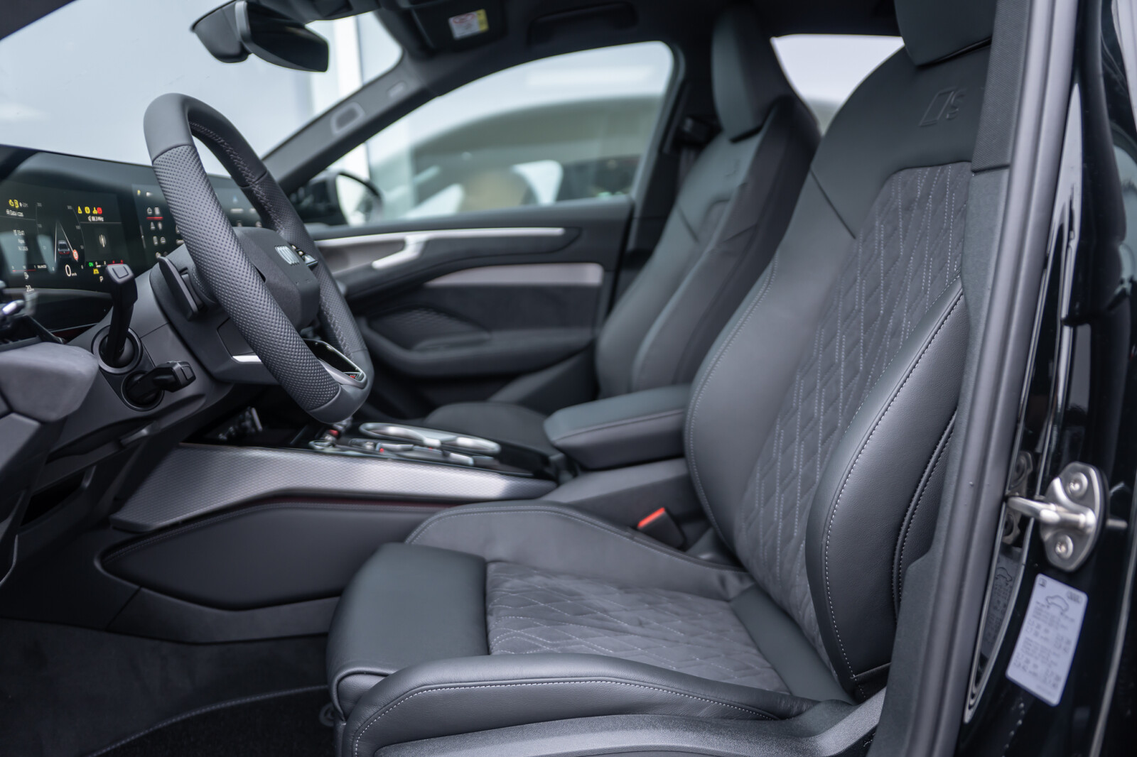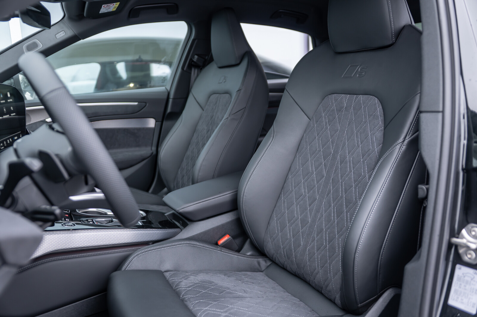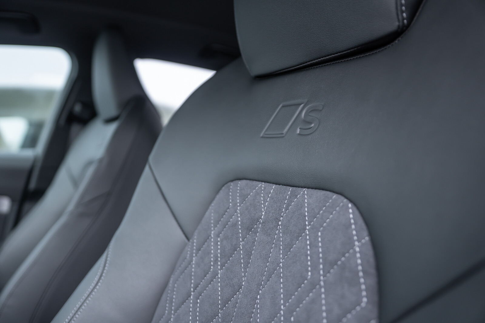 • środkowe części siedzeń obszyte czarną mikrofibrą Dinamica¹ z pikowaniem w romby, boki siedzeń obszyte czarną skórą, zagłówki pokryte czarną skórą ekologiczną, kontrastowy szew, emblematy S na oparciach przednich siedzeń (tapicerka tylnych siedzeń dopasowana wizualnie do siedzeń przednich)