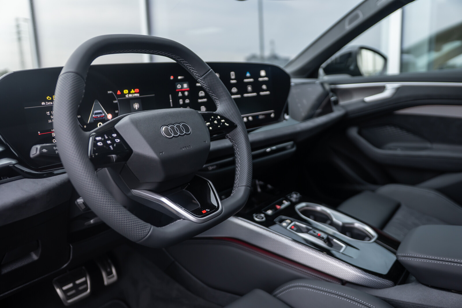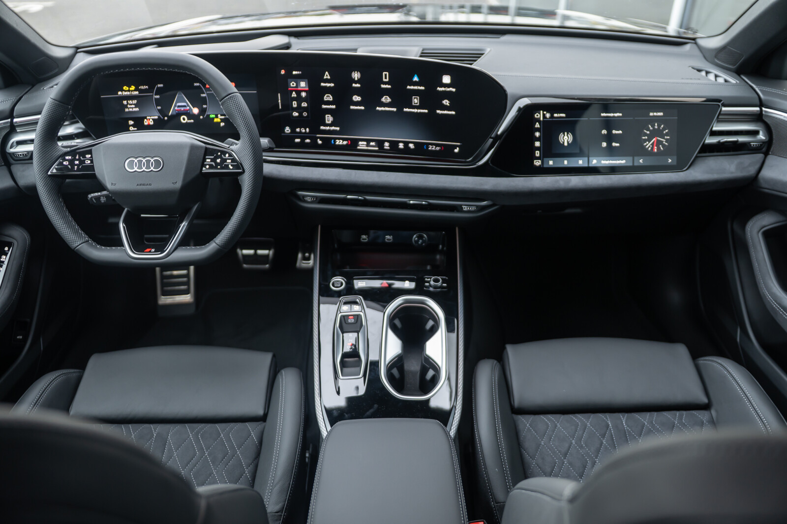 • sportowa 3-ramienna kierownica wielofunkcyjna, obszyta skórą, spłaszczona u dołu i na górze, z przyciskami zmiany przełożenia, aplikacjami w optyce chromu i emblematem S