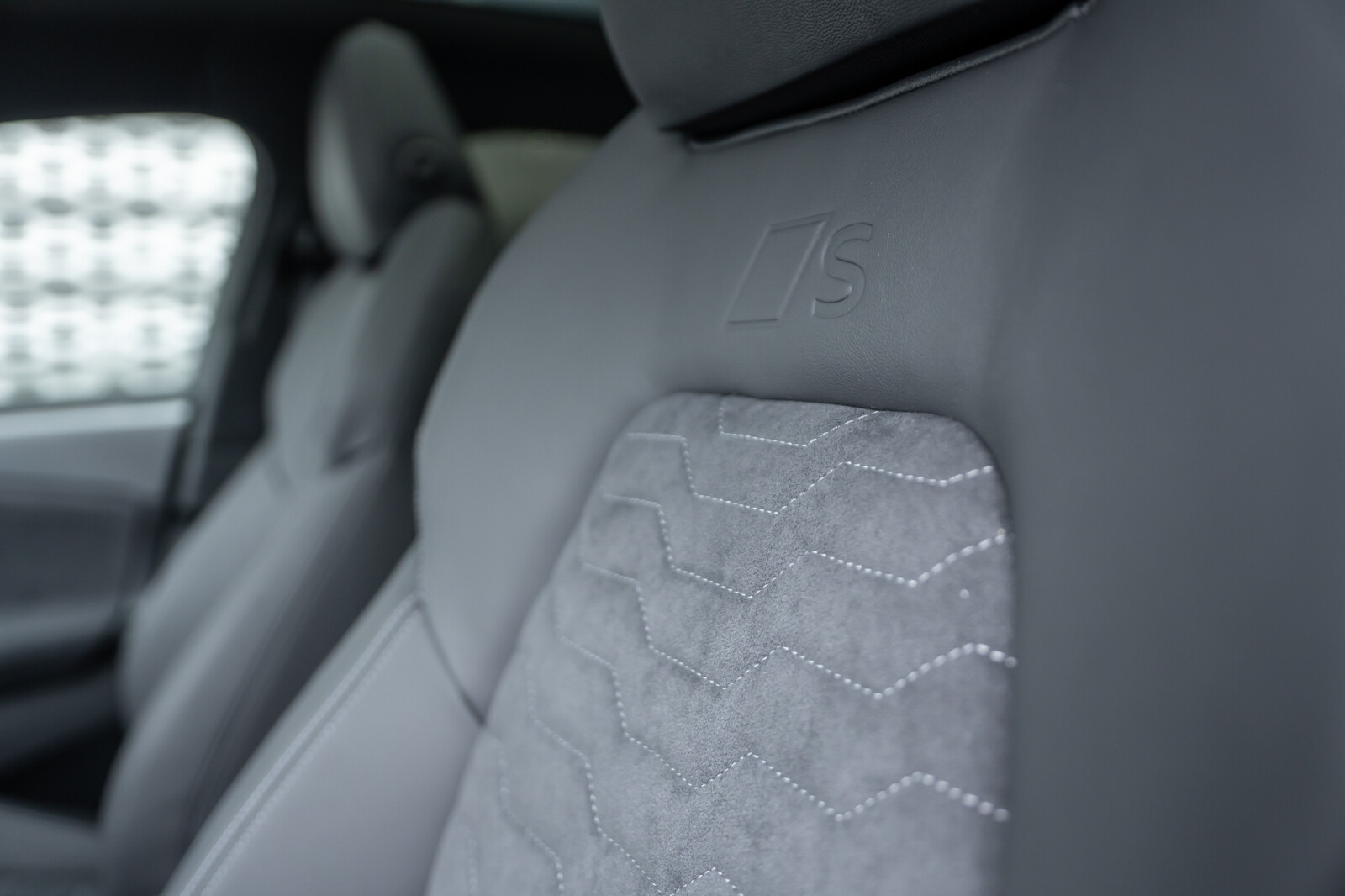 • środkowe części siedzeń obszyte mikrofibrą Dinamica¹ w kolorze czarnym z pikowaniem we wzór spływającej wody, boki siedzeń i zagłówki obszyte skórą w kolorze czarnym, kontrastowy szew i wytłoczone logo S na oparciach przednich siedzeń (tapicerka tylnych siedzeń dopasowana wizualnie do przednich)
