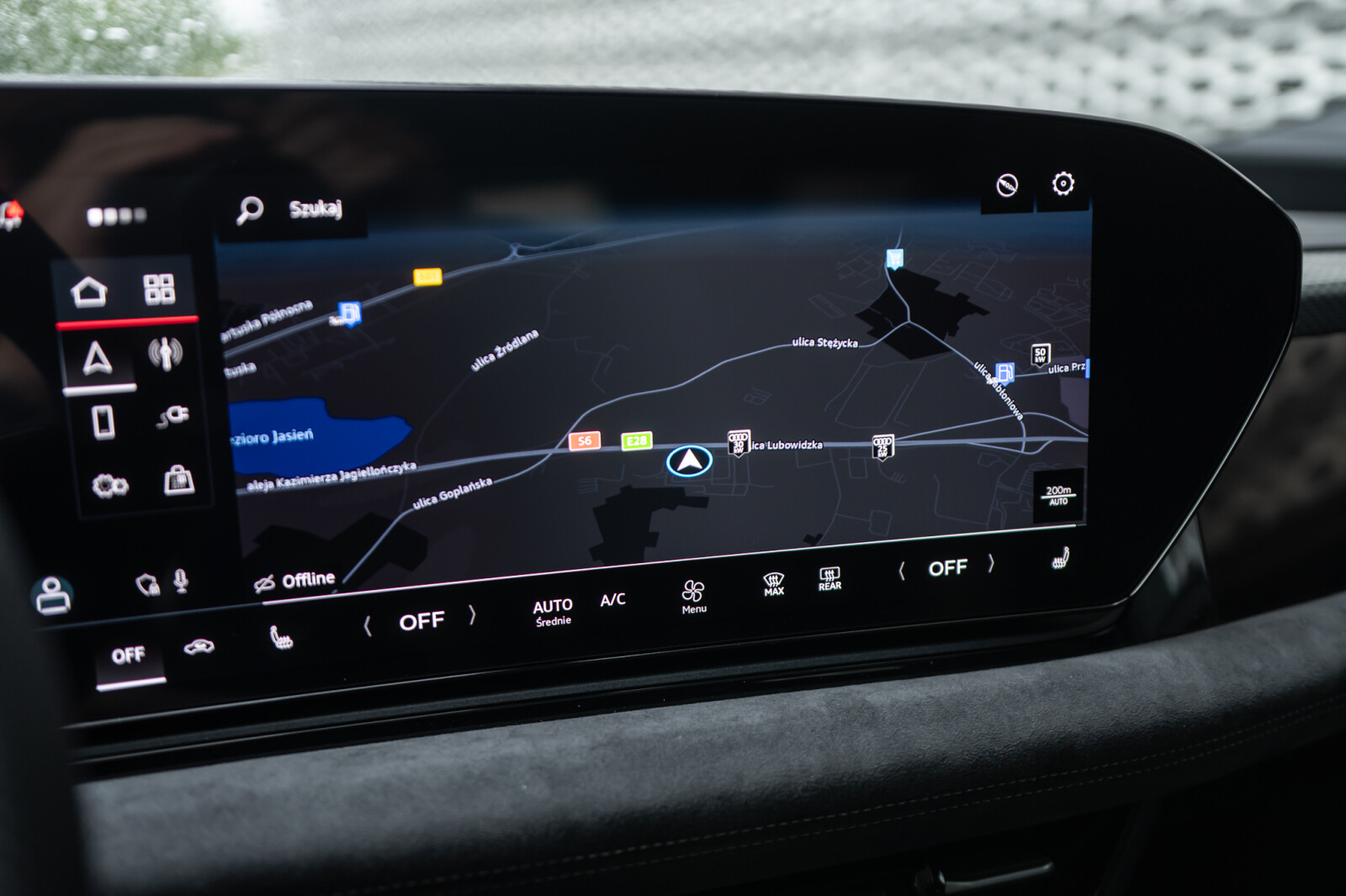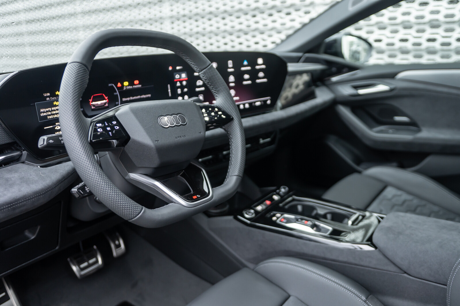 • kierownica sportowa, 3-ramienna, obszyta skórą, spłaszczona na dole i na górze, wielofunkcyjna, z przełącznikami zmiany stopnia rekuperacji oraz aplikacjami w optyce chromu, emblematem S i kontrastowym szwem, prawy i lewy segment perforowany