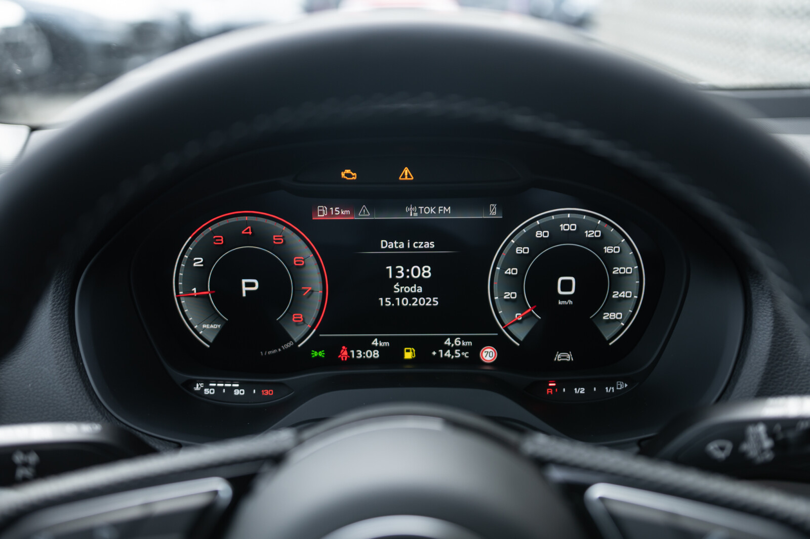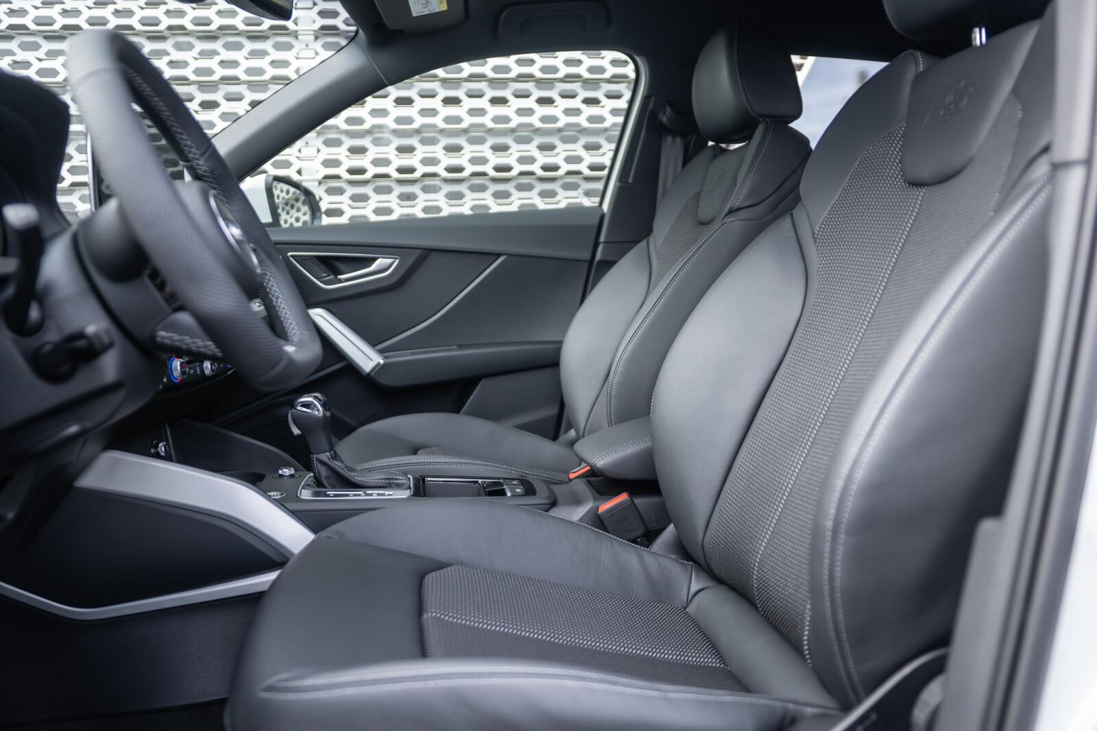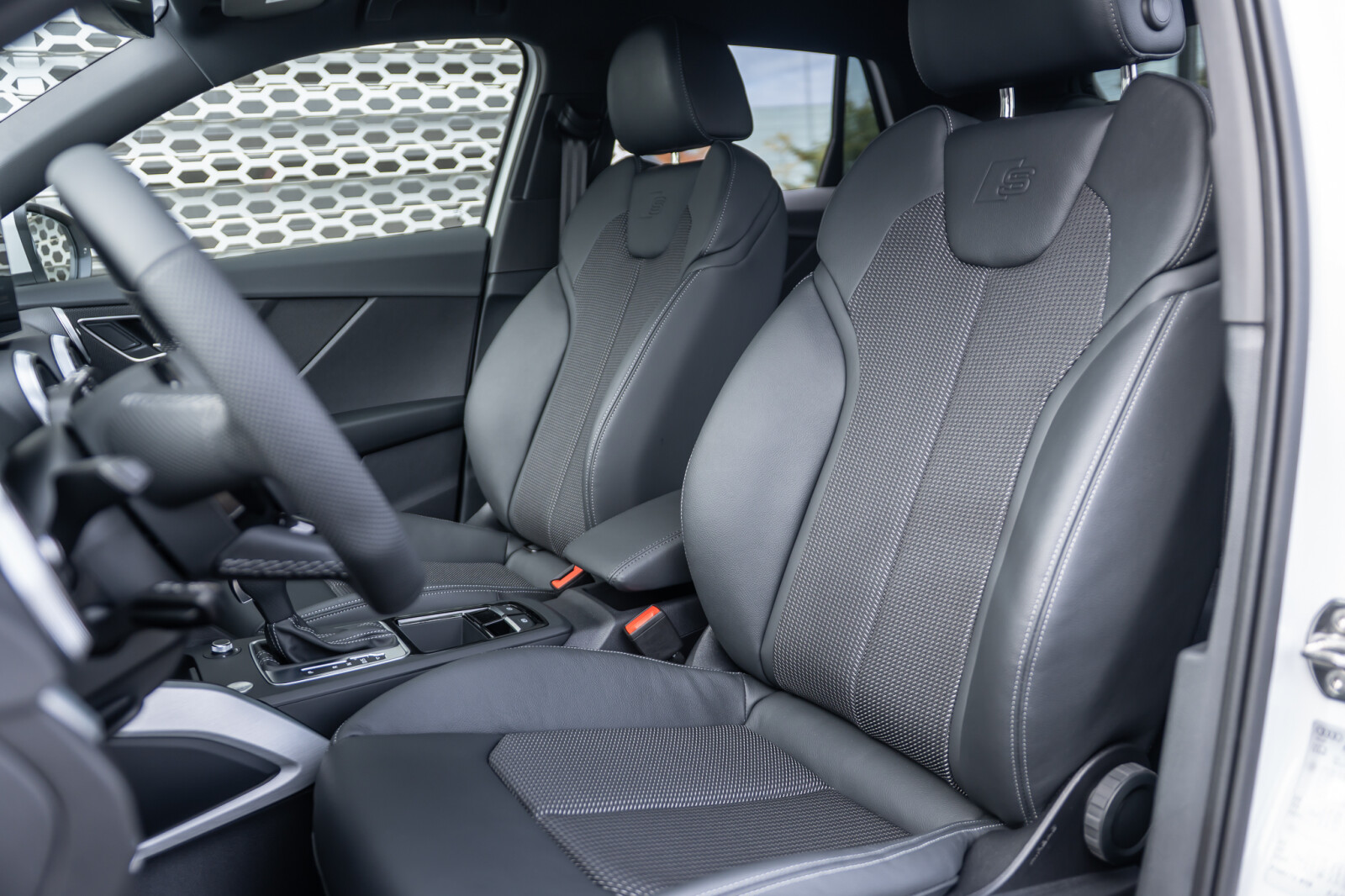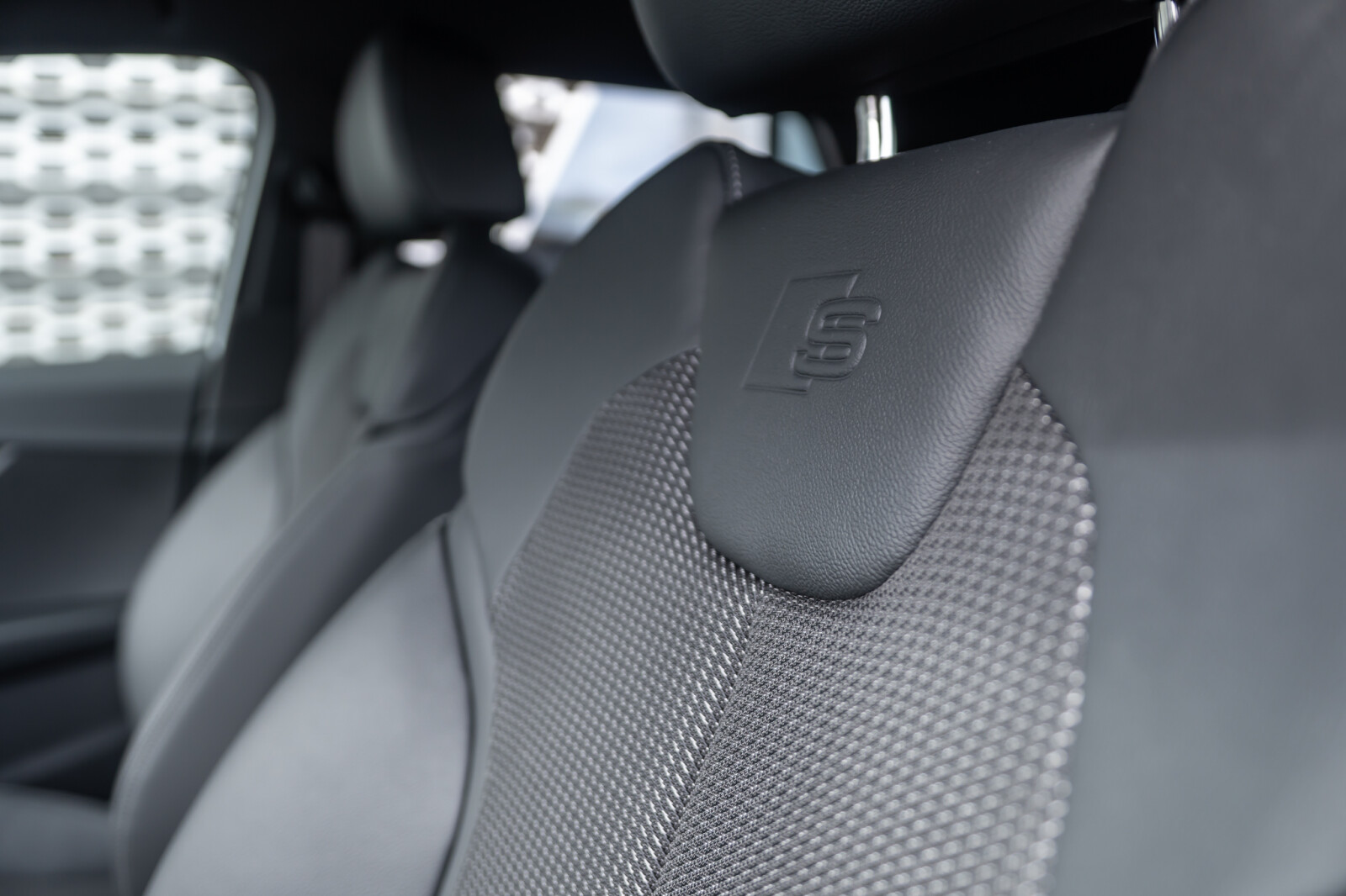 – Wnętrze S line z siedzeniami sportowymi obszytymi kombinacją tkanina/skóra w kolorze czarnym/szarym