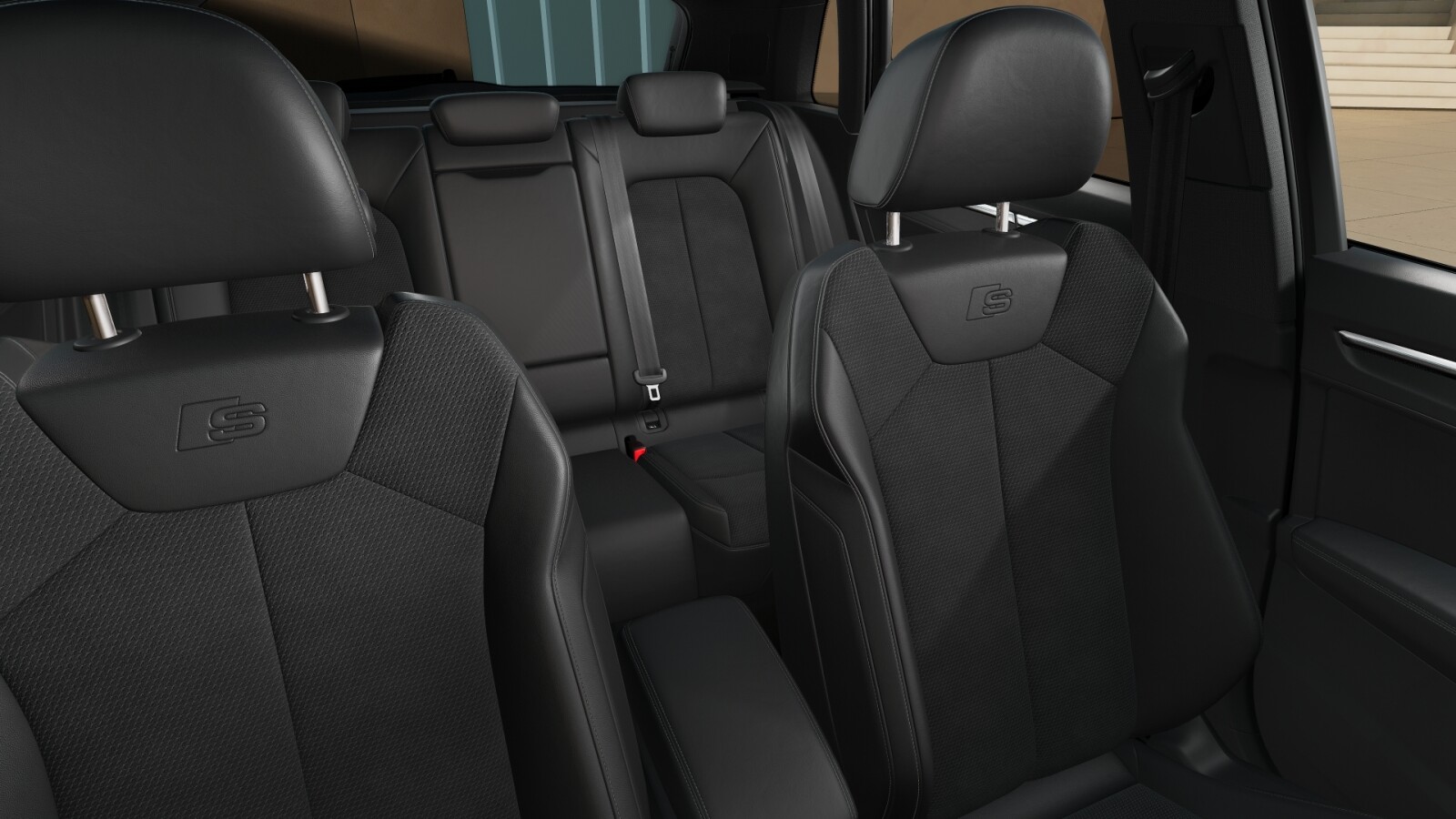 • Sportowe siedzenia z tapicerką z tkaniny Dinamica®/skóra ekologiczna mono.pur 550 S line i z logo S line na oparciach przednich siedzeń