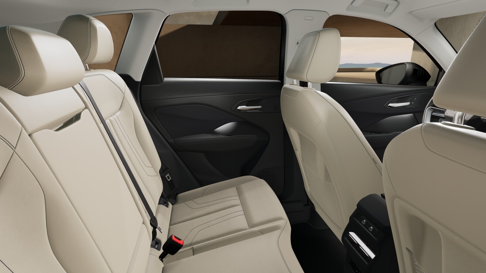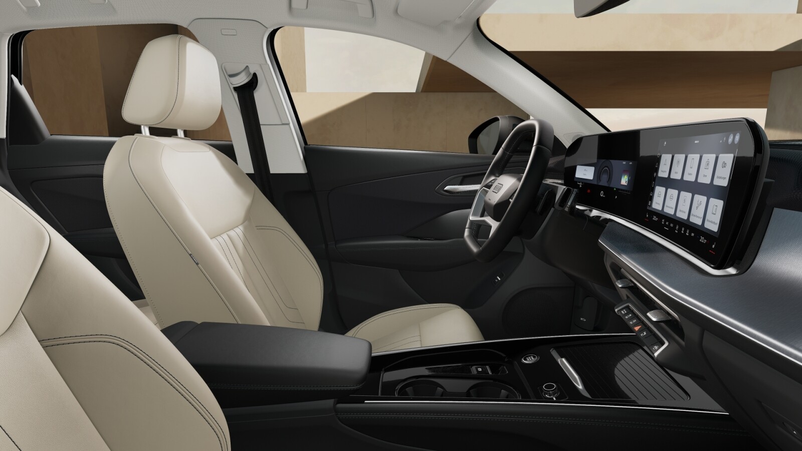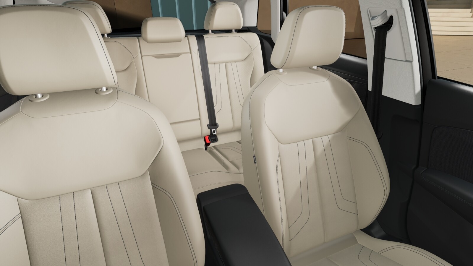 • środkowe części przednich siedzeń i skrajnych siedzeń tylnych obszyte skórą w kolorze beżowym Pergament, boki siedzeń i zagłówki obszyte skórą ekologiczną w kolorze beżowym Pergament; kontrastowy szew