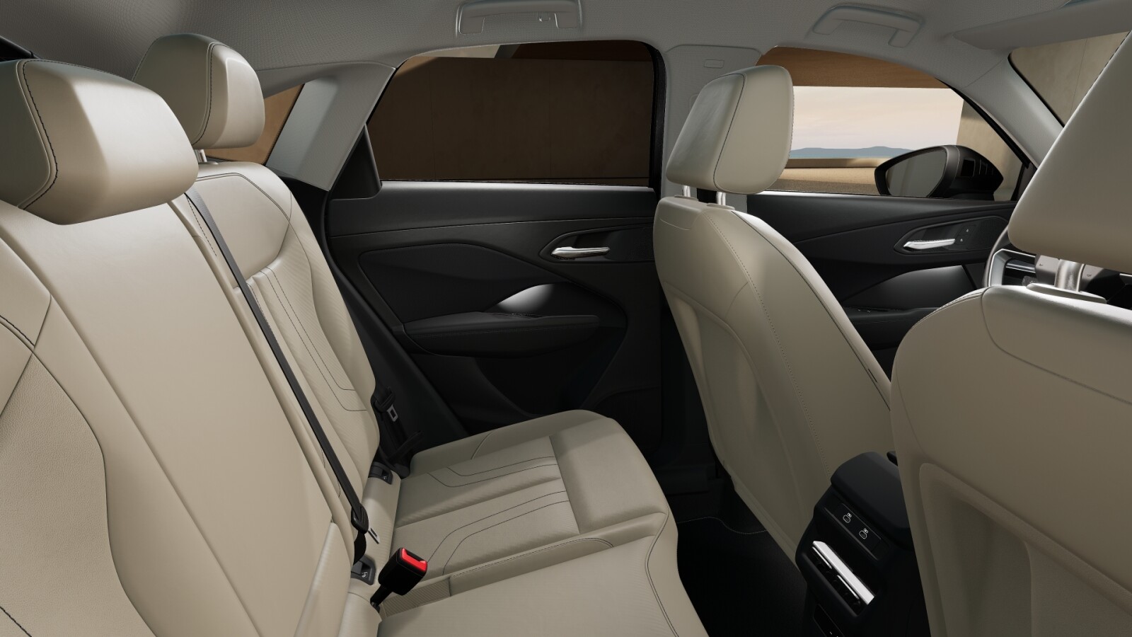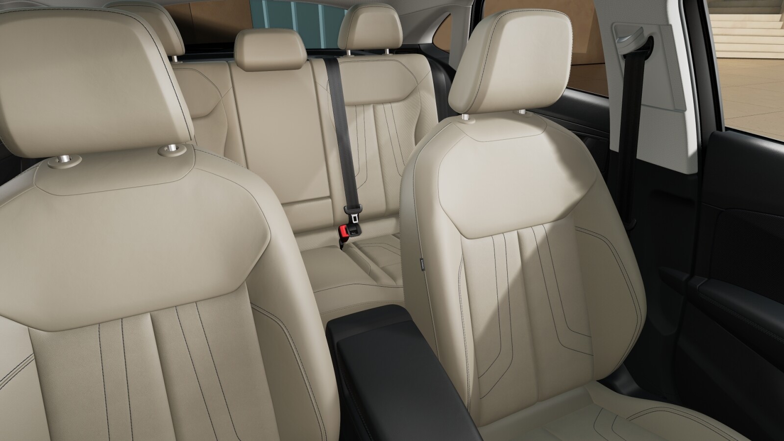 • środkowe części przednich siedzeń i skrajnych siedzeń tylnych obszyte skórą w kolorze beżowym Pergament, boki siedzeń i zagłówki obszyte skórą ekologiczną w kolorze beżowym Pergament; kontrastowy szew