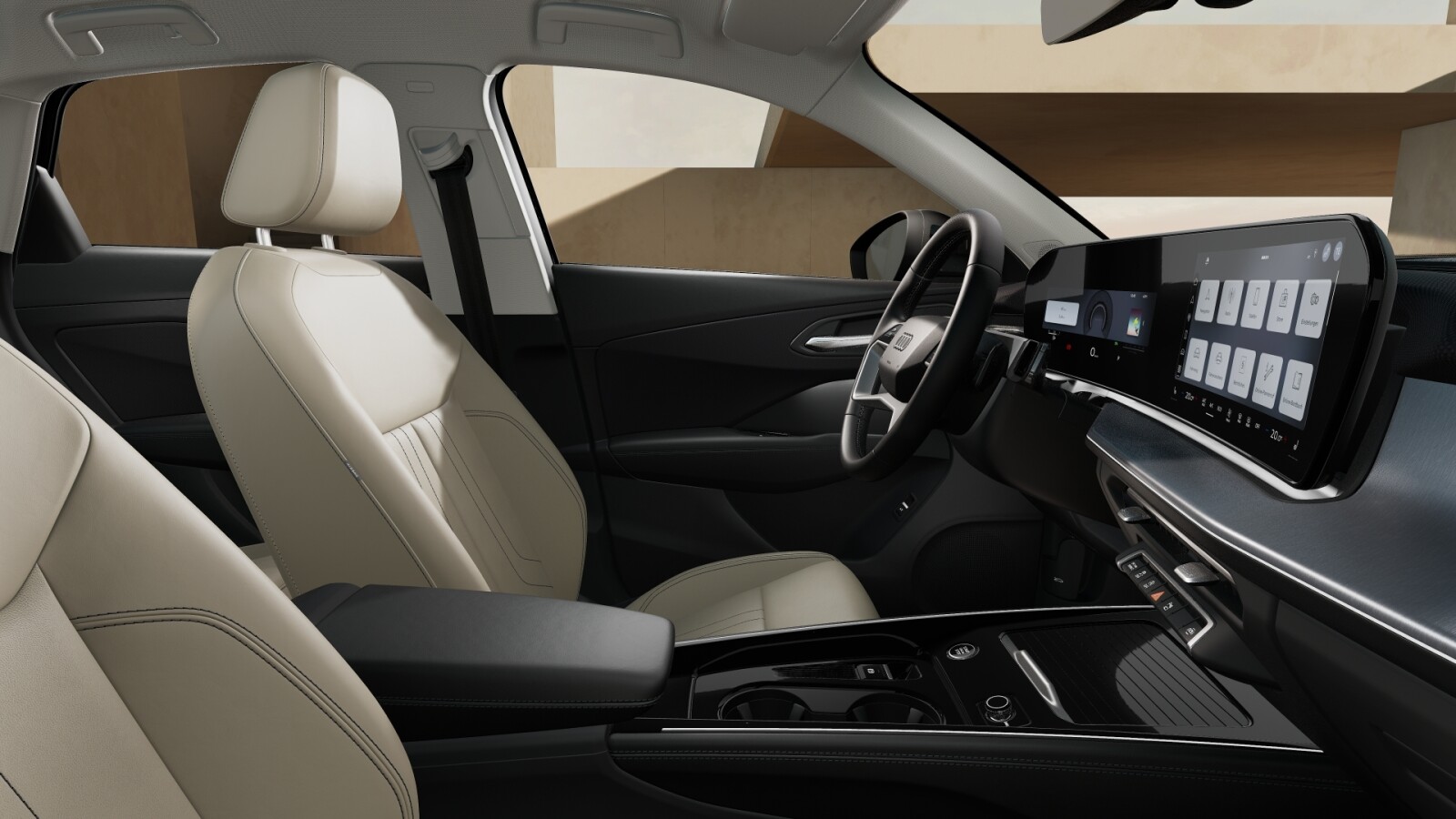• środkowe części przednich siedzeń i skrajnych siedzeń tylnych obszyte skórą w kolorze beżowym Pergament, boki siedzeń i zagłówki obszyte skórą ekologiczną w kolorze beżowym Pergament; kontrastowy szew