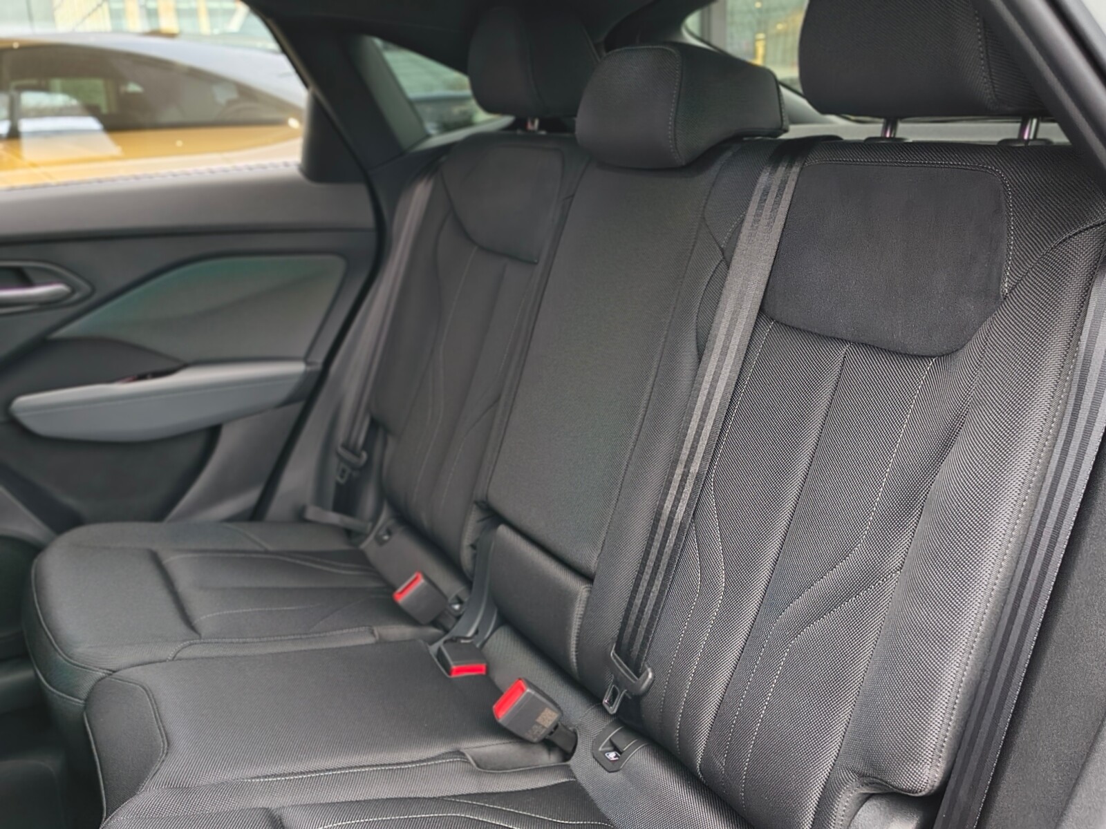 • środkowe części siedzeń, wewnętrzne części boków siedzeń i zagłówki obszyte tkaniną Impressum w kolorze czarnym, górna część oparć siedzeń obszyta czarną mikrofibrą; kontrastowy szew