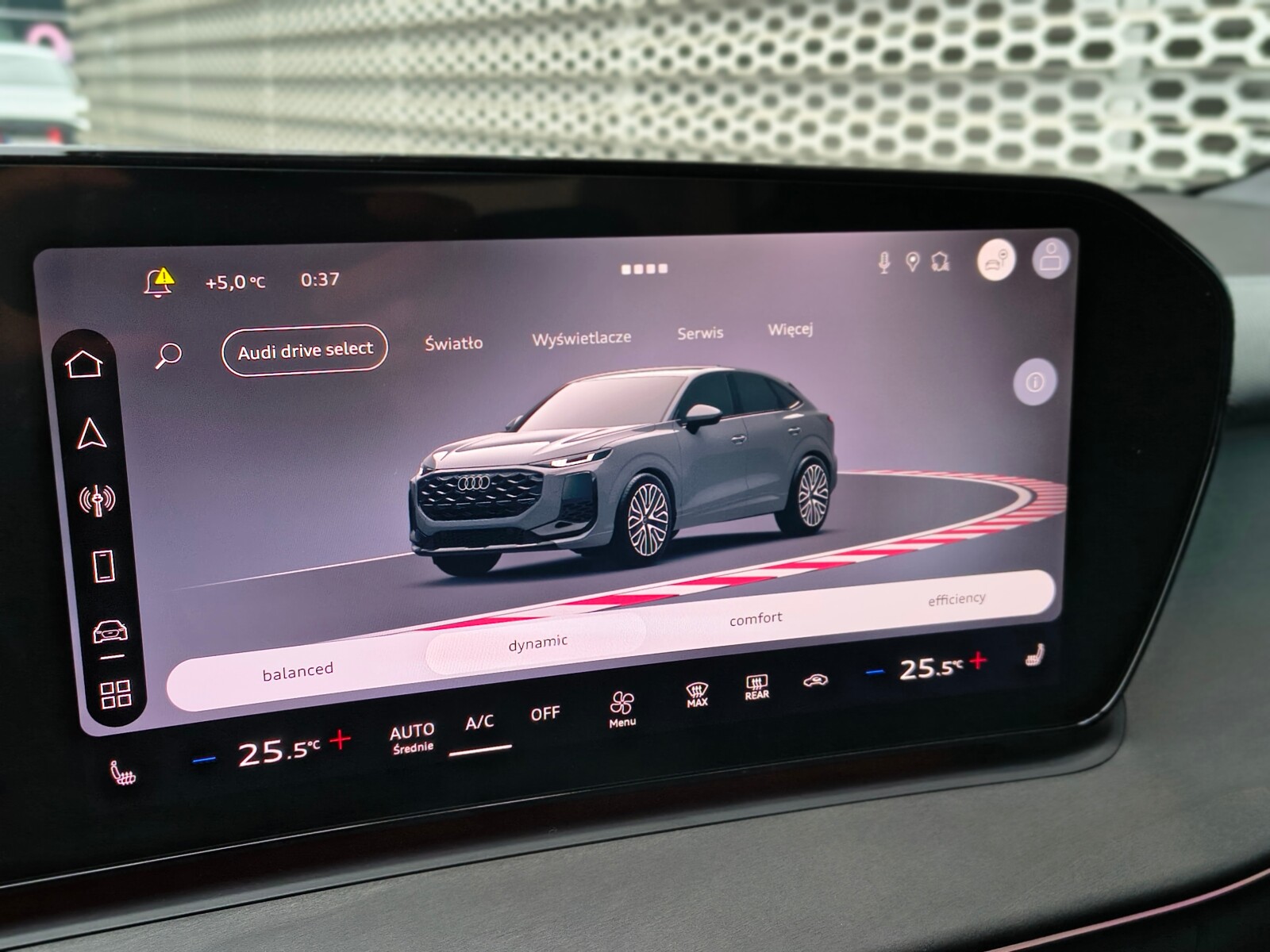 – Obręcze kół ze stopu metali lekkich Audi Sport 8.5Jx20″, 5 – ramienne, kontrastowo-czarne matowe, polerowane, z oponami 255/40 R 20. 3-letnie ubezpieczenie opon w cenie.