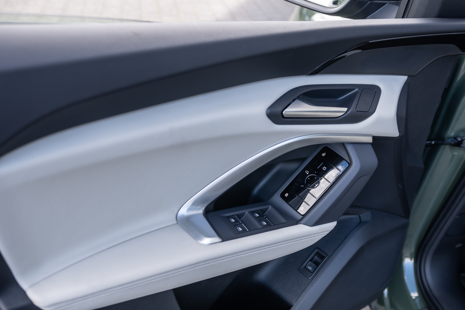 • górne i dolne elementy wnętrza pokryte skórą ekologiczną: elementy dekoracyjne na tablicy rozdzielczej oraz w drzwiach i podłokietnikach w drzwiach pokryte skórą ekologiczną, podłokietniki w drzwiach z kontrastowym szwem, elementy na konsoli środkowej na wysokości kolan pokryte skórą ekologiczną z kontrastowym szwem; skóra ekologiczna dopasowana do kolorystyki wnętrza