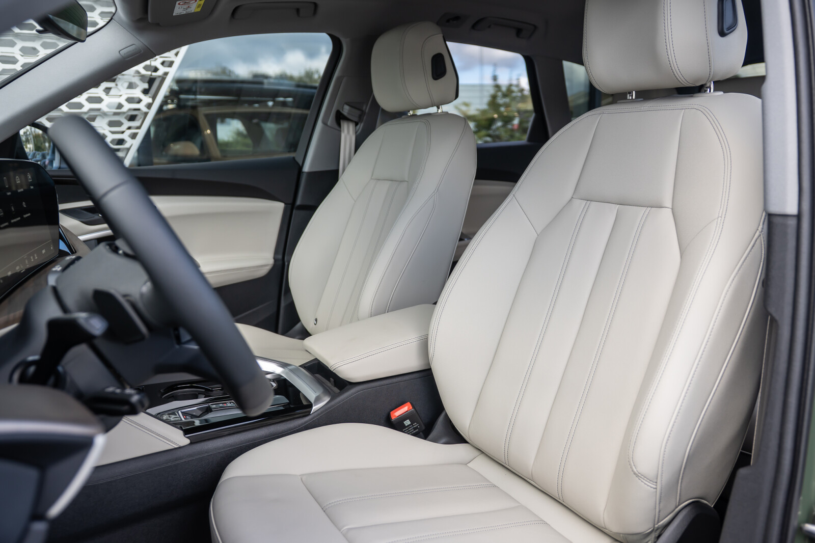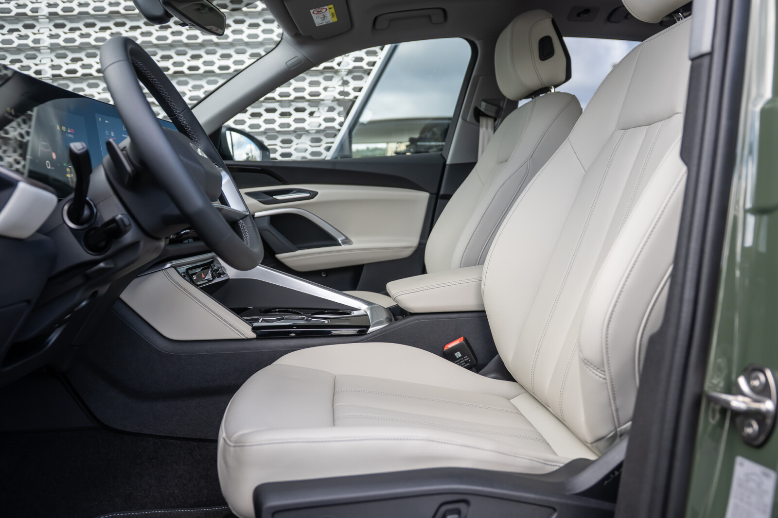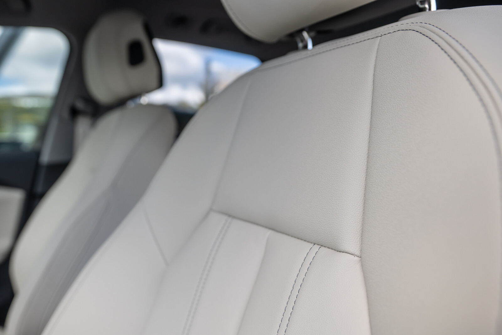 • środkowe części siedzeń obszyte skórą w kolorze beżowym Perlmutt, boki siedzeń i zagłówki obszyte skórą ekologiczną beżową Perlmutt; kontrastowy szew (tapicerka tylnych siedzeń dopasowana optycznie do siedzeń przednich)
