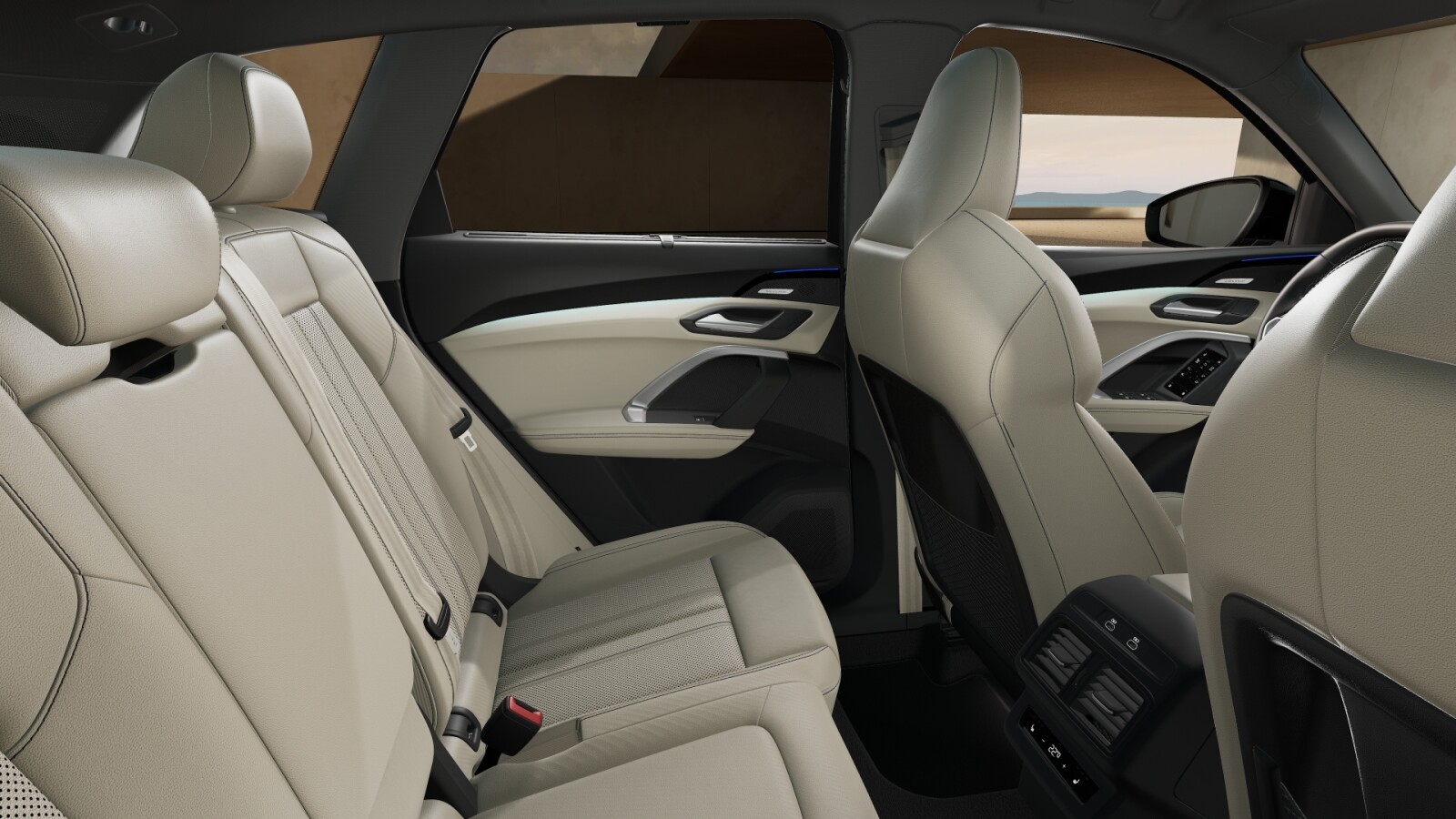 • wentylowana środkowa część przednich siedzeń i niewentylowana środkowa część skrajnych siedzeń z tyłu obszyta perforowaną skórą w kolorze beżowym Perlmutt, boki siedzeń i zagłówki obszyte skórą ekologiczną w kolorze beżowym Perlmutt, boki i zagłówki tylnych siedzeń obszyte skórą ekologiczną beżową Perlmutt; kontrastowy szew