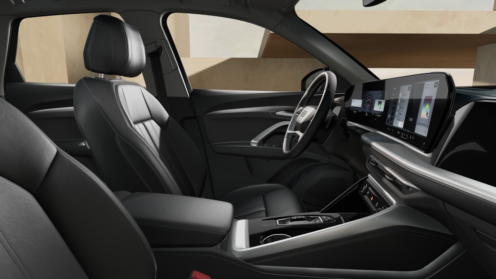 • środkowe części siedzeń obszyte czarną skórą, boki siedzeń i zagłówki obszyte czarną skórą ekologiczną; kontrastowy szew (tapicerka tylnych siedzeń dopasowana optycznie do siedzeń przednich)